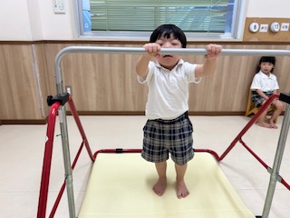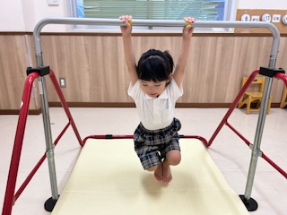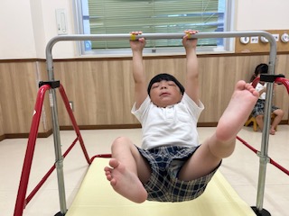 くまグループでは、筋力の向上を目的とした、鉄棒遊びを行いました。 まずは、鉄棒の握り方から練習しました! 前回、鉄棒をしたことを思い出しながら、親指を内側に入れて、ぎゅっと握ることができていました。 握り方の練習をした後は、両足を上げて、鉄棒にぶら下がりました。 職員が力の入れ方を丁寧に伝えることで、握り方を意識しながらぶら下がることができました! 5秒間ぶら下がることを目標にしていましたが、7秒以上ぶら下がることができ、 顔を真っ赤にしながらも、何度もチャレンジするくまグループさんでした♪
