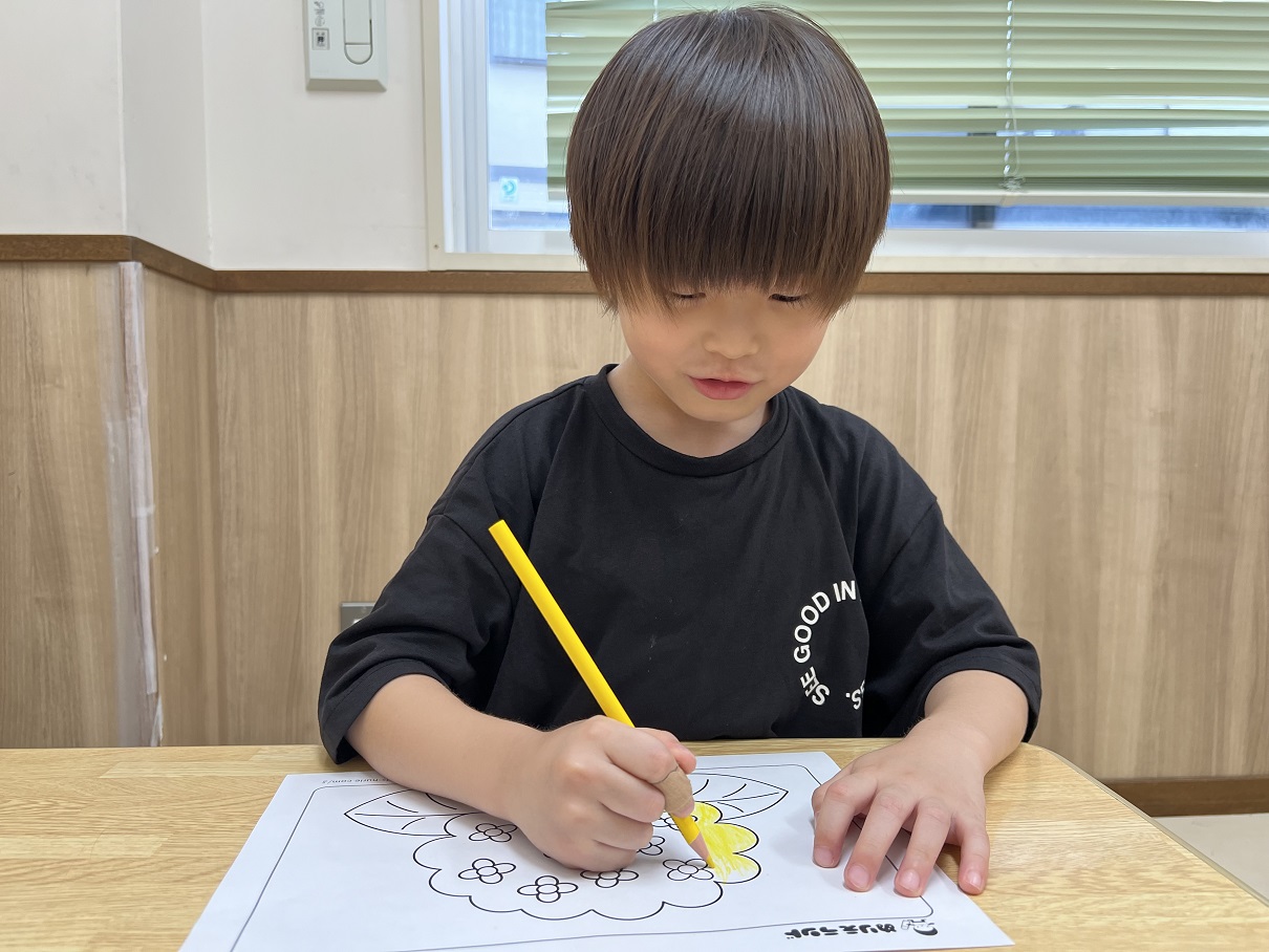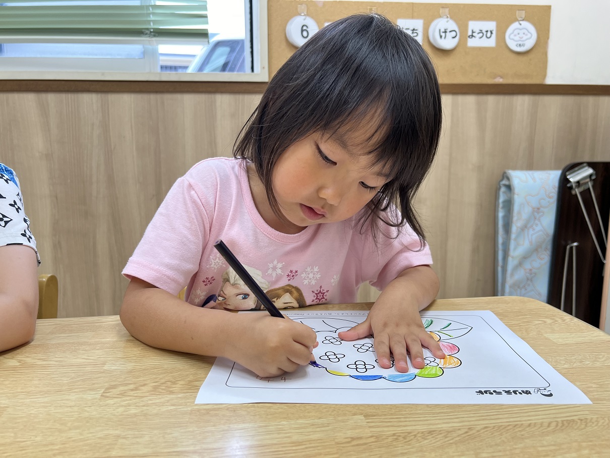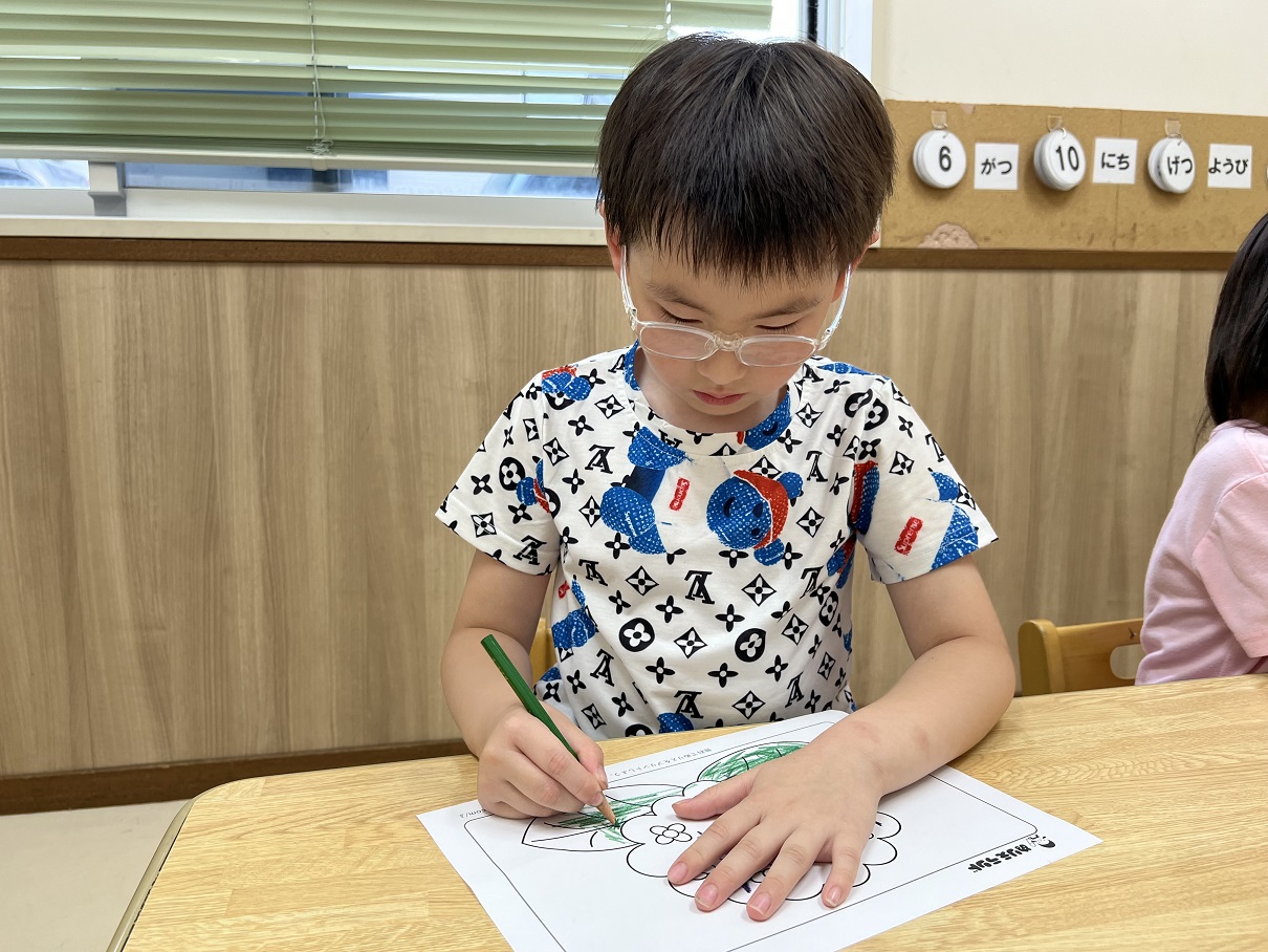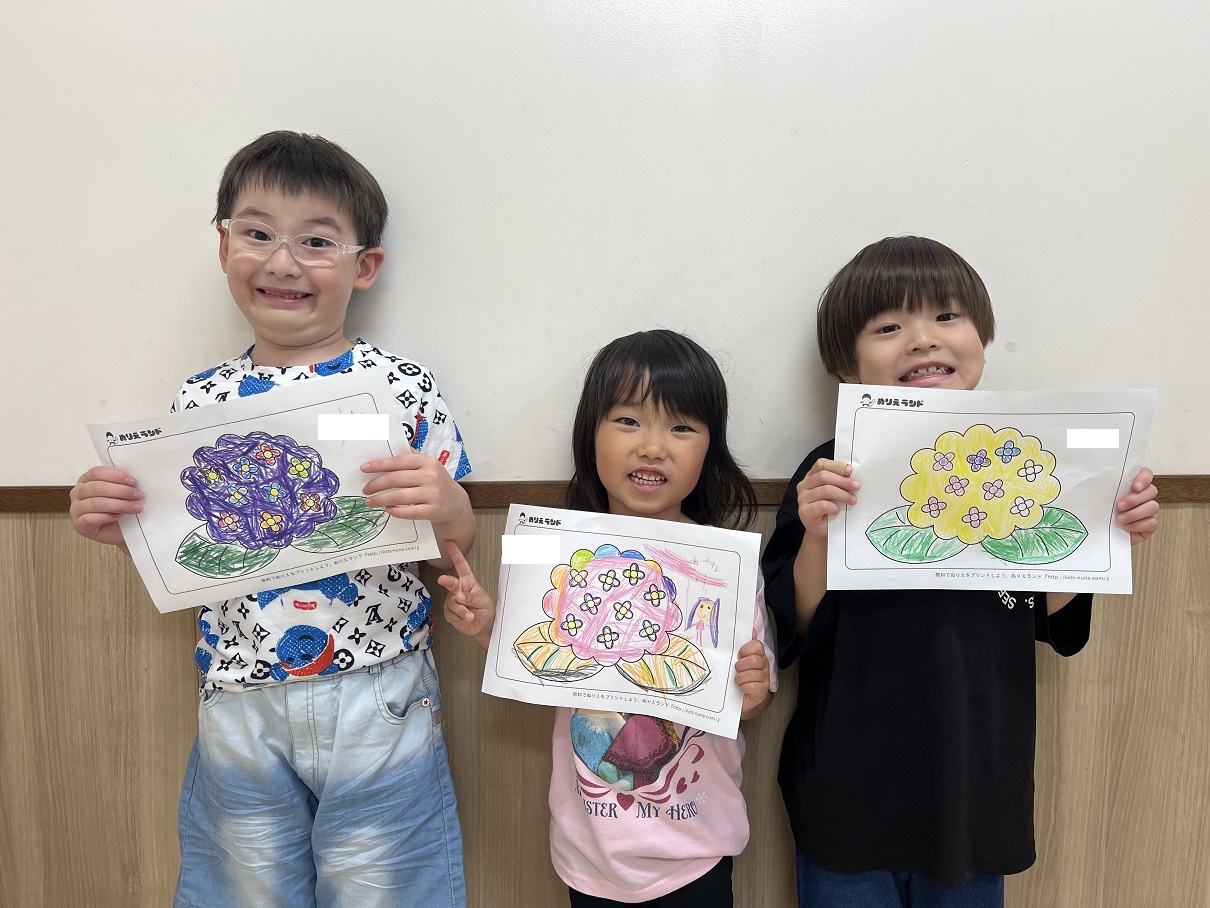 6月に入り、梅雨の季節がやってきました! とら②・ぞう②グループさんでは、梅雨にちなんで、紫陽花の塗り絵に取り組みましたよ。 紫陽花と聞くと、「知ってる!きらら館の近くにもあるよね♪」 「お家にも咲いてるよ☆」との声が聞かれ、色や形のイメージを膨らます子ども達! 以前よりも、枠線からはみ出ないように丁寧に塗っていく姿も見られました。 時間いっぱい取り組み、オリジナルの紫陽花を咲かせたとら②・ぞう②グループさんでしたよ☆
