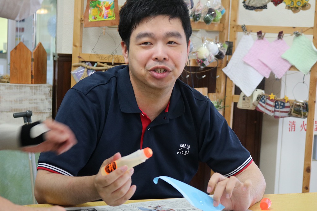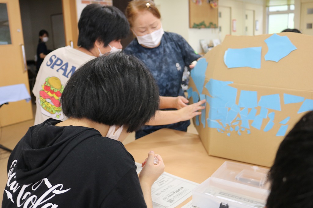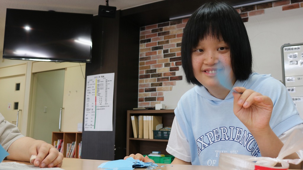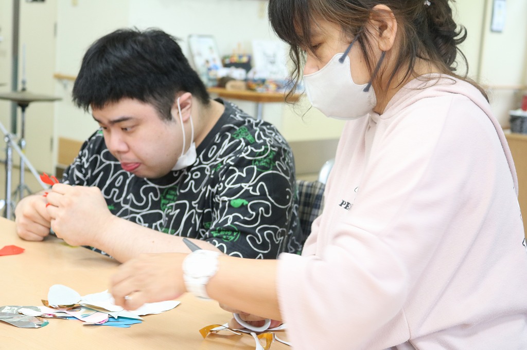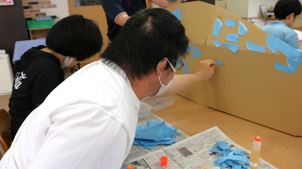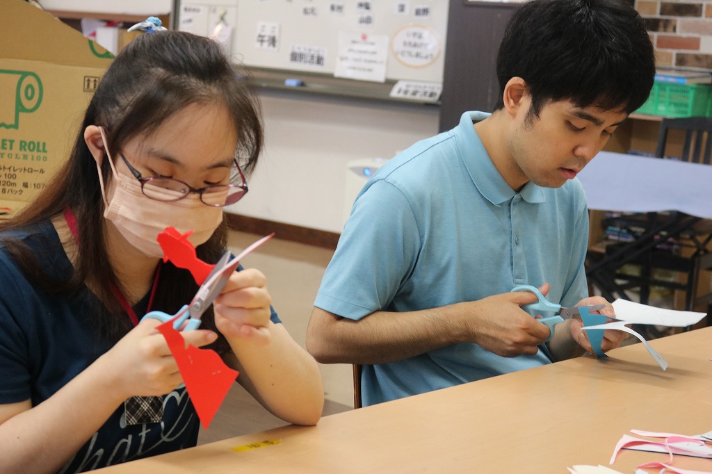 7月末に開催予定の「夏祭り」に向けた準備が始まっています。 今回は2班に分かれ、ハサミを使って折り紙を金魚や花火の形に切り抜くチームと、 手でランダムにちぎった色画用紙を、段ボールの土台に糊付けするチームで作業しました。 皆さん、それぞれ得意な作業に時間いっぱい取り組んでくれました。 また次回も楽しく準備していきましょう。