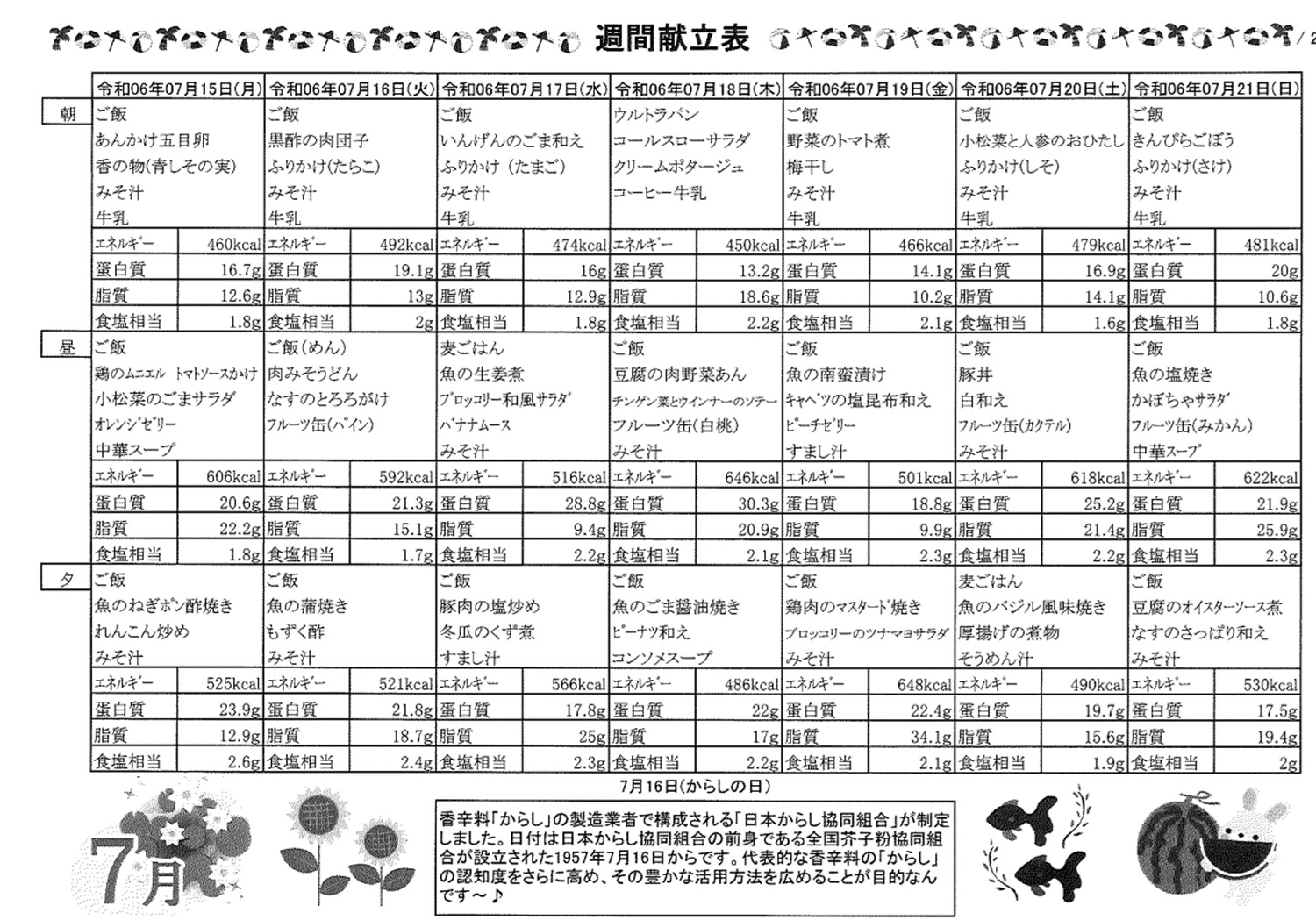 7月15日(月)~7月21日(日)の献立表になります。ぜひご覧ください。