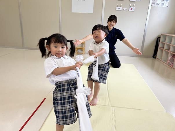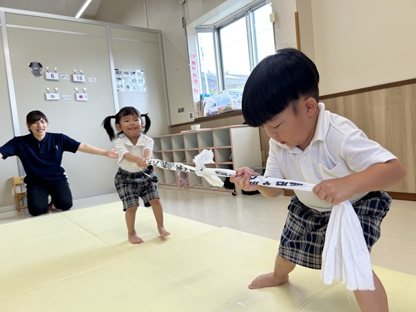 綱引きに挑戦しました! 今回は、綱ではなく、手拭いタオルを繋ぎ合わせたもので綱引きをしました。 初めは、職員と向かい合って、握り方や足の踏ん張り方の練習し、 両足で踏ん張って、力を込めながら引っ張る姿が見られました。 お友だちや職員と勝負する際は、「負けないぞ~!」と張り切って、 最後まで諦めず引っ張ることができました。 勝った時は、「やったー!」と言いながら、お友だちとハイタッチ! 今回も笑顔いっぱいのくまグループさんでした☆
