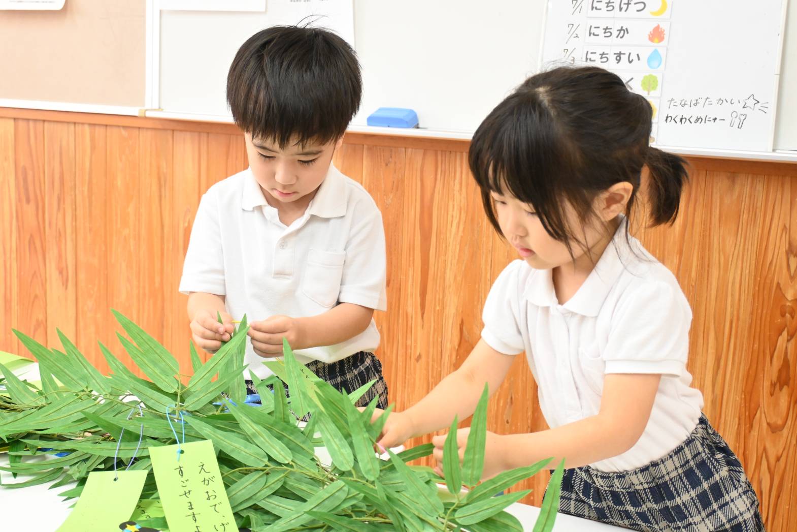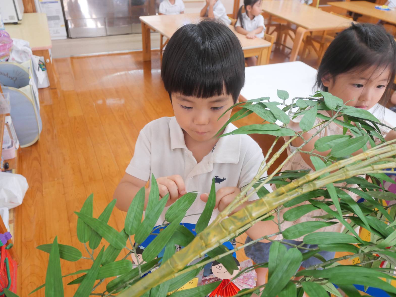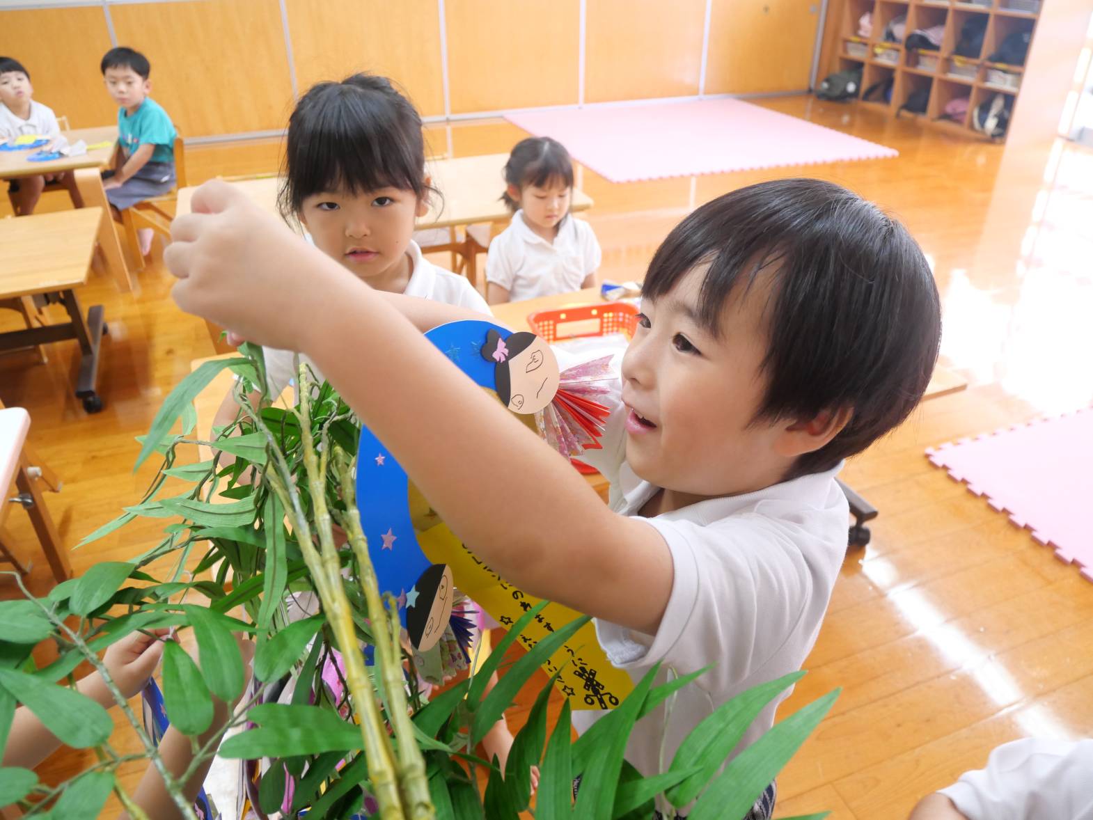 「お願いが叶いますように!」、「空から見えるように上に飾りたいな。」と製作の飾りつけを楽しむ大きい組さんでした。