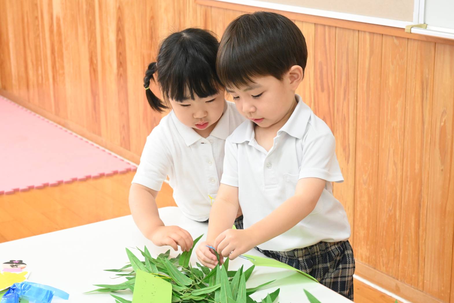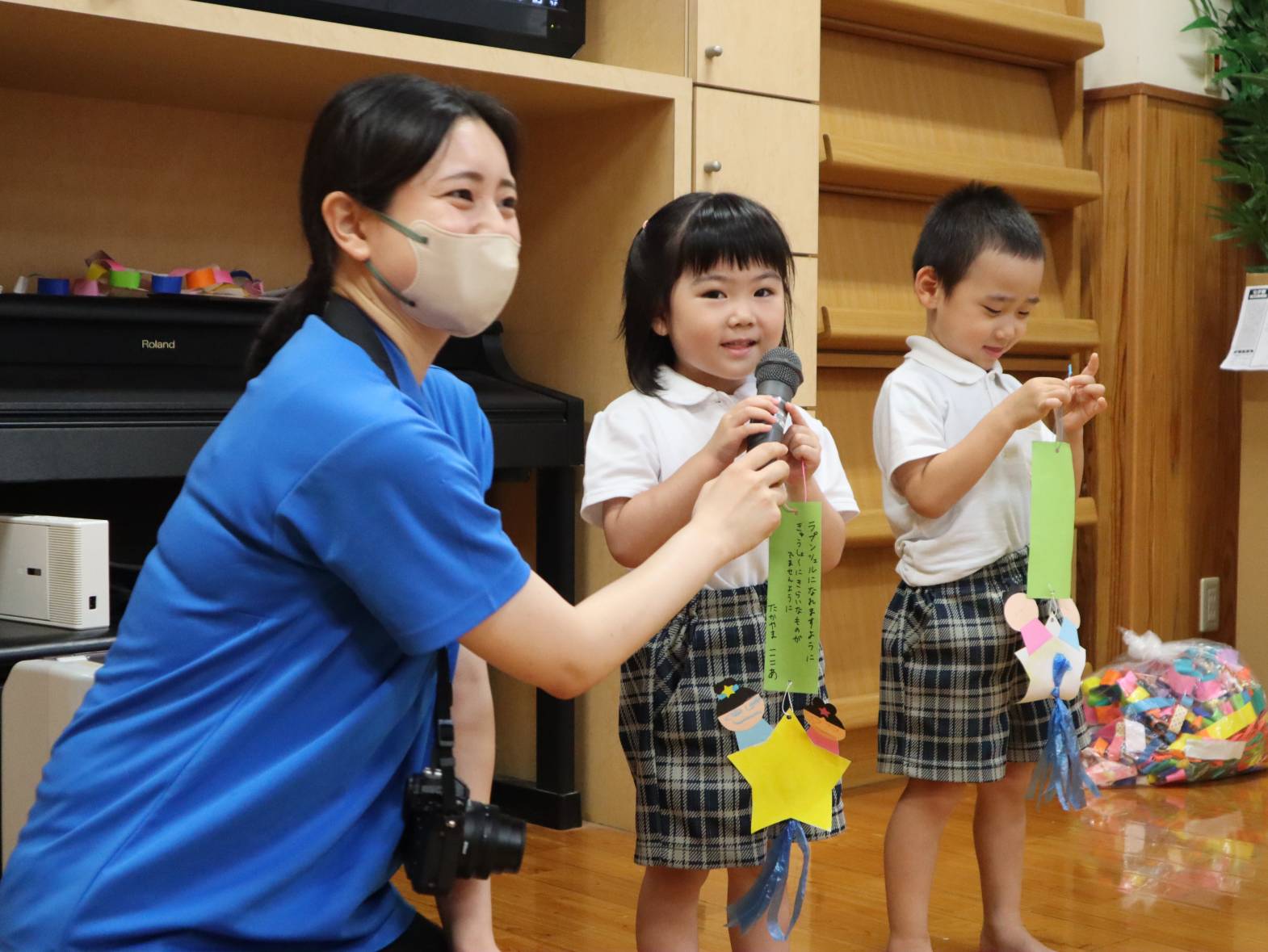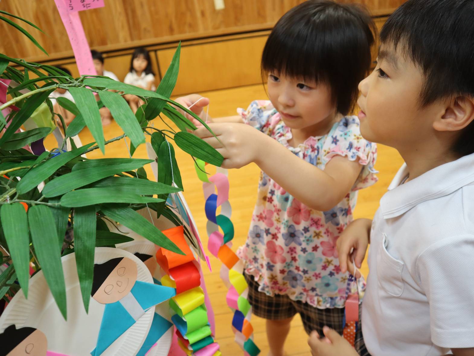 「お願いが叶いますように!」、「空から見えるように上に飾りたいな。」と製作の飾りつけを楽しむ大きい組さんでした。