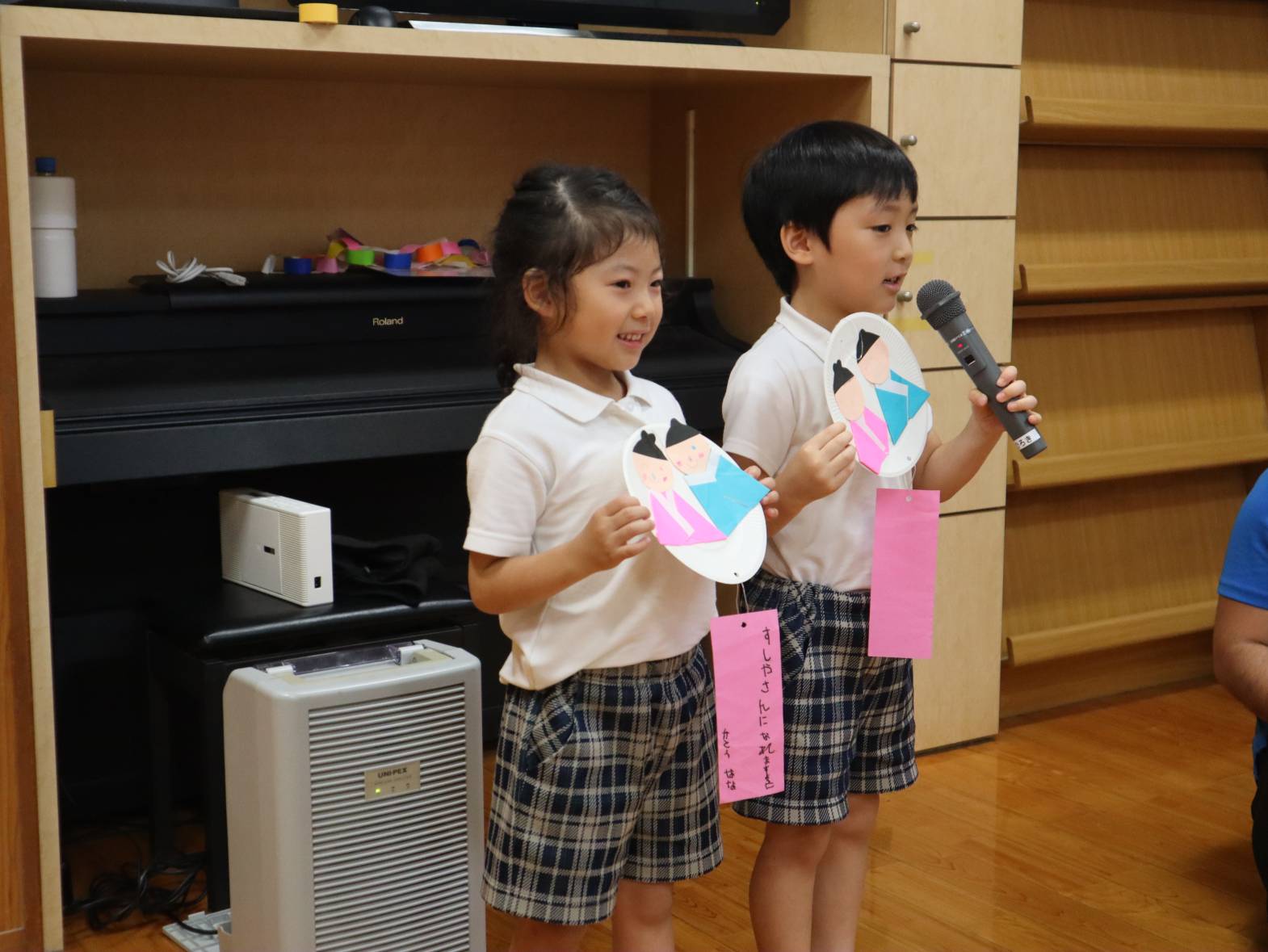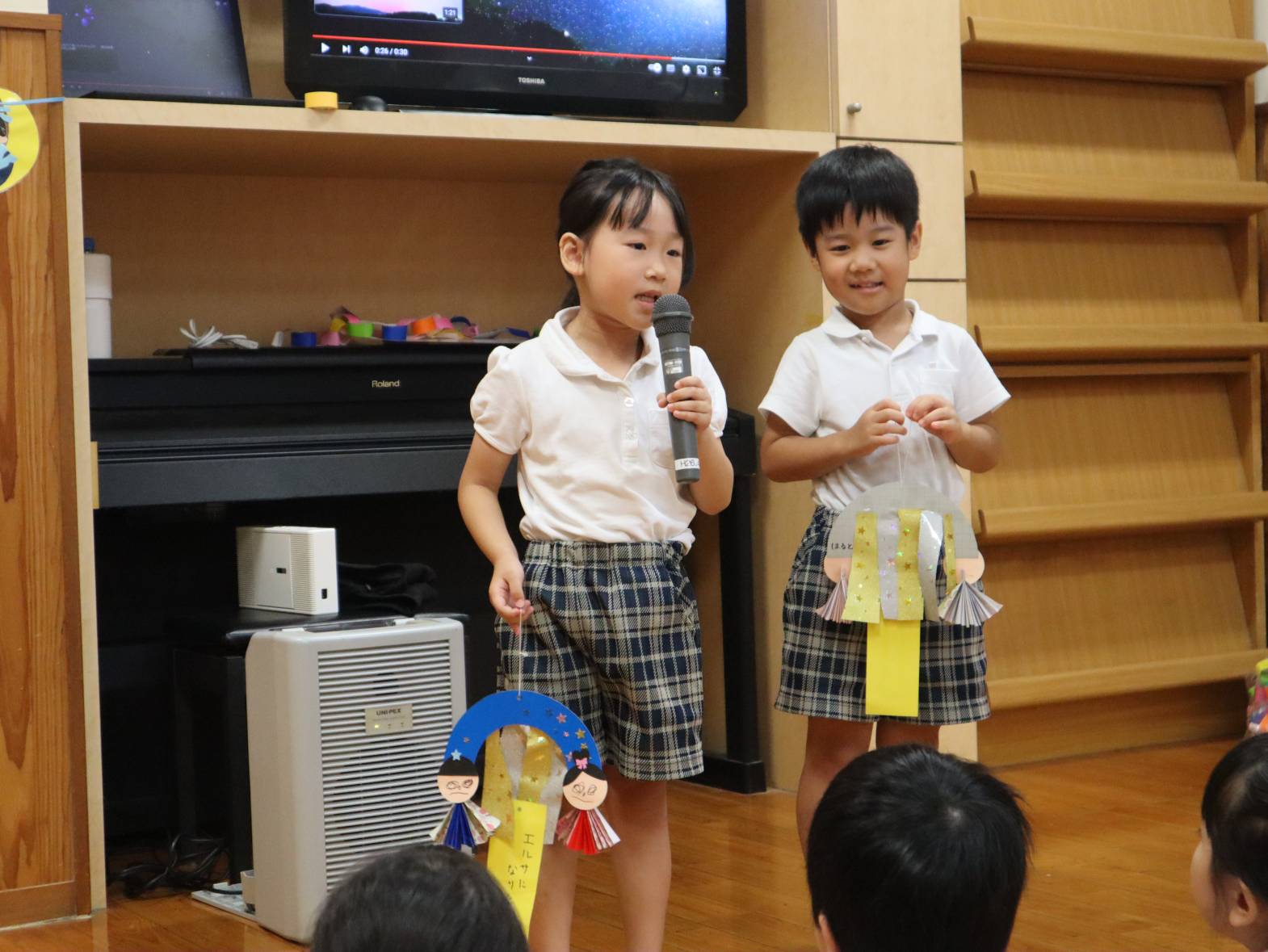 製作発表では、少しドキドキしながらもマイクを持って、「僕は、折り紙を折るのを頑張りました。」、「私は、シールを貼るのを頑張りました!」とそれぞれ頑張った所をみんなに伝える子どもたち。