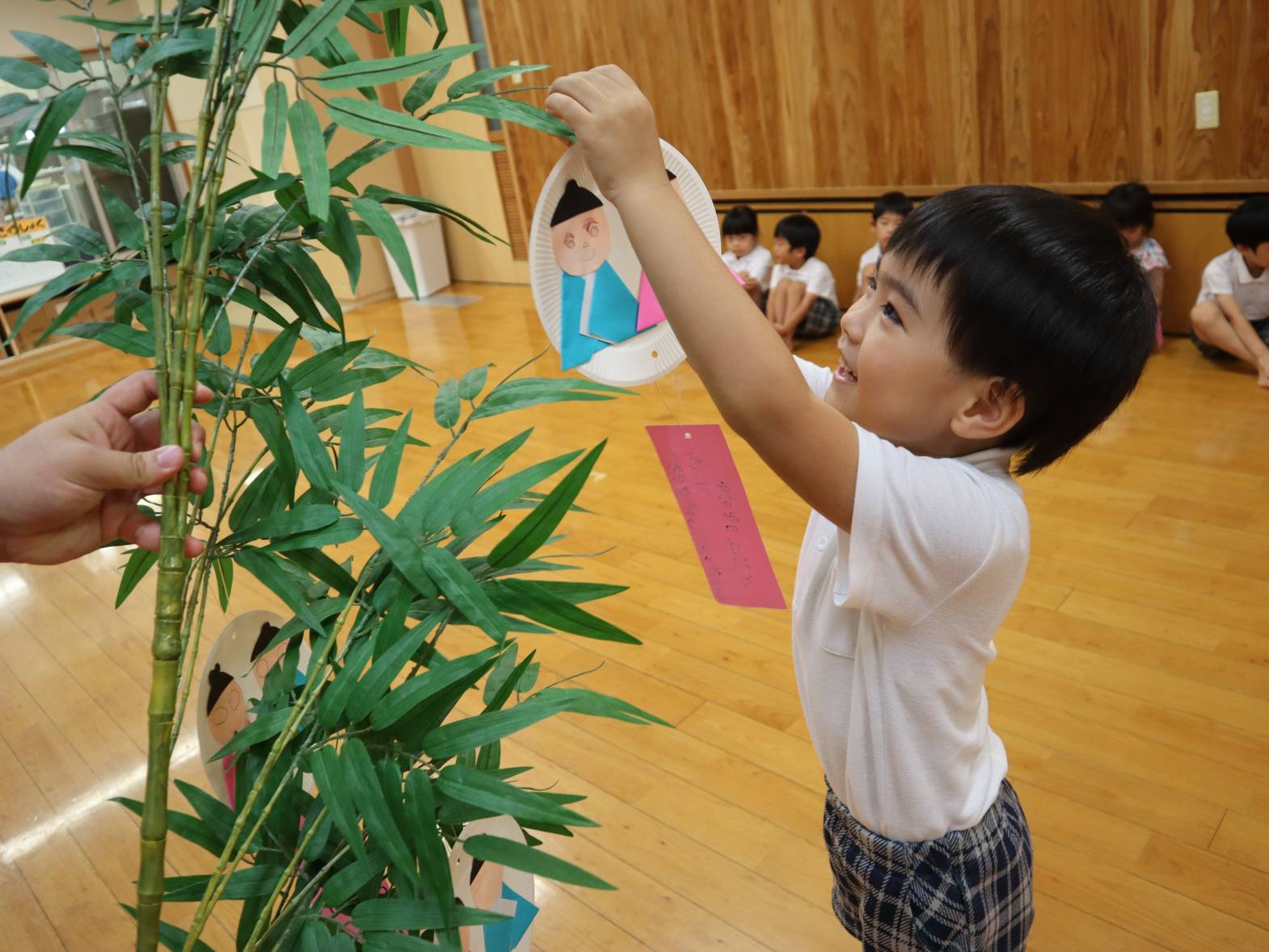 会が終わると、製作を笹に飾っていきます。