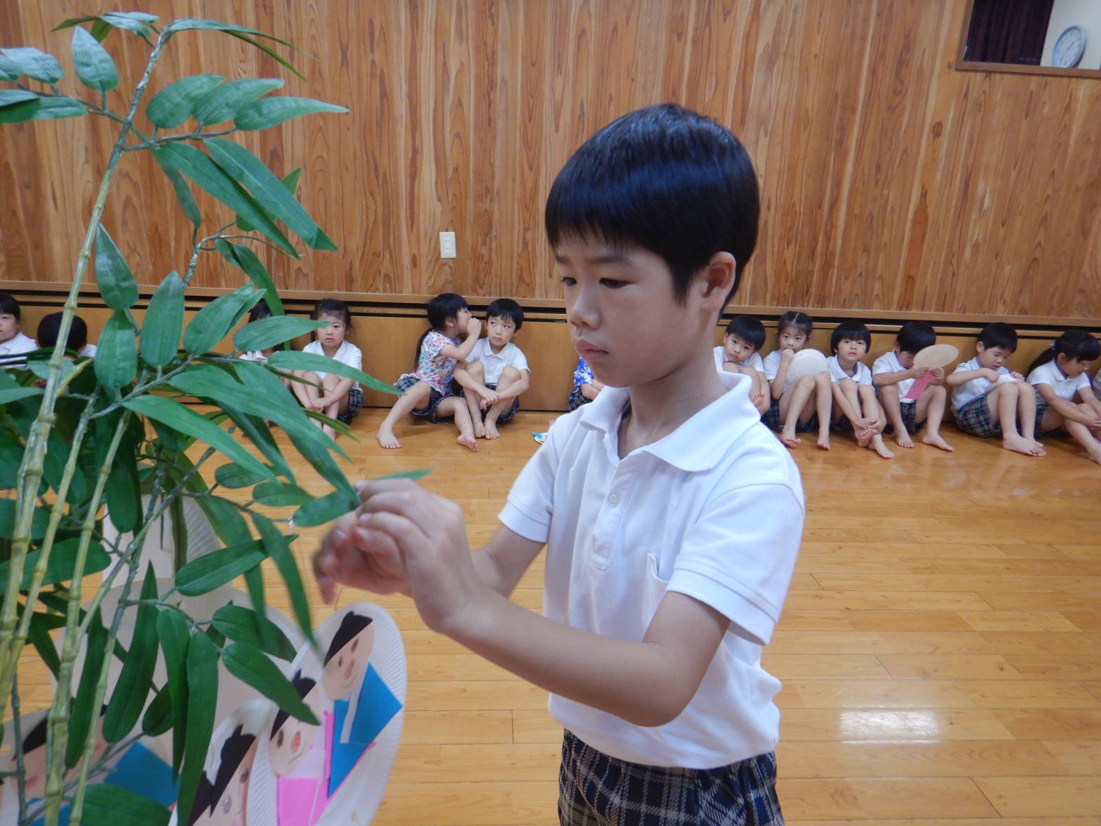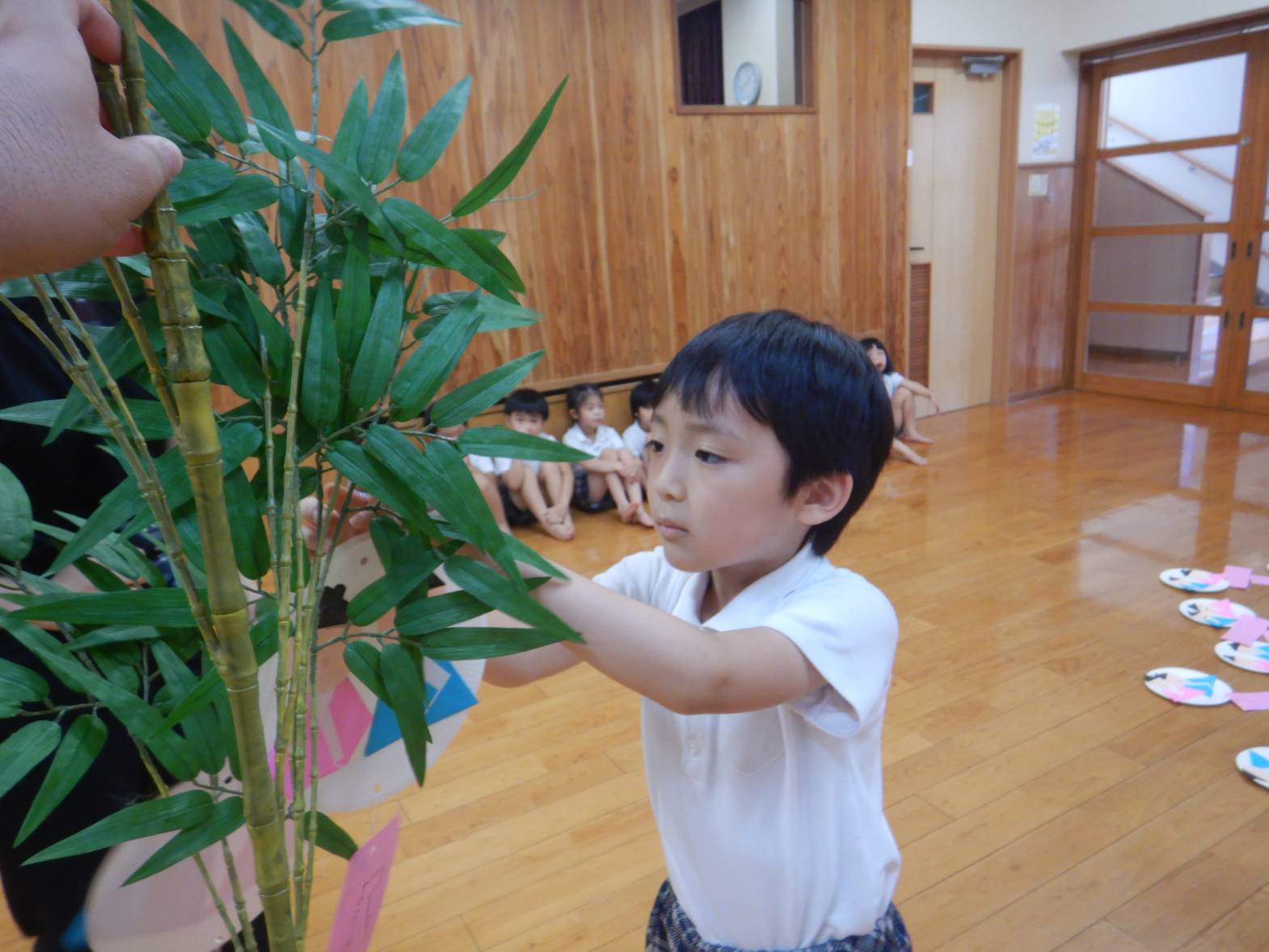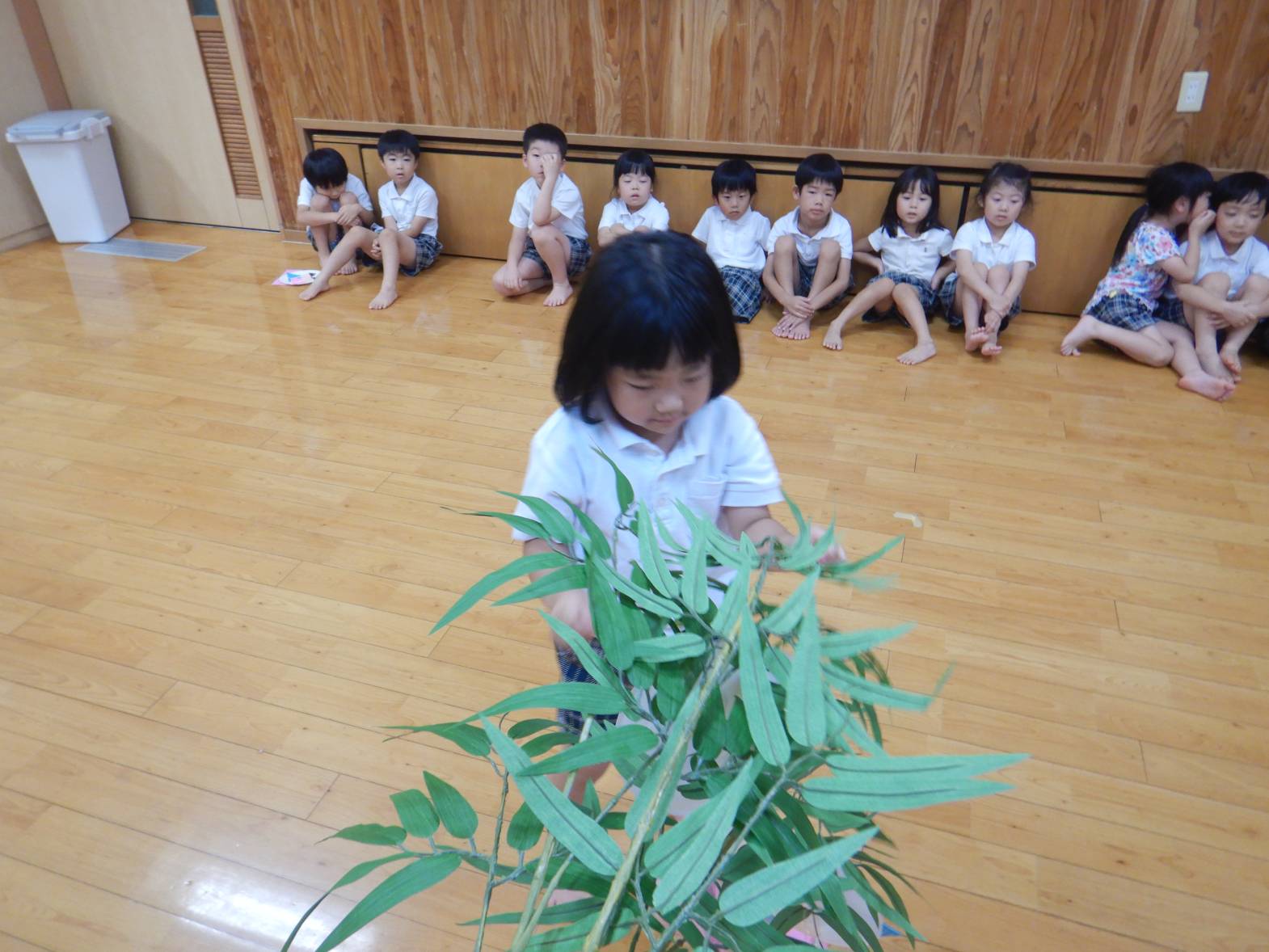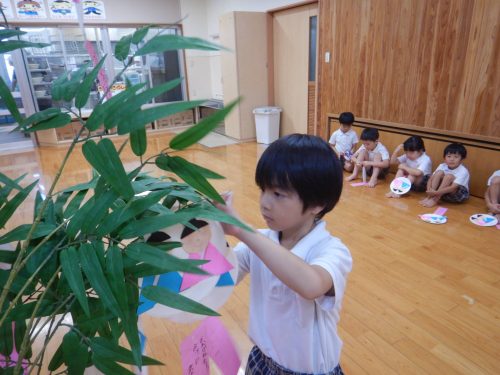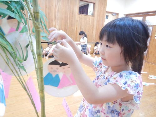今週は七夕会がありました。 七夕さまを歌ったり七夕の由来を聞いたりしました。 「織姫と彦星会えるといいね!」と七夕に想いをはせる子どもたち。 笹に短冊を飾り付ける際には「お願い叶かな?」とウキウキなきりん組さんでした。