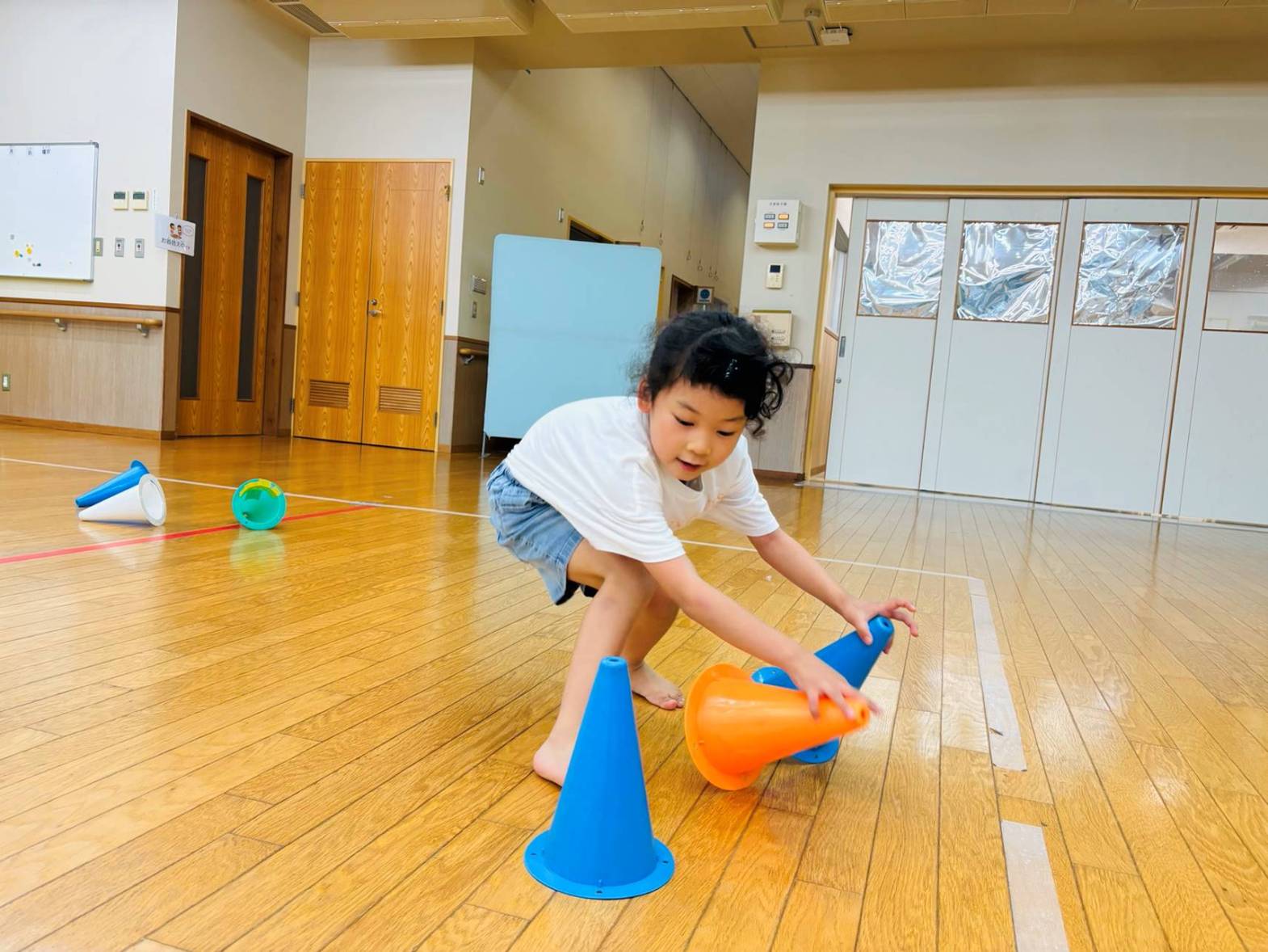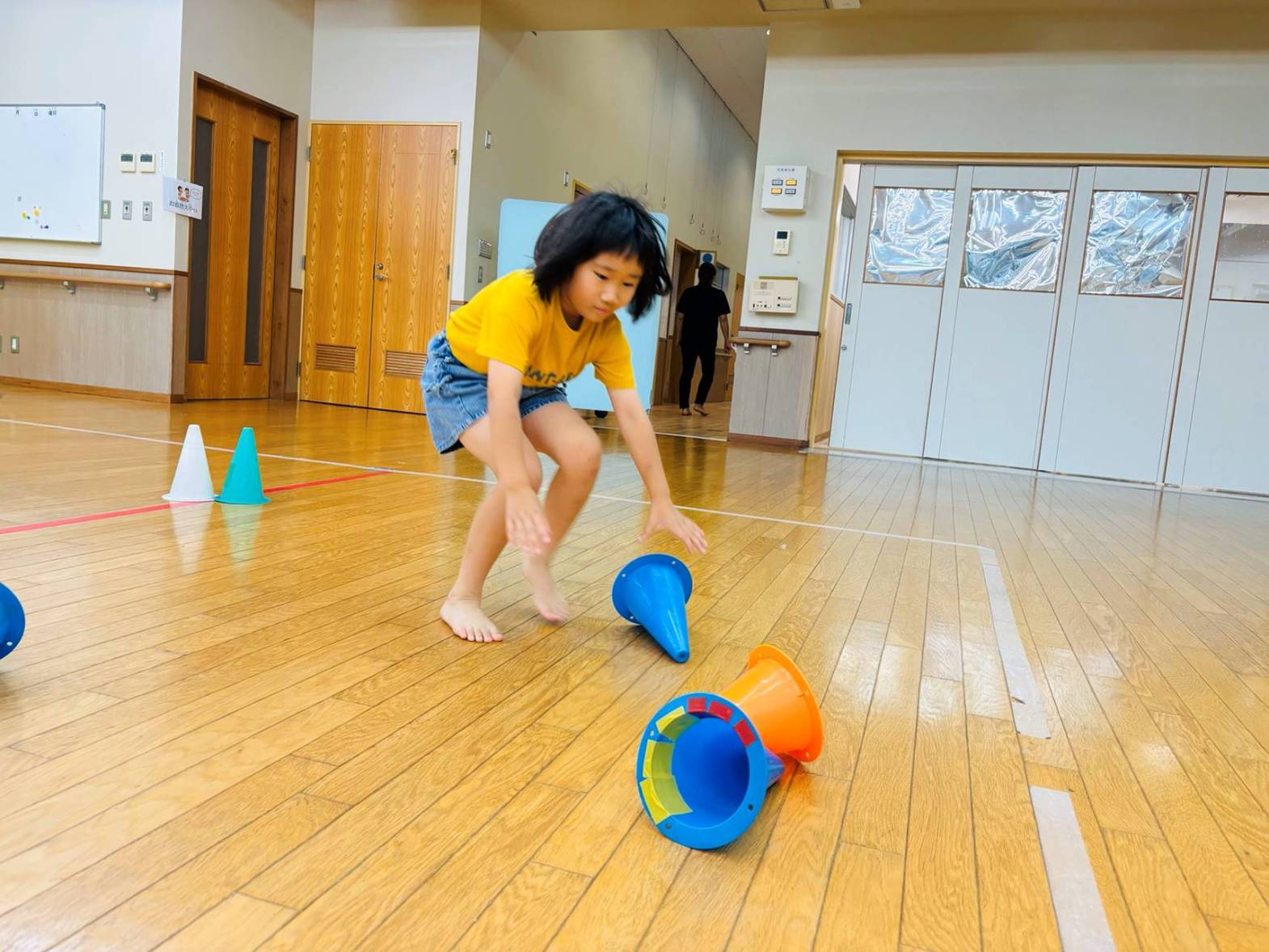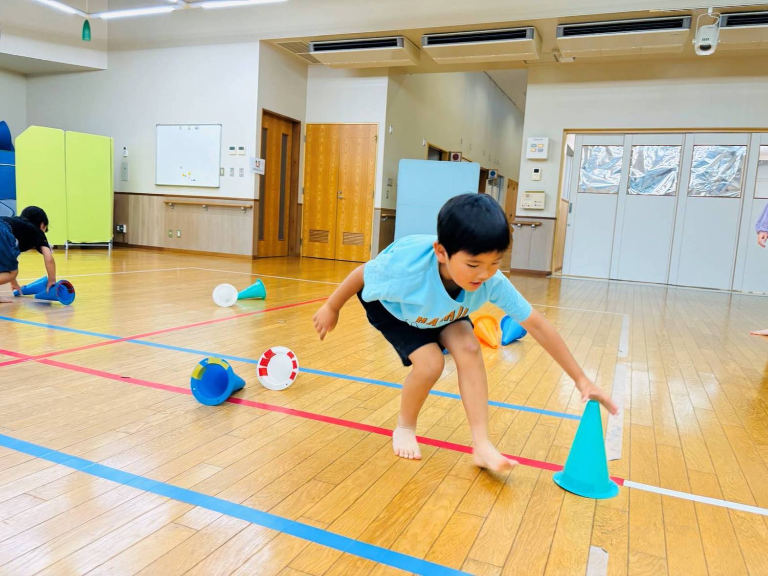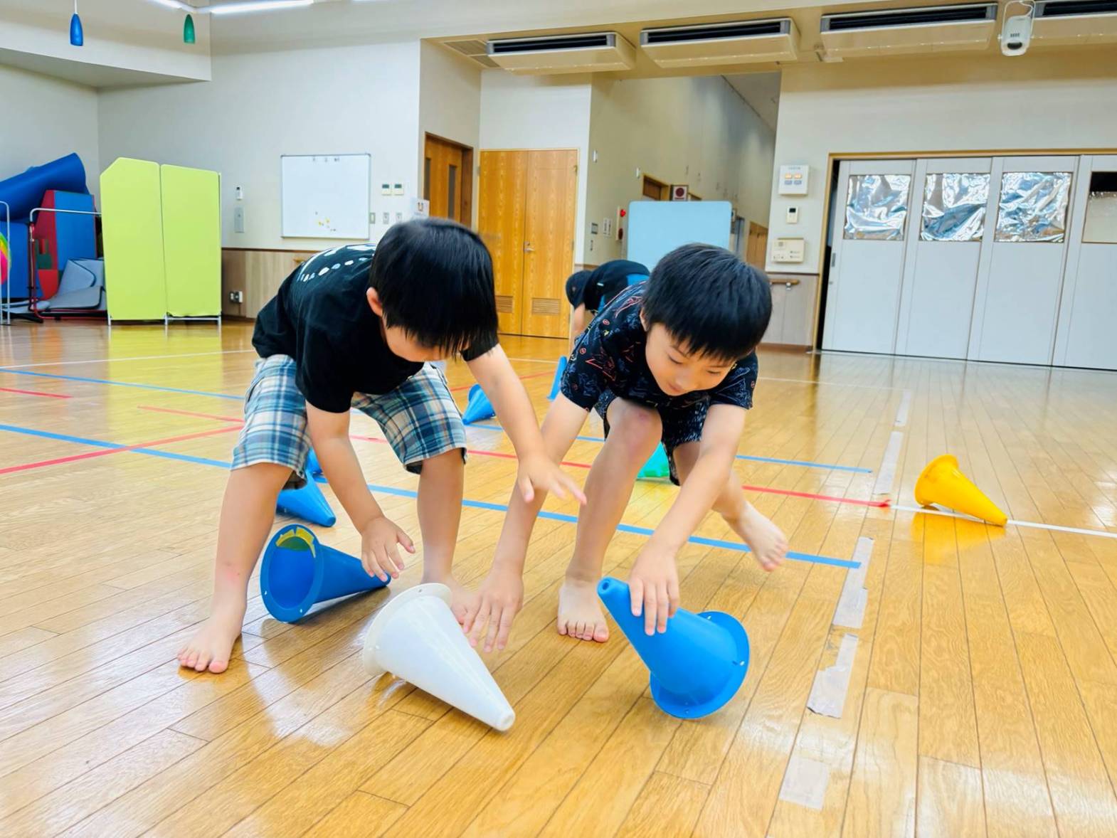 瞬発力を養うことを目的に、コーン倒し競争を行いました。 相手チームの動きを見ながら、コーンを立てたり、倒したり、どちらも白熱した戦いを繰り広げます! 今回は、コーンを倒す際優しく倒すことを伝えていたため、みんな約束事も意識しながら倒す姿が見られていました。 最後はチーム戦にも取り組み、汗をかくほど一生懸命動く子どもたちでした♪