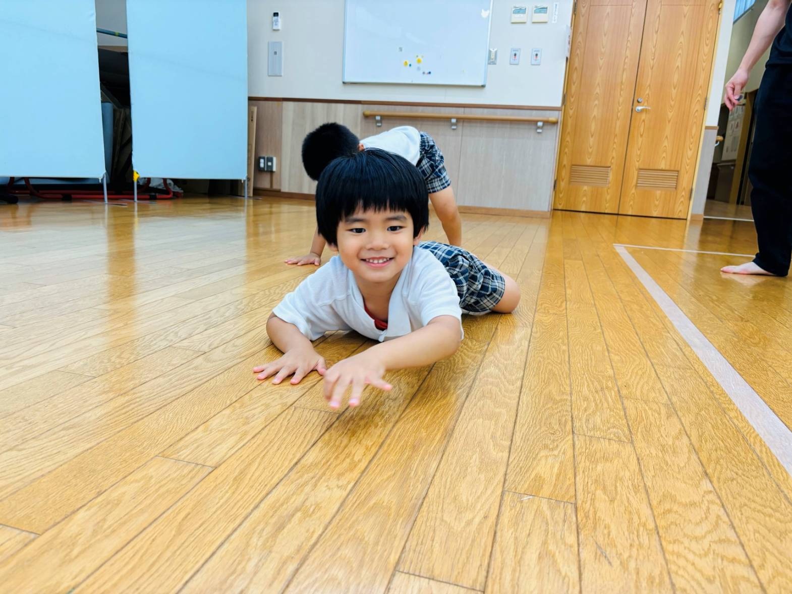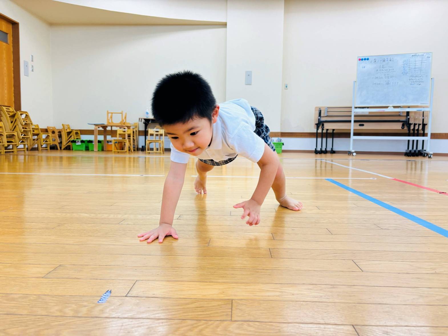 とら①グループさんでは、体の使い方を知ることを目的として、動物歩きに挑戦しました。 いぬ歩き(四つ這い)、くま歩き(高這い)、わに歩き(腹ばい)の3種類の歩き方の練習をしていきます。 直線や曲線のコースを、それぞれの歩き方で進みました! 最後は職員と追いかけっこをしてみました♪ 「今度はカエル歩きとかどう?」「ワニさん歩き楽しかった!」と楽しそうな声がたくさん聞かれていました☆