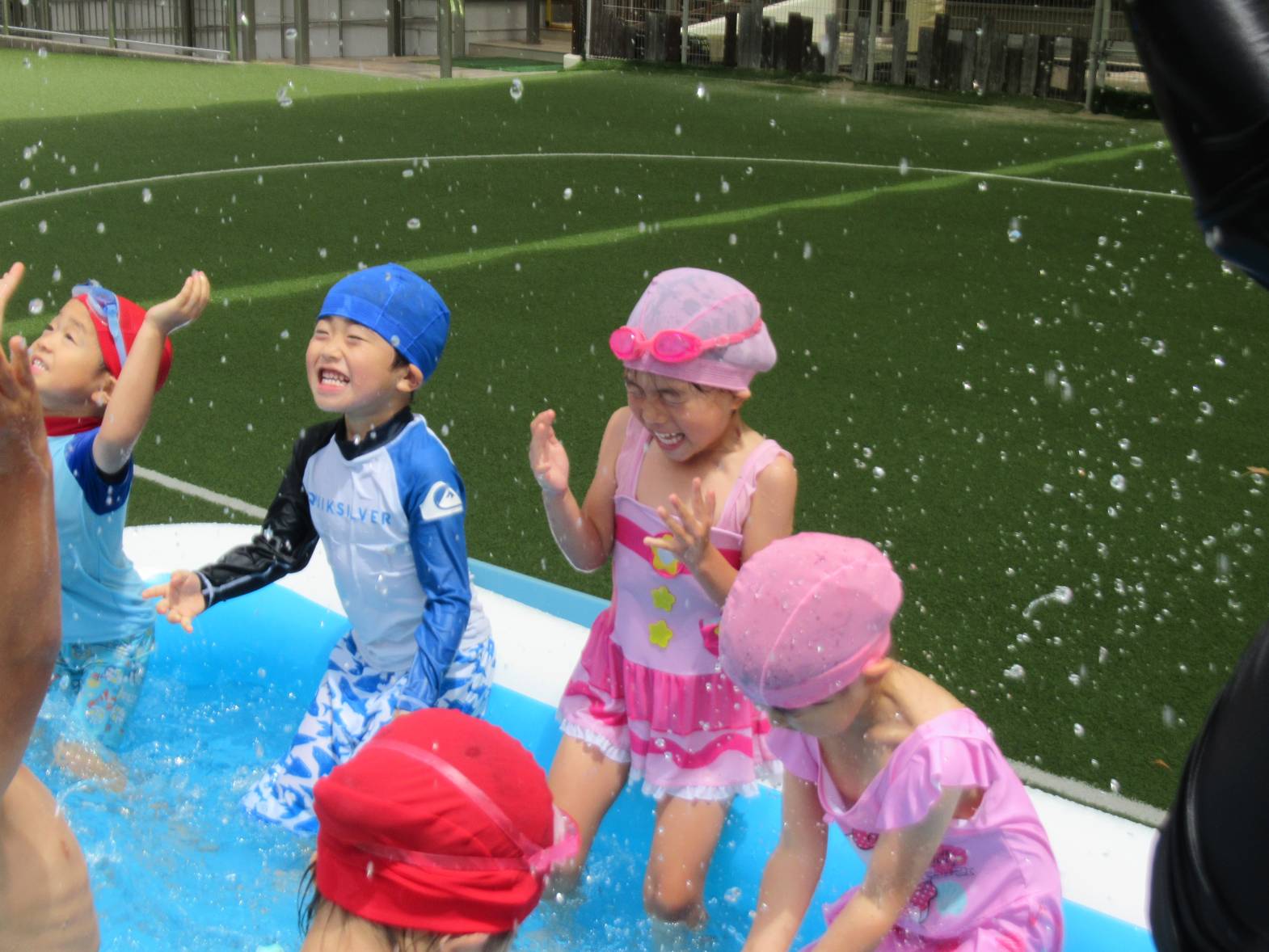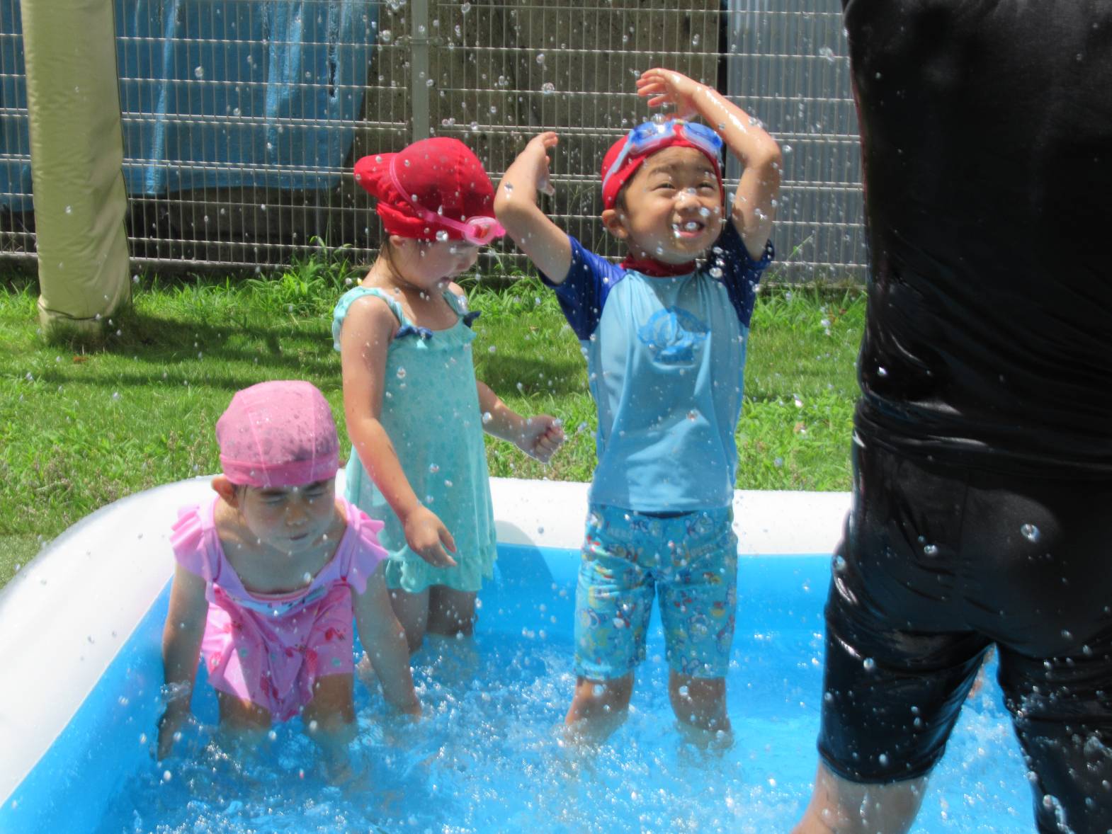 子どもたちが楽しみにしていた運動遊びのプール活動がありました。 プールに入ると「冷たい!」、「気持ちいいね!」と満面の笑みの子どもたち。 水を頭からかぶったり、水に顔を付けたりしながら水に触れることに慣れていきます! 「楽しかったね!」、「次も楽しみだね!」と暑さも吹き飛び大満足のきりん組さんでした!