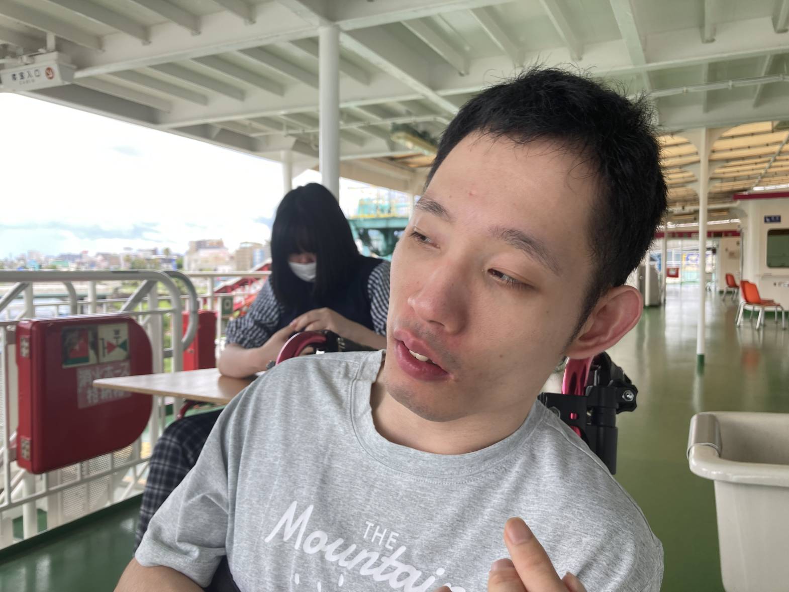 7月4日、7月9日にフェリー外出に行きました。 出発進行!! 桜島をバックにはいポーズ♪ 大きな機械音がして少し緊張しました。 外出は楽しいなぁ~☆ 帰りは客室内で…大きな音もせずに安心!笑顔も見せ余裕でした♥ 楽しかったですね。今度は何処に行きましょうか?楽しみですね!