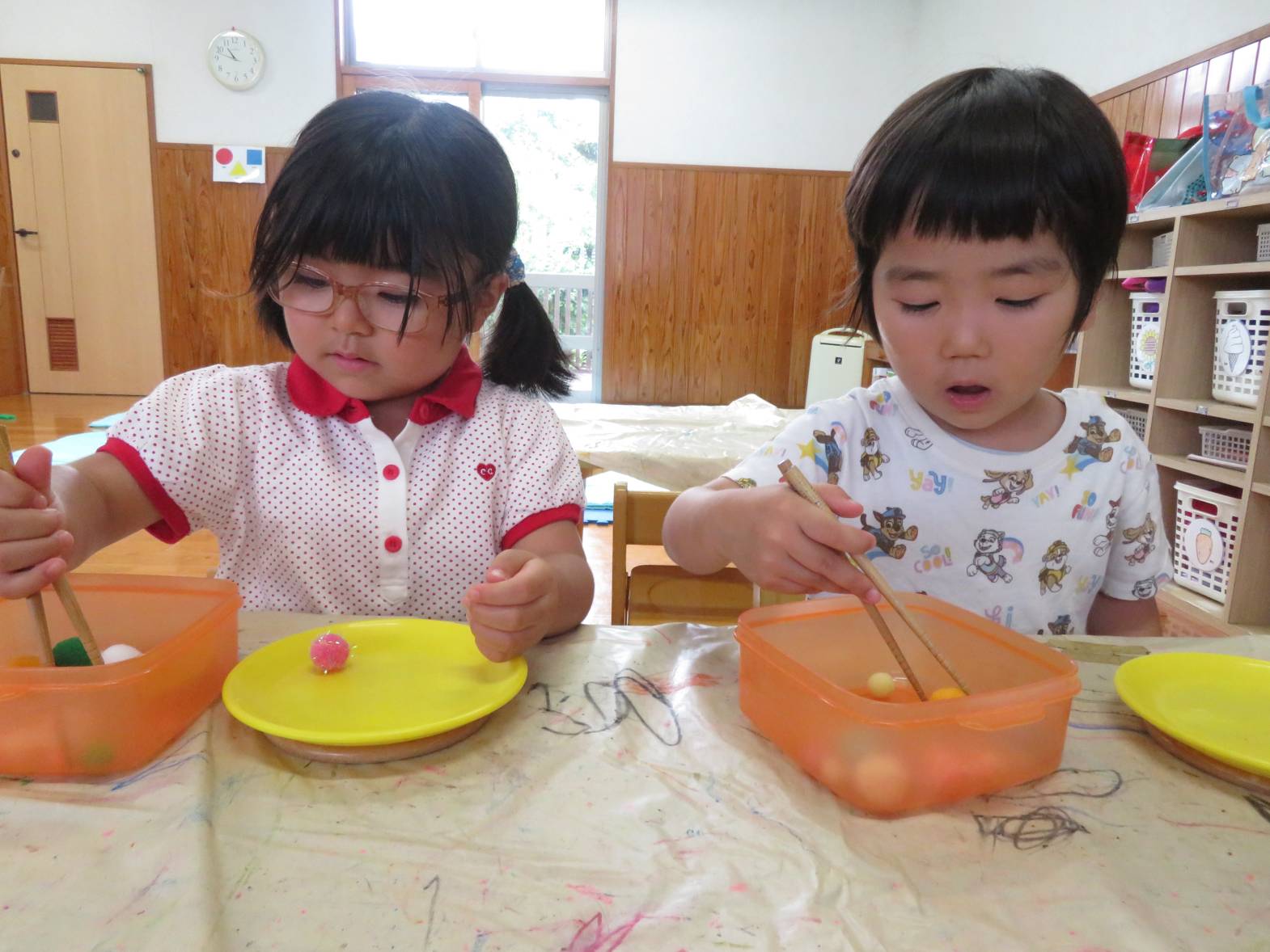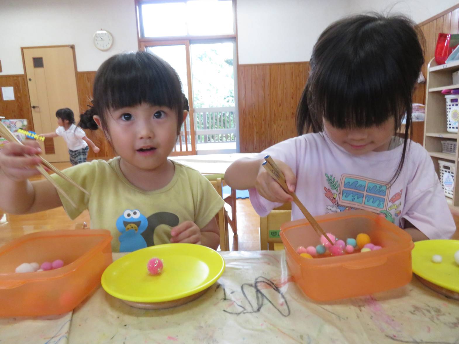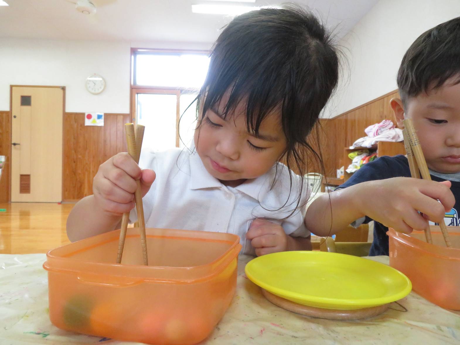箸遊びを行いました。 「お箸できるよ!」、「やってみたい!」と、とても意欲的に取り組む子どもたち! 箸を持つと、皿に上手に運べるよう集中して取り組む姿が見られました。 また、皿へ移すことができると「見てみて!できたよ!」と、嬉しそうに教えてくれるりす組さん♪ 中には、難しく援助を求めたり、諦めそうになったりする姿もありましたが、子どもたちのペースに合わせながら丁寧に援助を行っていきたいと思います。