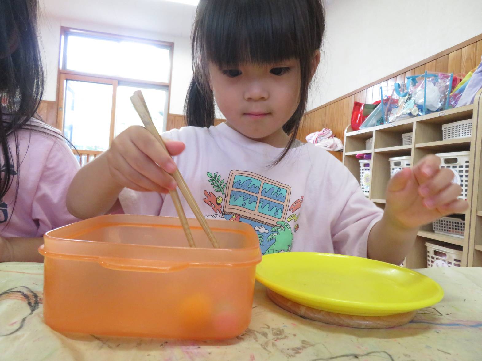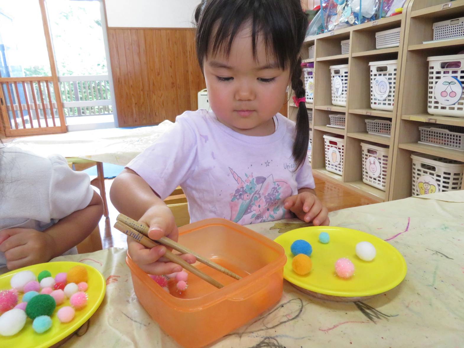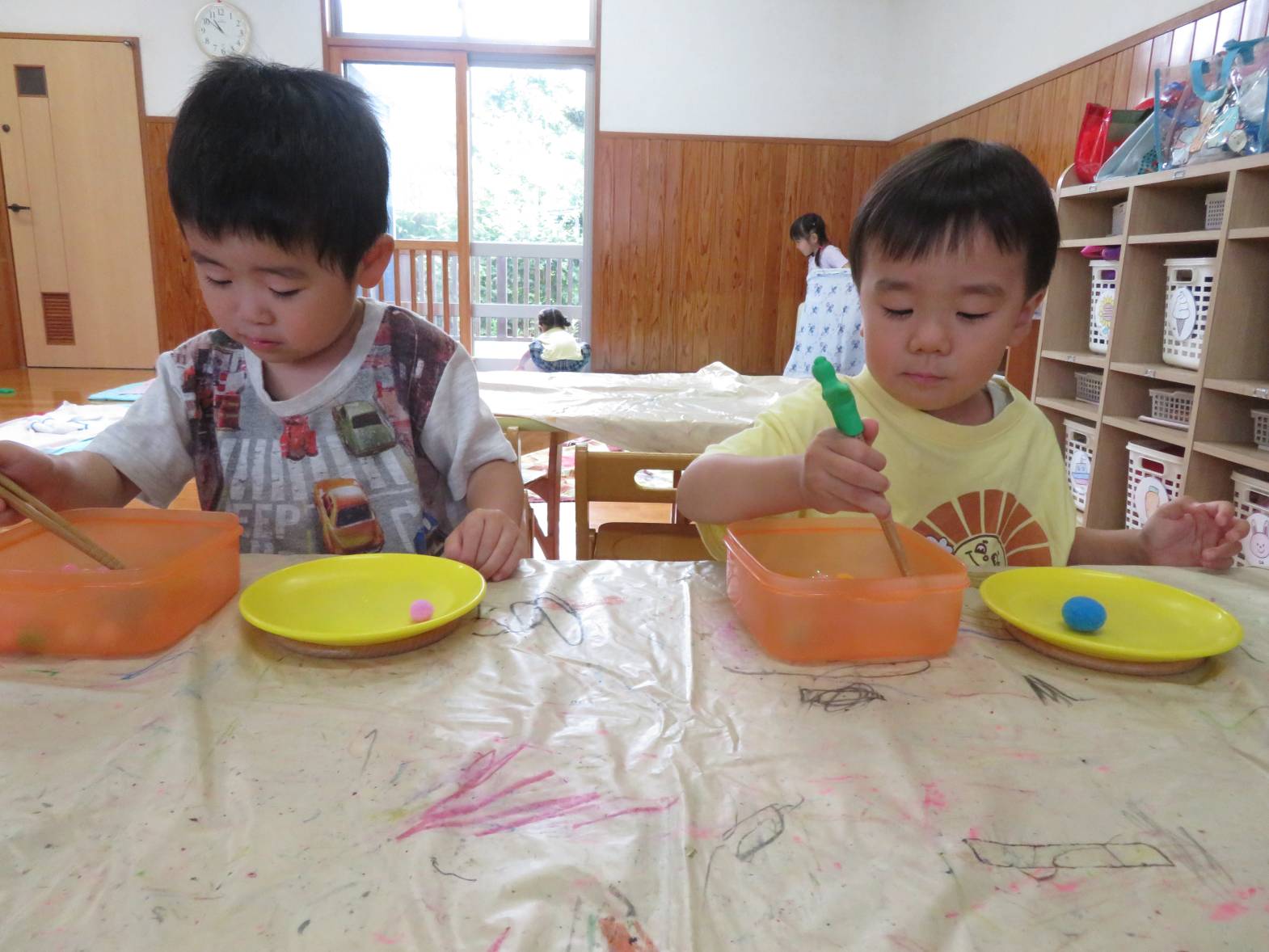 箸遊びを行いました。 「お箸できるよ!」、「やってみたい!」と、とても意欲的に取り組む子どもたち! 箸を持つと、皿に上手に運べるよう集中して取り組む姿が見られました。 また、皿へ移すことができると「見てみて!できたよ!」と、嬉しそうに教えてくれるりす組さん♪ 中には、難しく援助を求めたり、諦めそうになったりする姿もありましたが、子どもたちのペースに合わせながら丁寧に援助を行っていきたいと思います。