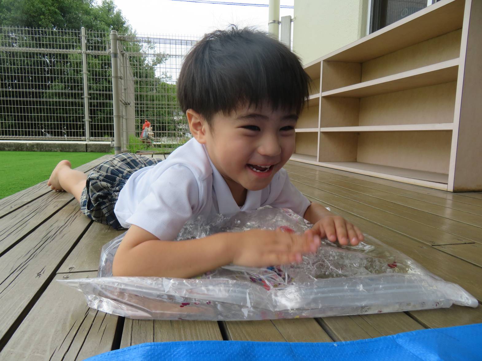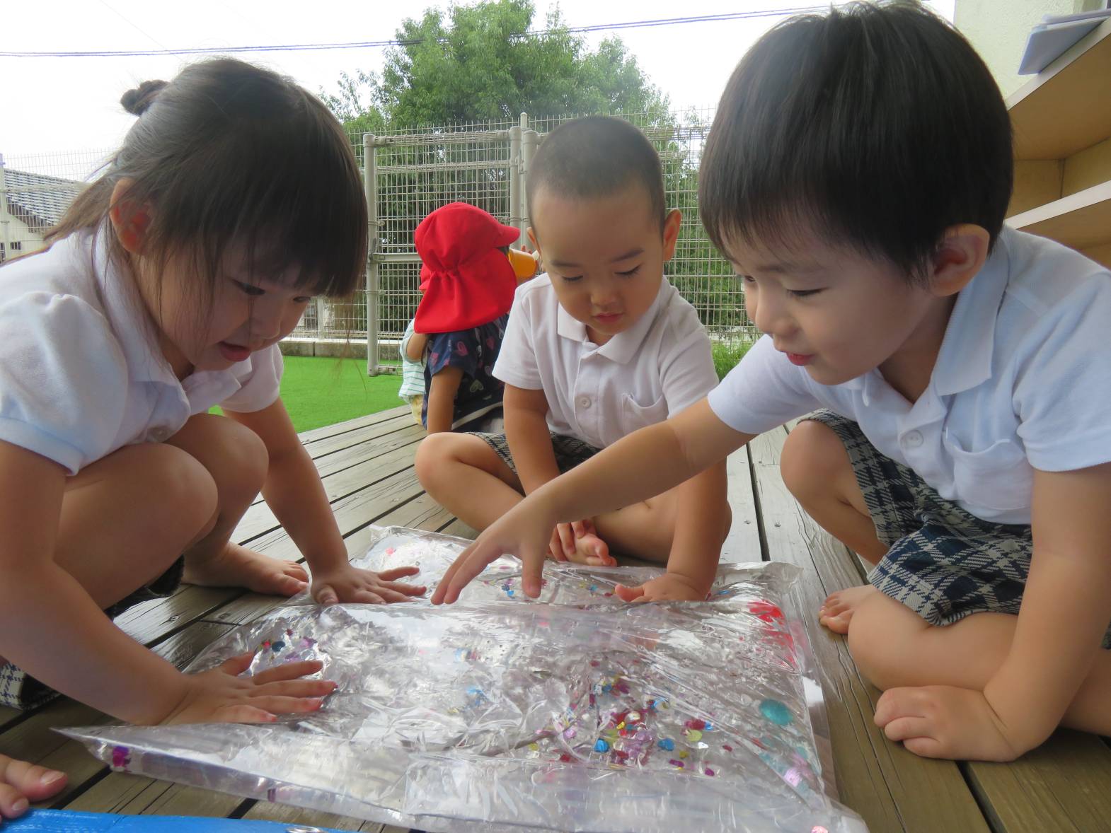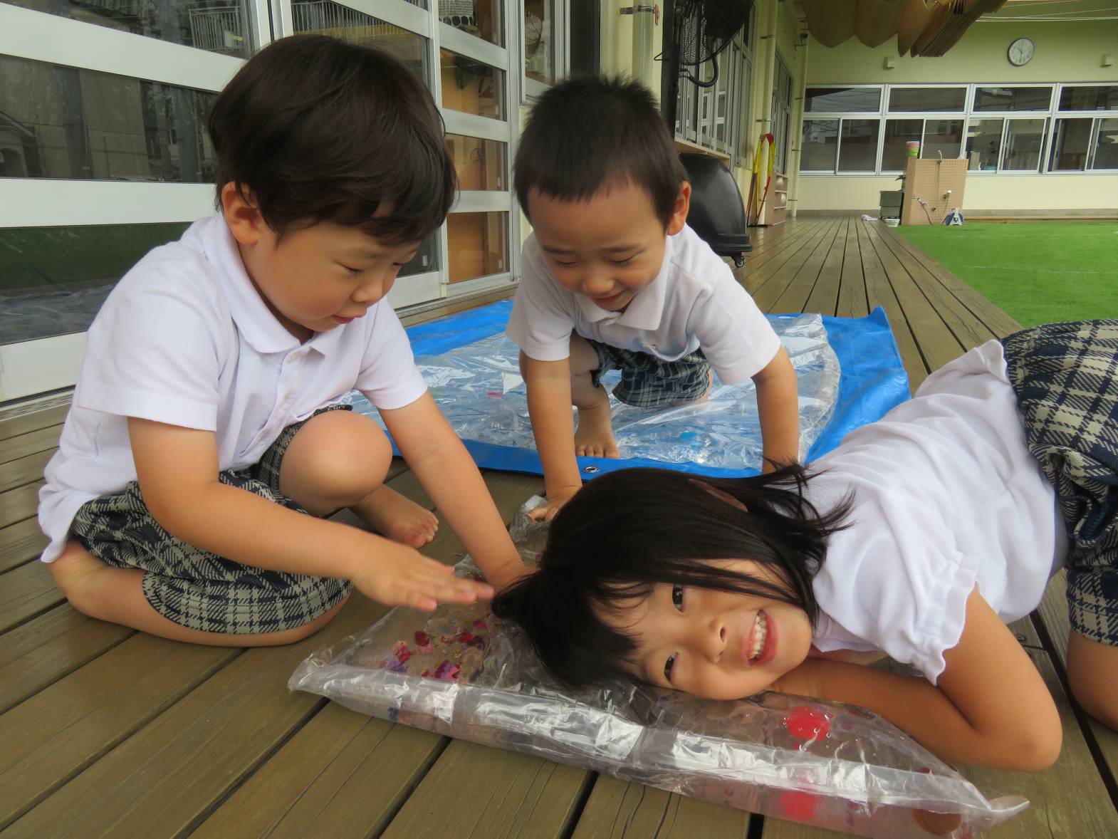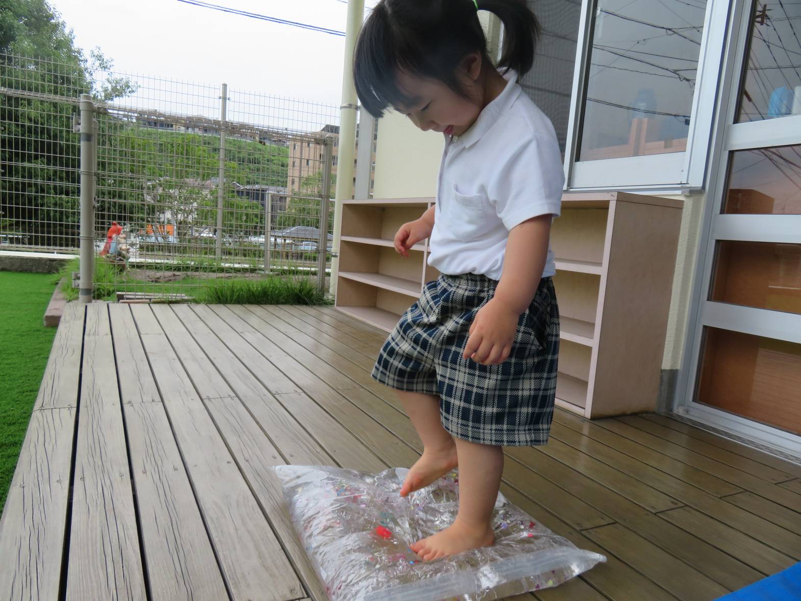 また、ウォーターマットの中にハートのスパンコールや動物型のスポンジ、スーパーボールを発見すると「ハートだ可愛い。」と嬉しそうにツンツンしてみたり「掴まえたぞ!」と袋越しに掴まえたりする姿が見られました。