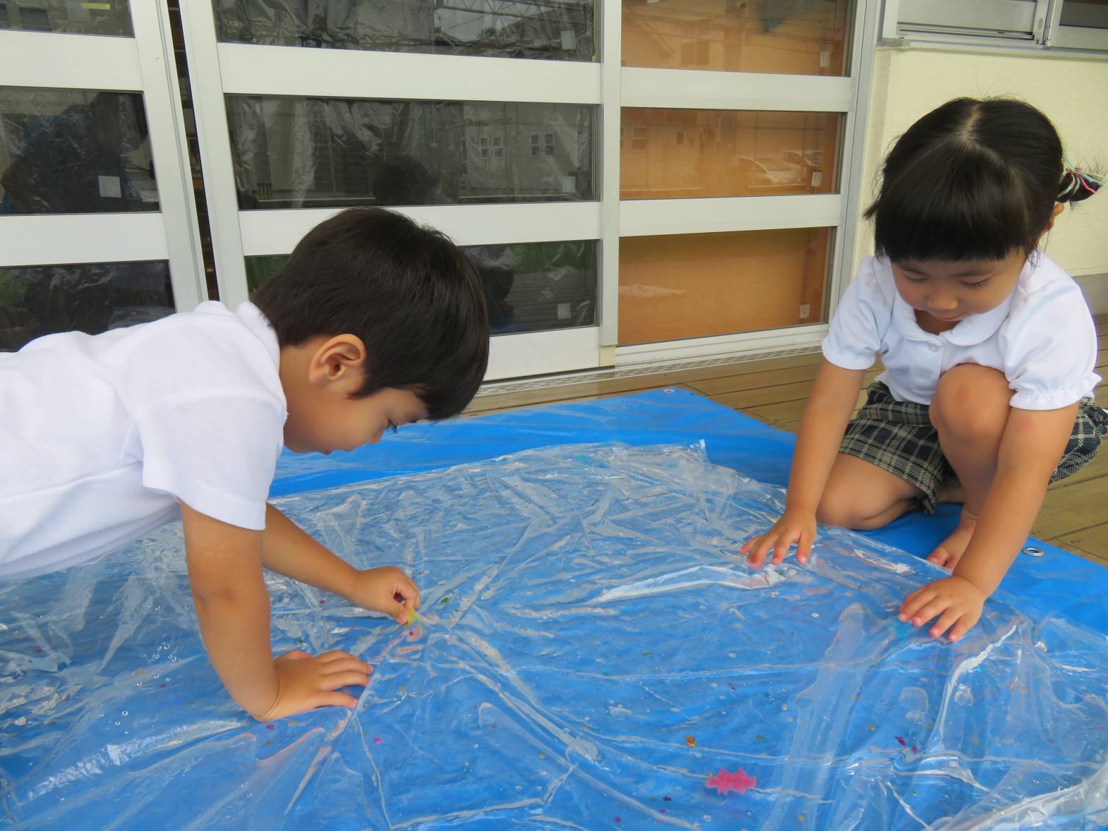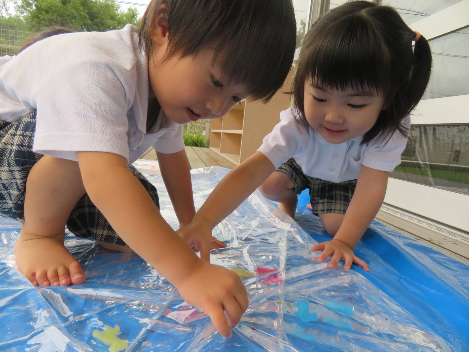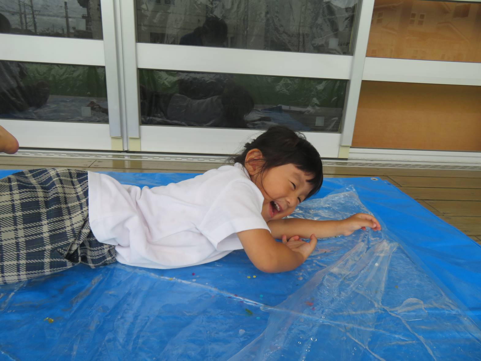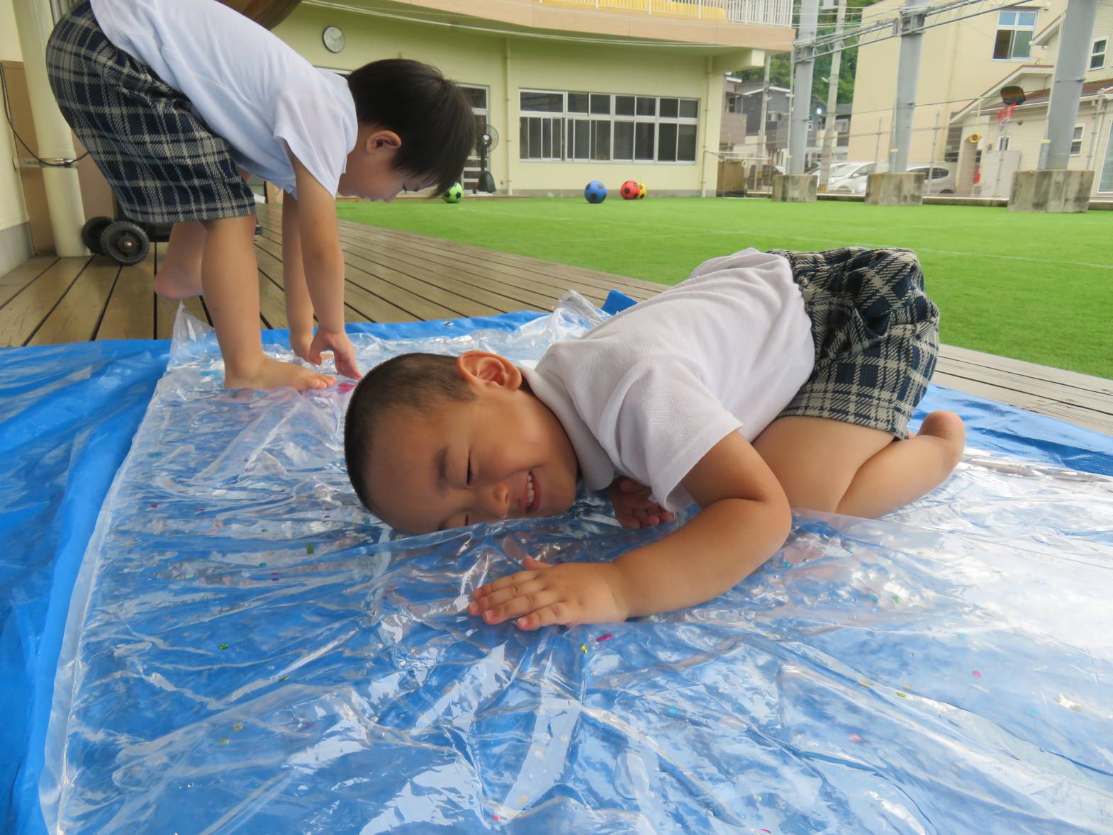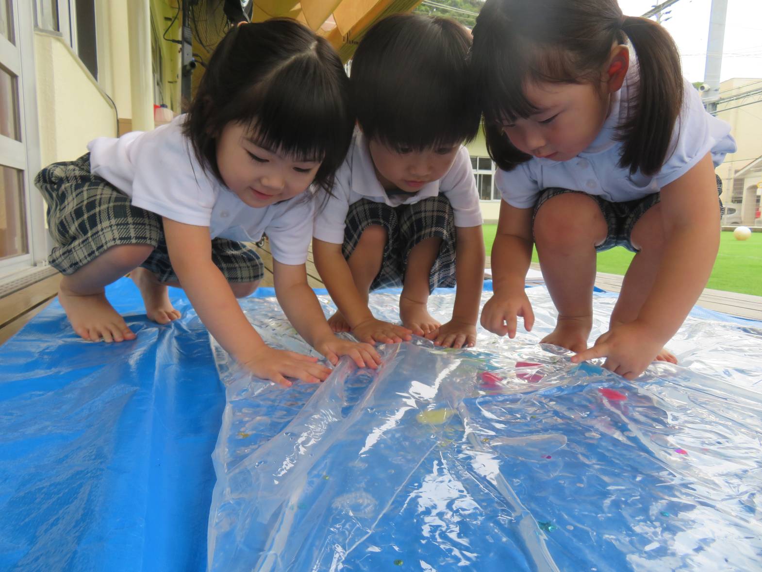 また、ウォーターマットの中にハートのスパンコールや動物型のスポンジ、スーパーボールを発見すると「ハートだ可愛い。」と嬉しそうにツンツンしてみたり「掴まえたぞ!」と袋越しに掴まえたりする姿が見られました。