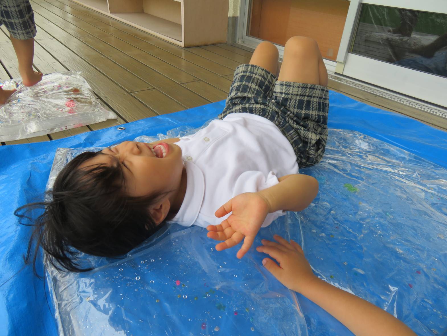 遊び進める中で、ウォーターマットの上にごろーんと転がってみたり顔だけ乗せて枕にしてみたり…
