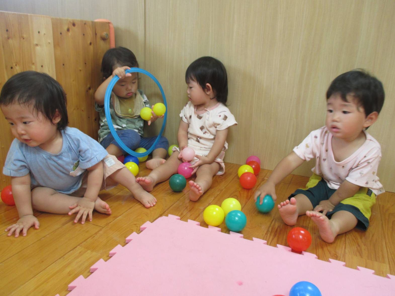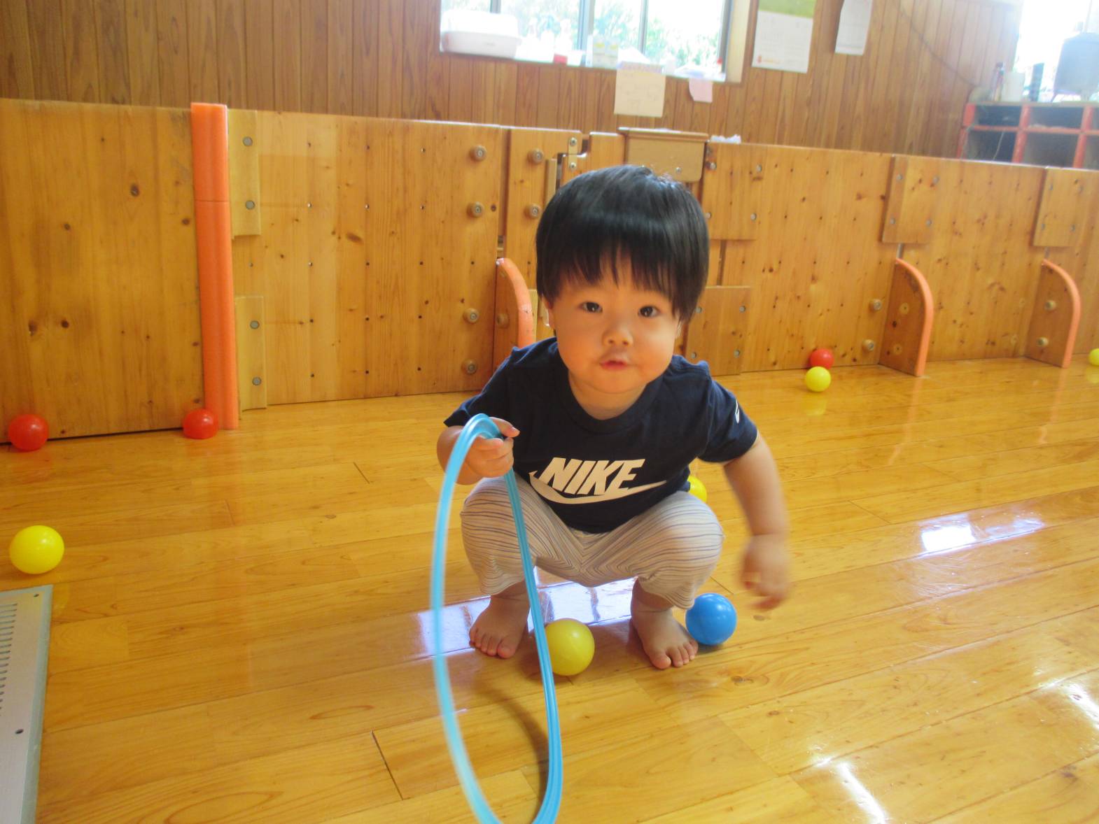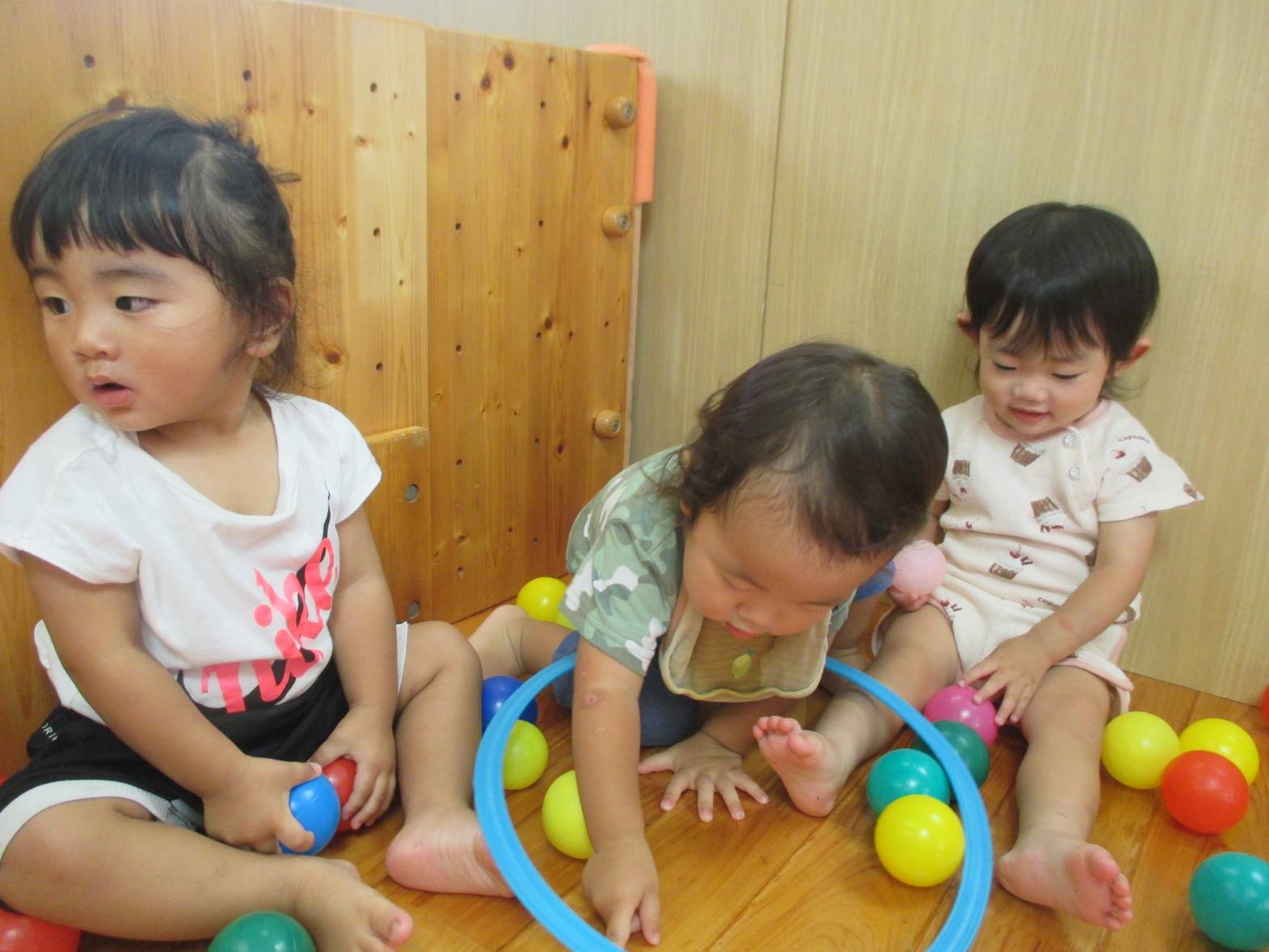カラーボールとミニフラフープを使って遊びました! ボールが転がって端の方に集まると、お友だちと一緒に”まてまて~″と移動を楽しんでいた子どもたち。 たくさんのボールに囲まれて嬉しそうでした。 フラフープを保育者と一緒に転がしてみたり、ボールをくぐらせてみたりと様々な遊び方を発見していました! 雨の日も楽しく活動しているこあら組さんです!