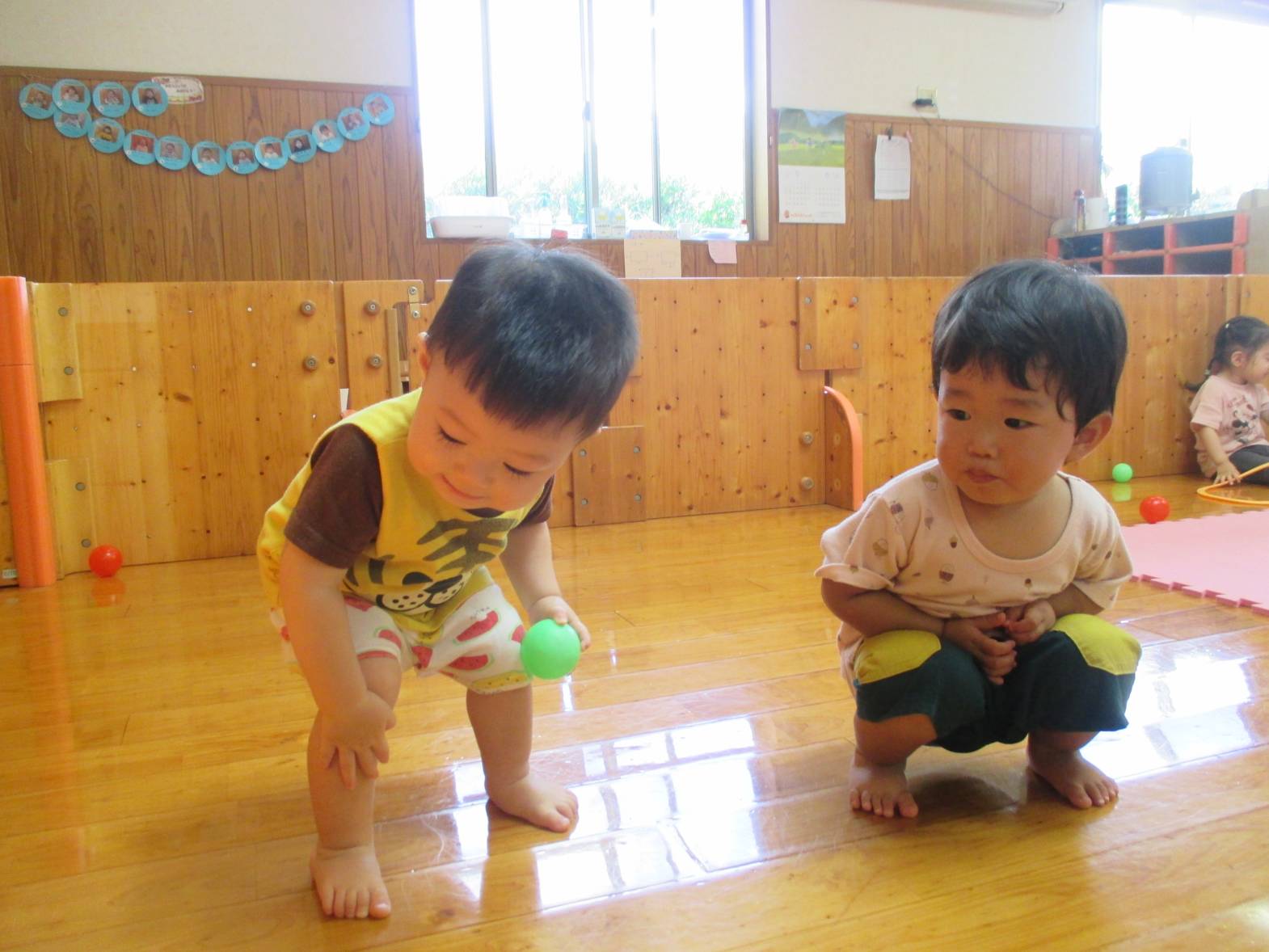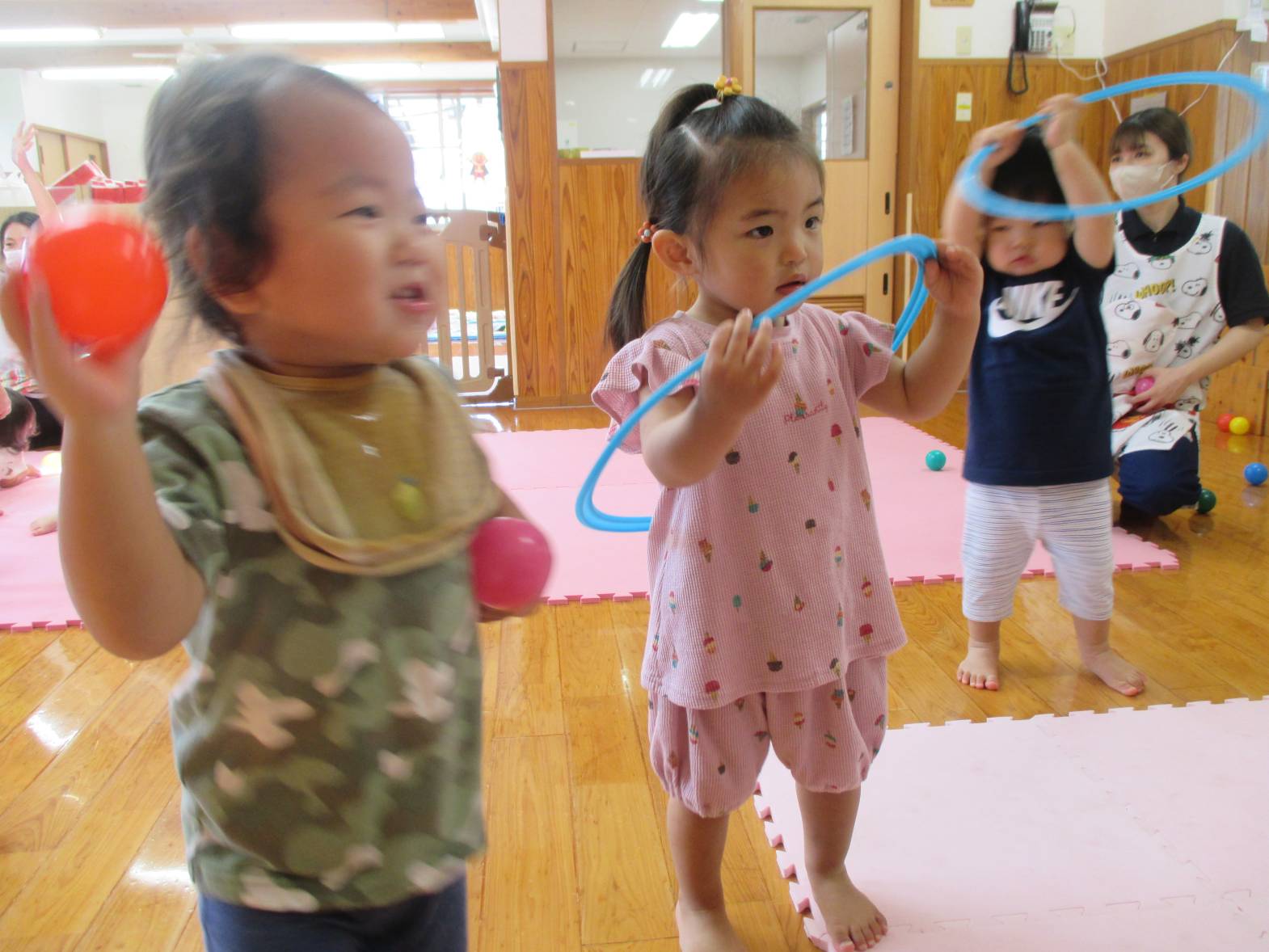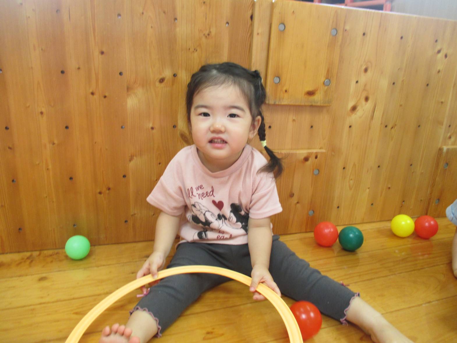 カラーボールとミニフラフープを使って遊びました! ボールが転がって端の方に集まると、お友だちと一緒に”まてまて~″と移動を楽しんでいた子どもたち。 たくさんのボールに囲まれて嬉しそうでした。 フラフープを保育者と一緒に転がしてみたり、ボールをくぐらせてみたりと様々な遊び方を発見していました! 雨の日も楽しく活動しているこあら組さんです!