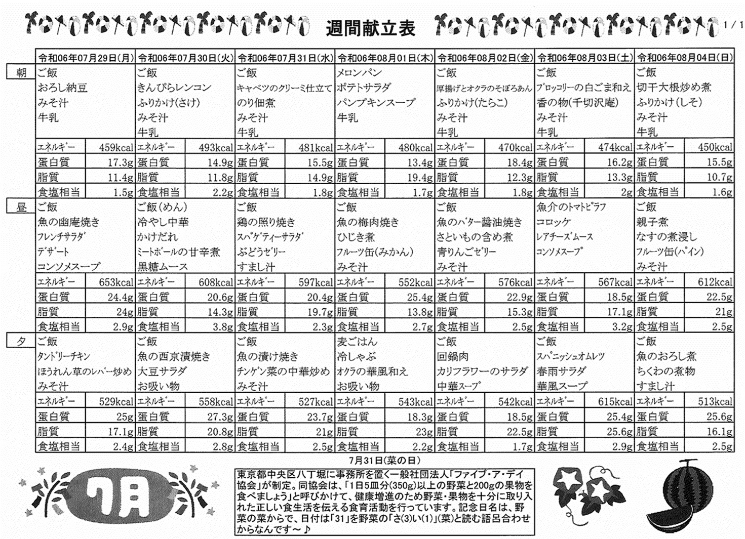 7月29日(月)~8月4日(日)の献立表になります。是非ご覧ください。