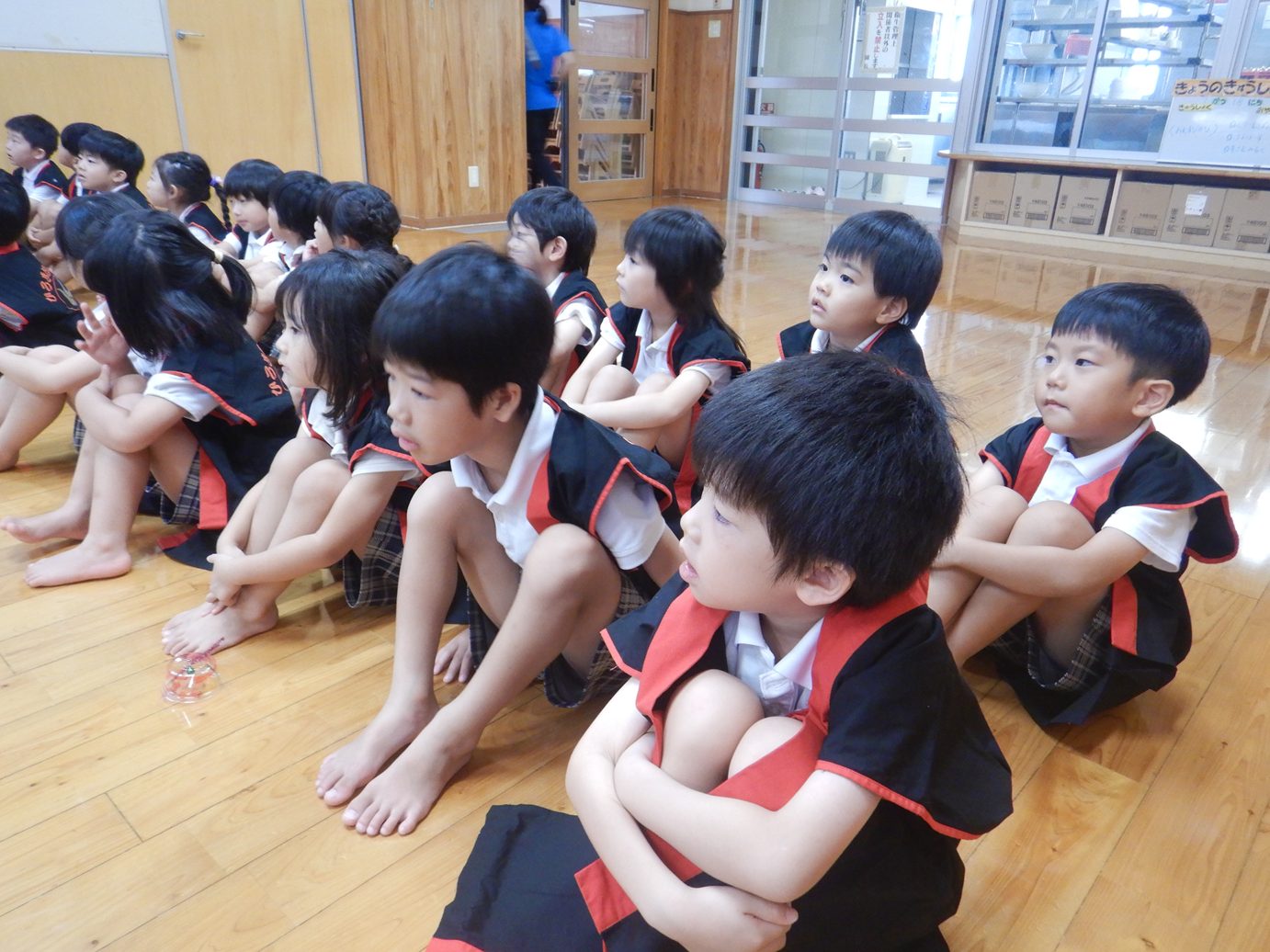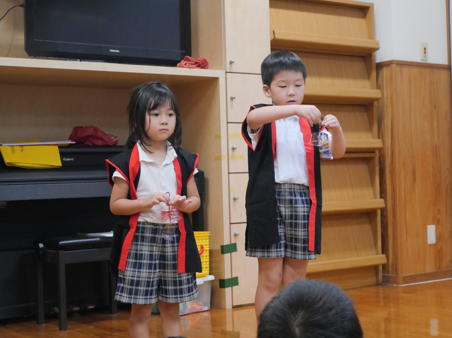 みんなの前に立つと緊張した表情も見られましたが、「お絵描きを頑張りました。」、「金魚を作るのが楽しかった。」など、上手に話をすることができました。