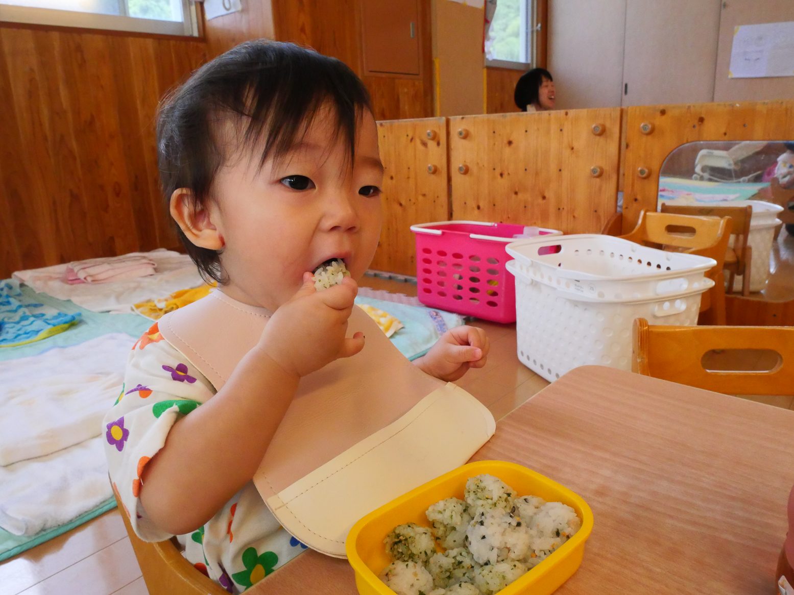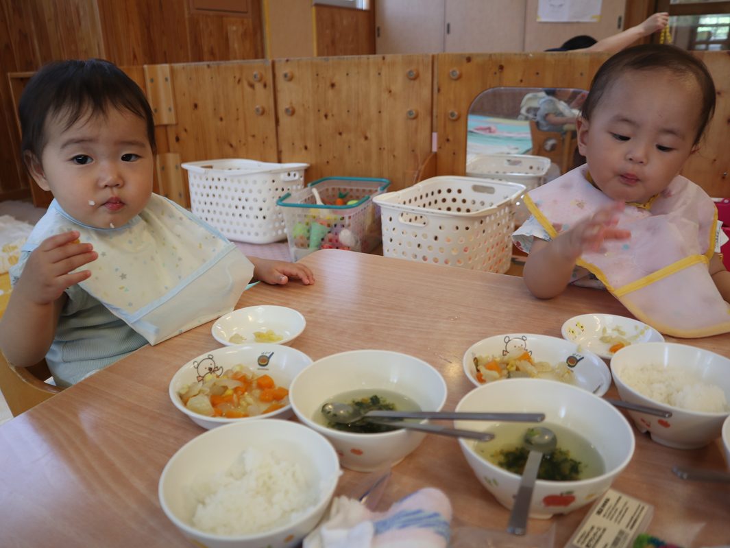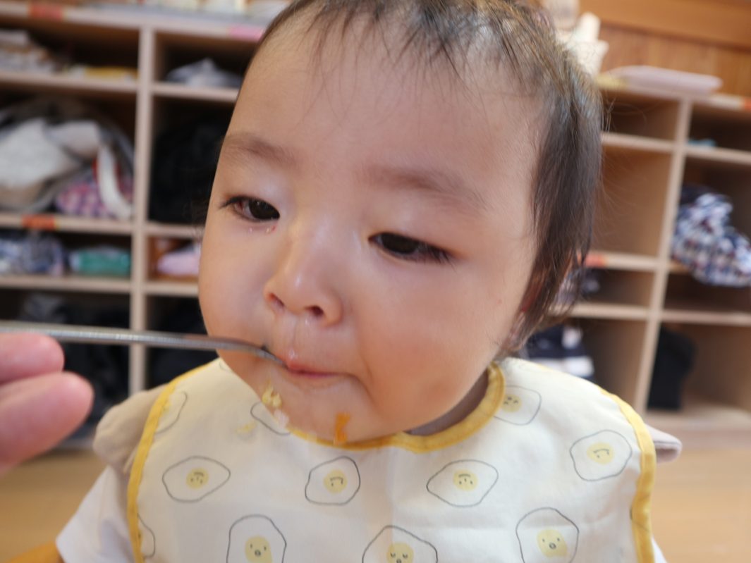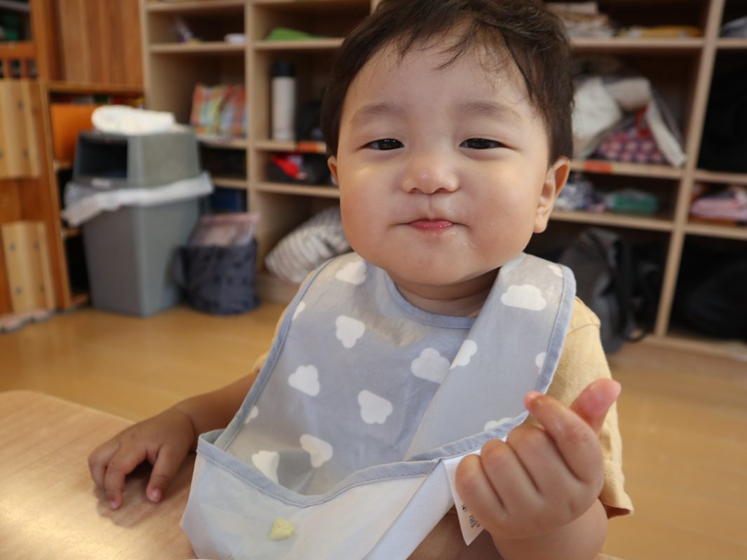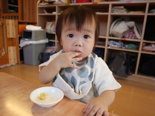 ひよこ組さんは、食べることが大好きです。 幼児食の子も増え、先日のおむすびの日では、いつもと違う雰囲気に目を輝かせながら おむすびを頬張る姿が見られました。 離乳食の子も、手掴みや保育者の援助の下パクパク食べ進め、楽しい食事時間となっています! 完食後は、満足そうに満面の笑みを見せる子どもたちでした!