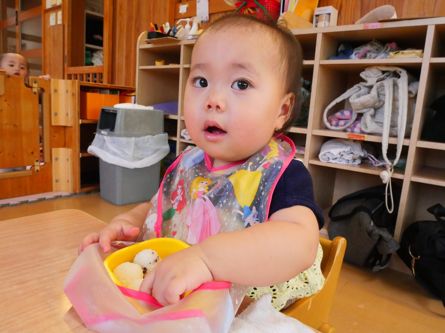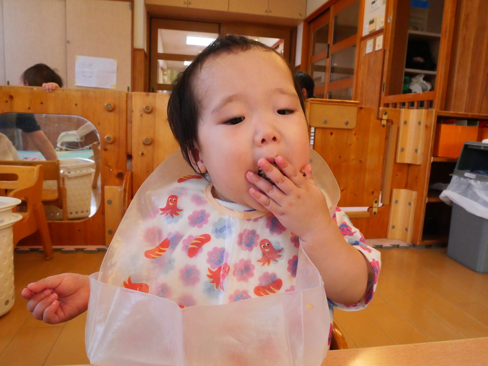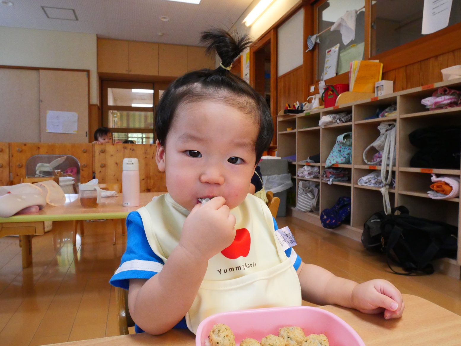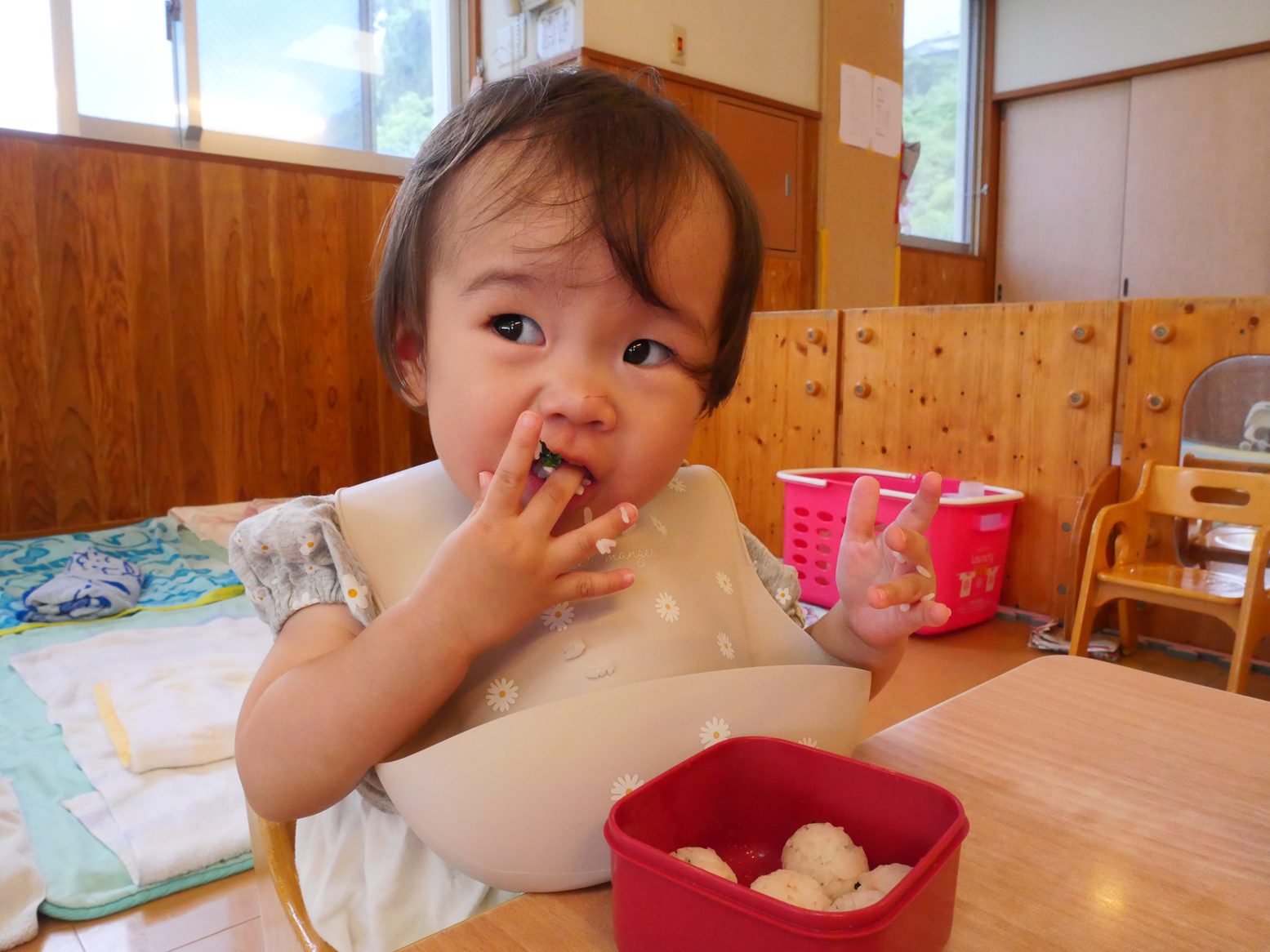 ひよこ組さんは、食べることが大好きです。 幼児食の子も増え、先日のおむすびの日では、いつもと違う雰囲気に目を輝かせながら おむすびを頬張る姿が見られました。 離乳食の子も、手掴みや保育者の援助の下パクパク食べ進め、楽しい食事時間となっています! 完食後は、満足そうに満面の笑みを見せる子どもたちでした!