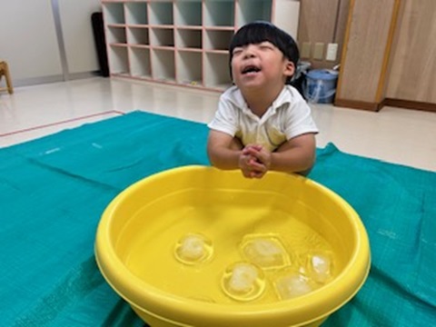 いよいよ夏本番!今回は、氷遊びを行いました。 水を張った桶の中に、丸や四角など大小さまざまな氷を浮かべ、氷の感触を味わいました。 氷を触ると、「キャー!冷たい~!」と冷たさを感じる姿が見られました! ほっぺたや腕にも、氷を当ててみながら、夏の暑さも吹き飛ばすくらい、笑顔いっぱいのくまグループさんでした♪