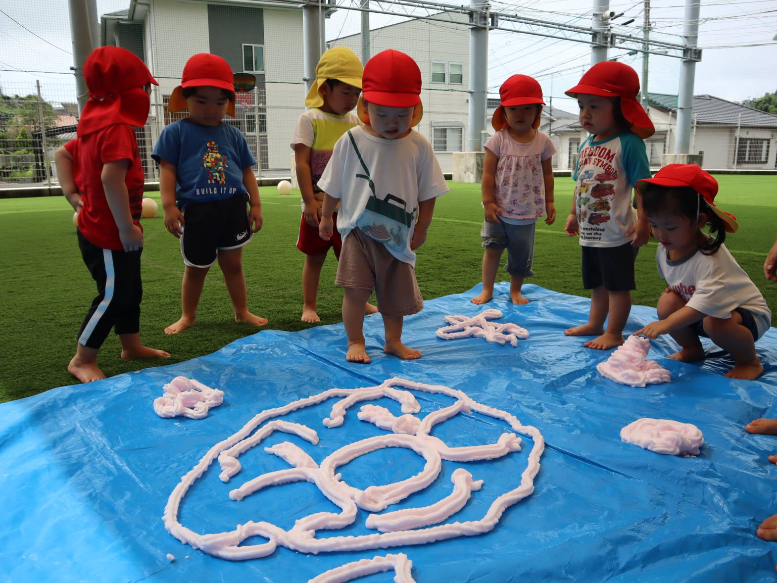 先日のおむすびの日に、園庭で泡遊びをしました。 スプレーから泡を出すと、「うわー!」、「早く触りたいな。」とわくわくした表情を見せる子どもたち。 手に取ってみると、「ふわふわしてるね。」、「良い匂いがする。」とそれぞれで感触を確かめる姿が見られました。 思う存分、全身で泡を楽しんだぱんだ組さん! 「泡楽しかった!」、「また泡しようね。」と泡遊びに大満足だったようです。