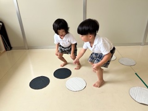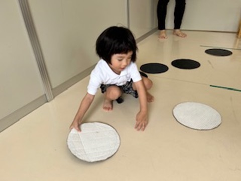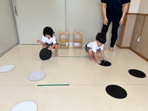 今回は、ひっくり返し競争に挑戦しました。 訓練室いっぱいに広げられた、直径20㎝程のオセロを1枚ずつひっくり返します。 どこに黒があるか、白があるか、周りを見渡しながら、ひっくり返していく姿が見られました。 お友だちと、時間内に何枚多くひっくり返すことができるか競争もしました! 時間いっぱい取り組み、最後はみんなで一緒に枚数を数え、 勝った際は、笑顔いっぱいジャンプして喜ぶくまグループさんでした♪
