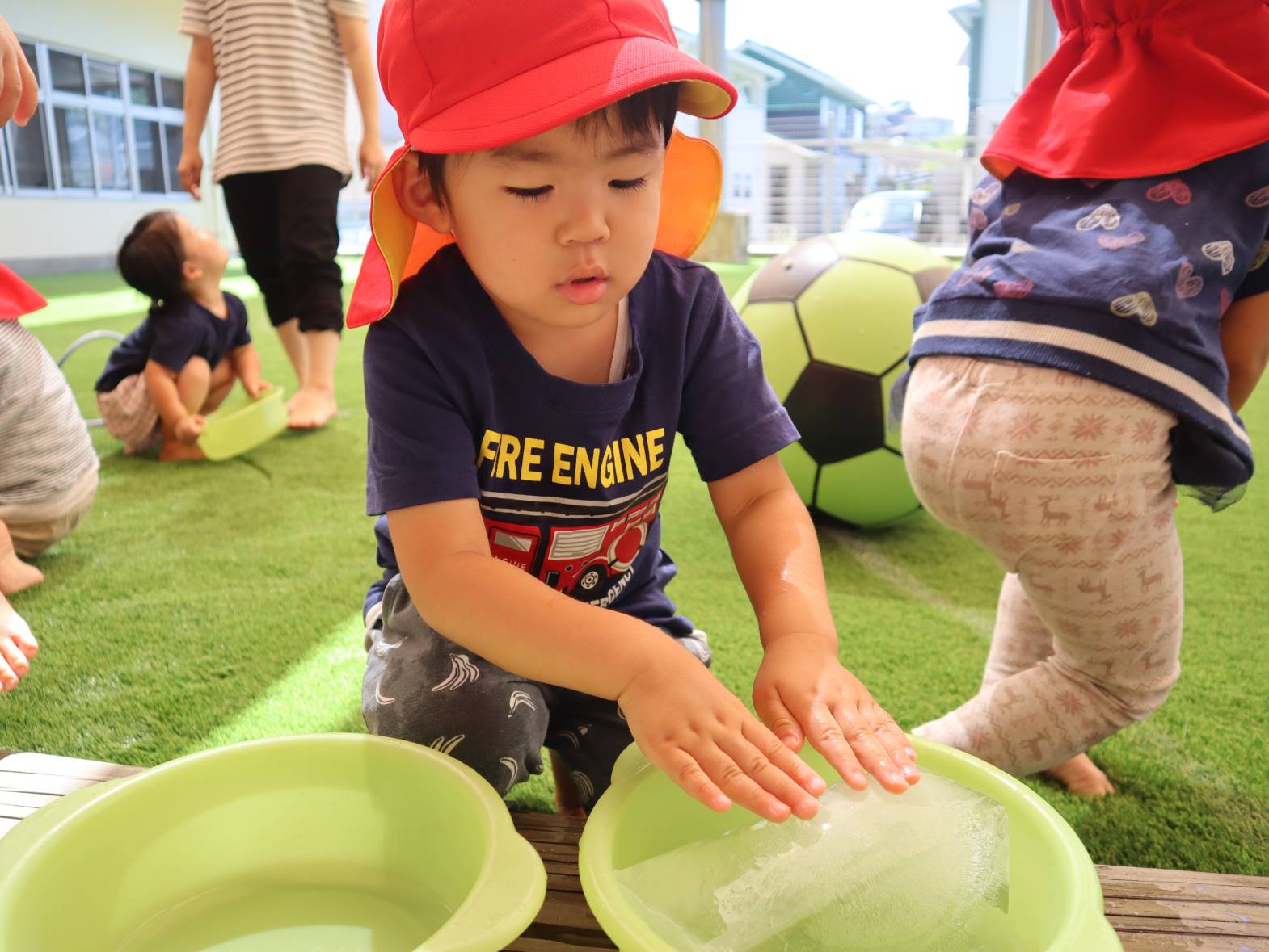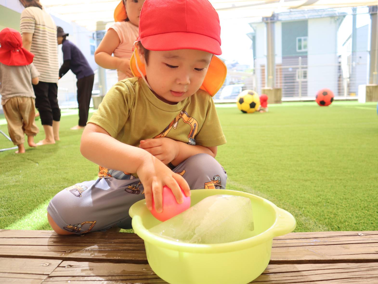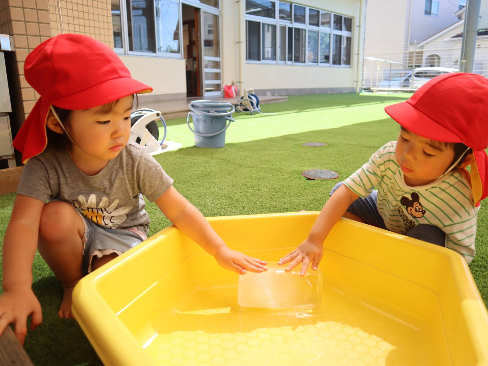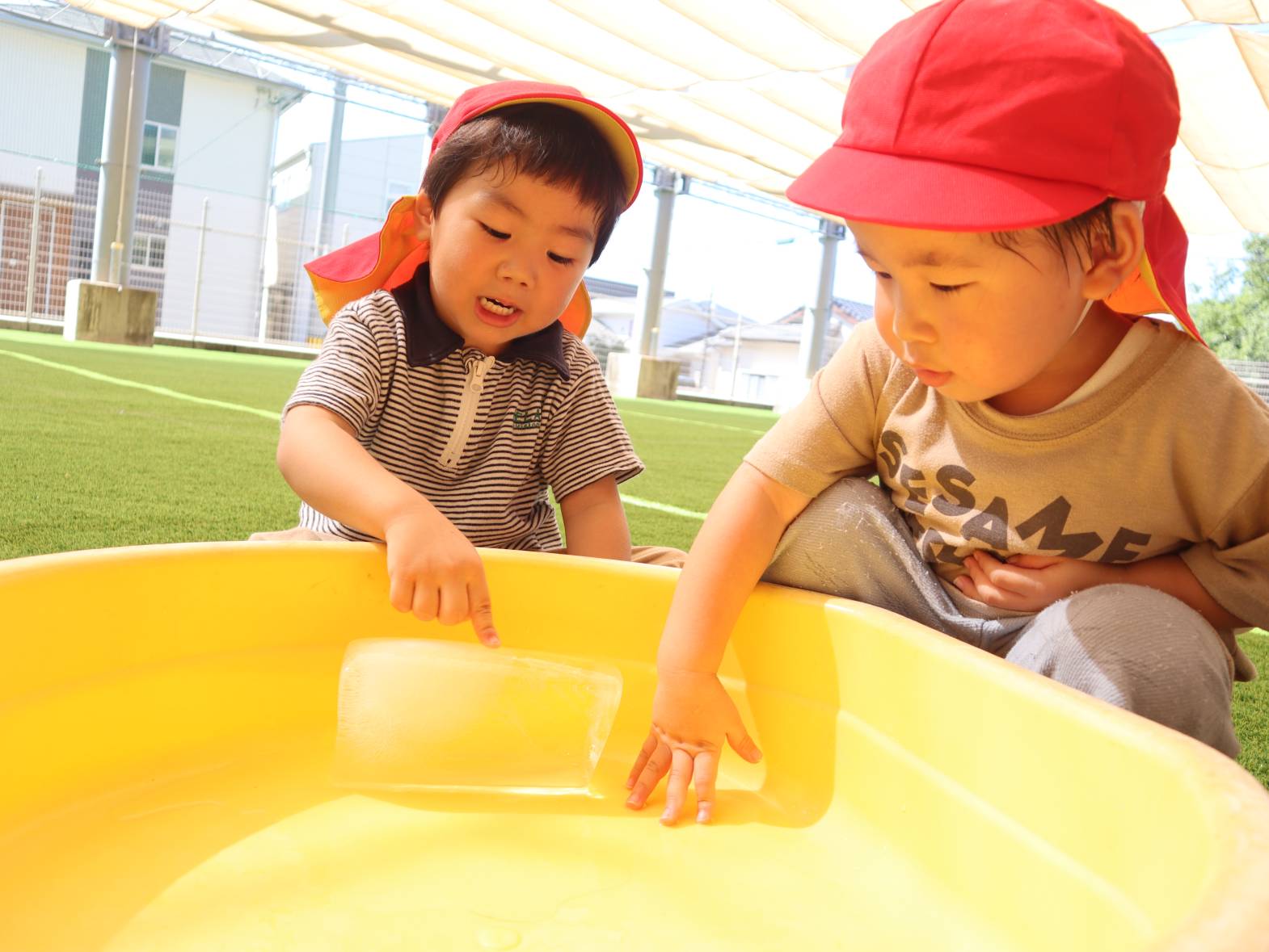 牛乳パックで大きな氷を作りました。 「わあー!」、「冷たーい!」と大はしゃぎの子どもたち。 「四角だね。」、「少し溶けてきたよ。」と形に興味を持ったり、触ることで少しずつ溶けていく様子を楽しんだりする姿が見られました。 暑さの厳しい日が続いていますが、水や氷などで少しでも涼んで過ごせたらと思います。