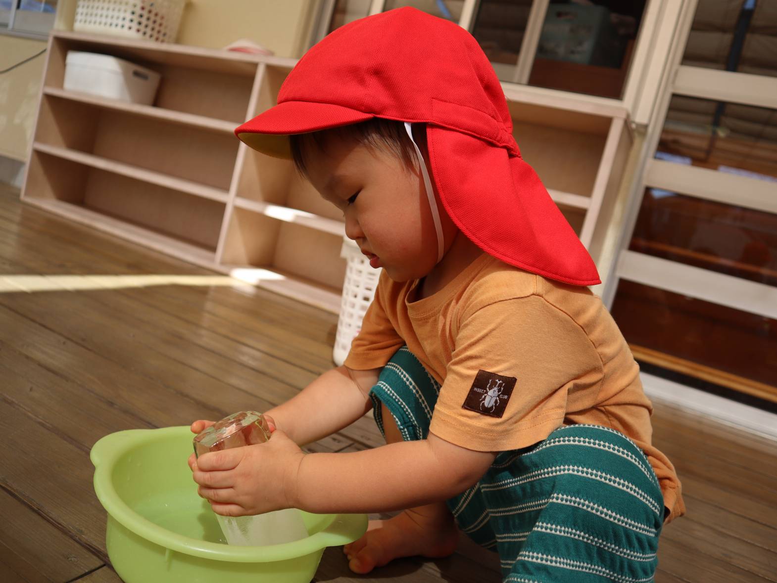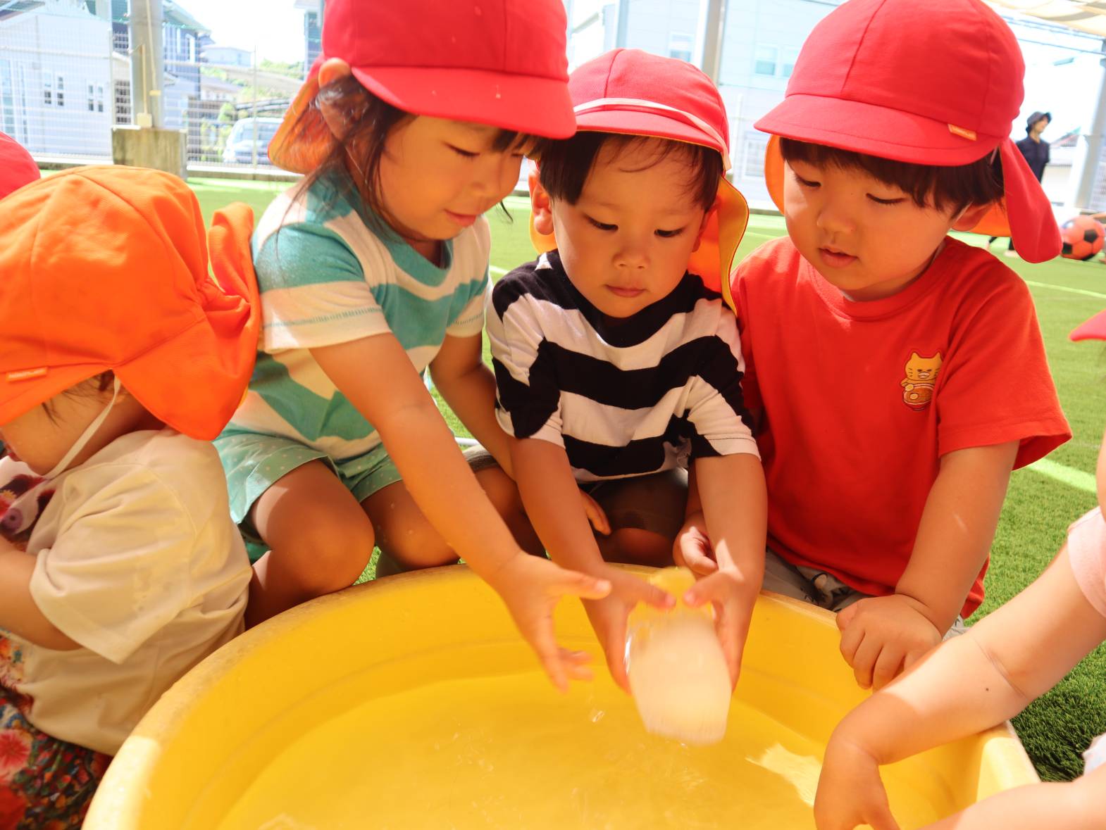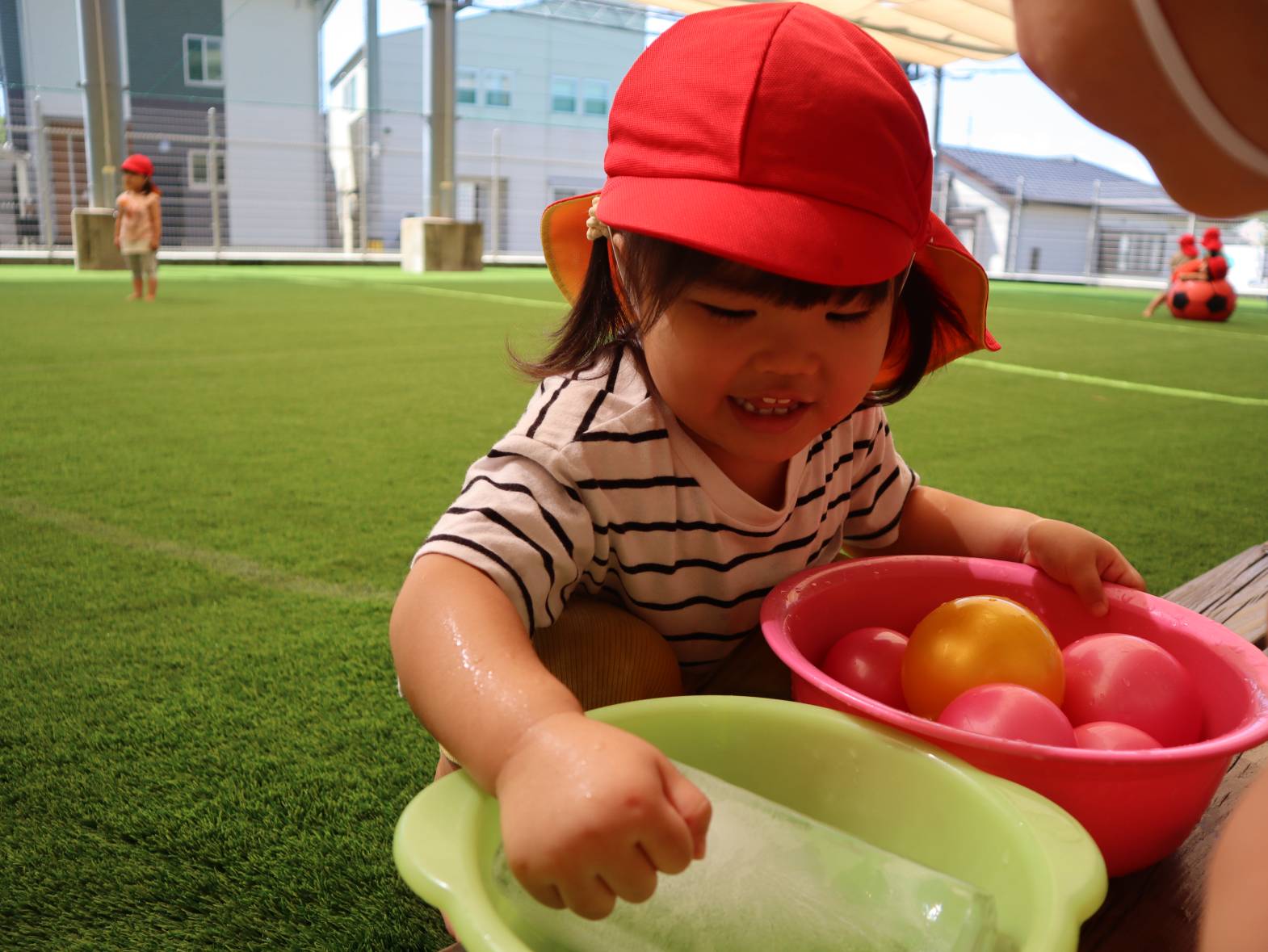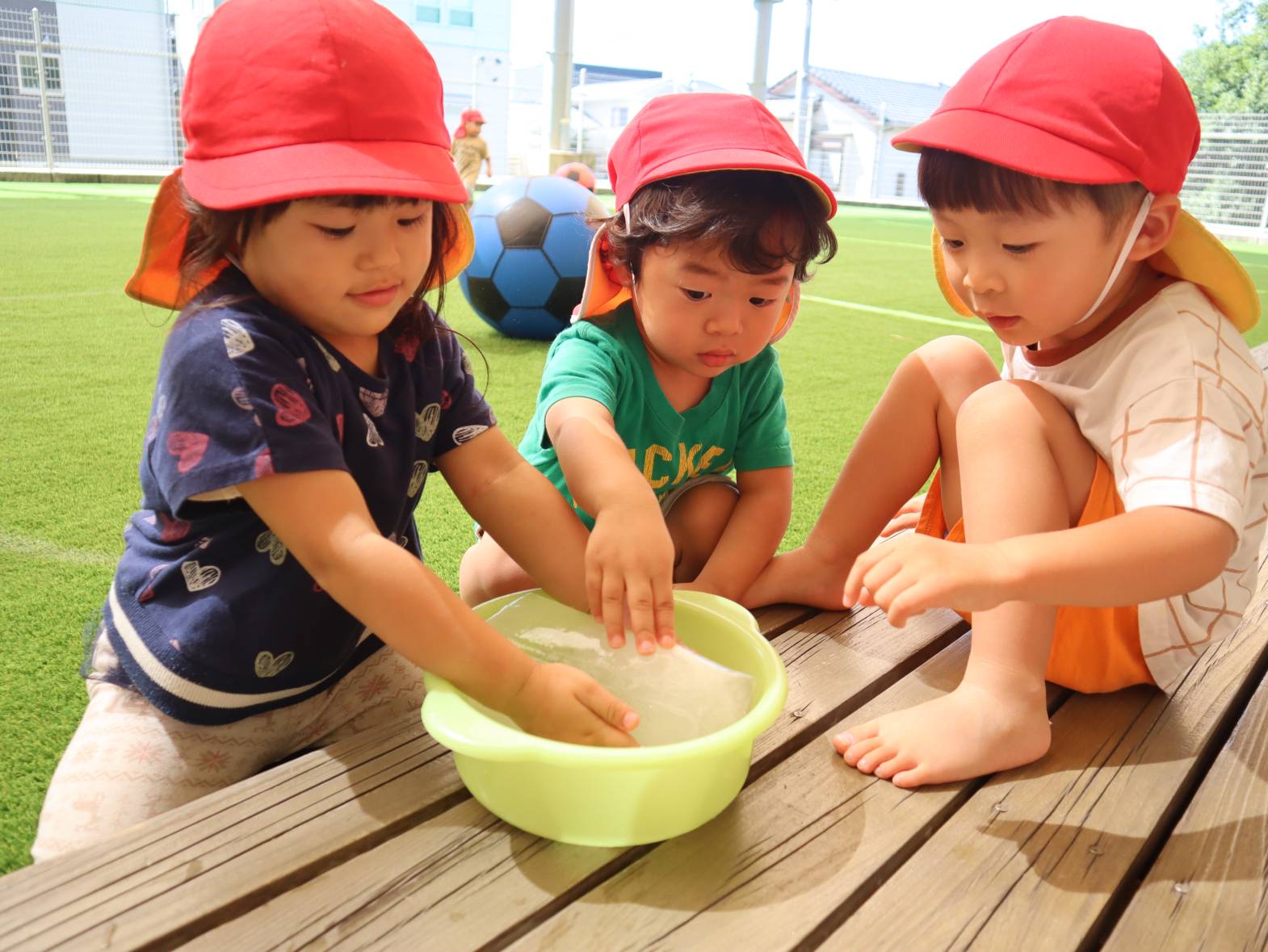 牛乳パックで大きな氷を作りました。 「わあー!」、「冷たーい!」と大はしゃぎの子どもたち。 「四角だね。」、「少し溶けてきたよ。」と形に興味を持ったり、触ることで少しずつ溶けていく様子を楽しんだりする姿が見られました。 暑さの厳しい日が続いていますが、水や氷などで少しでも涼んで過ごせたらと思います。
