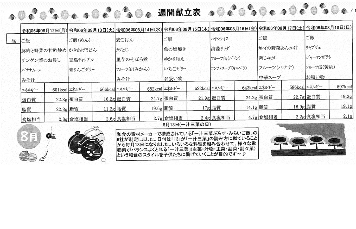 8月12日(月)~8月18日(日)の献立表になります。ぜひご覧ください。
