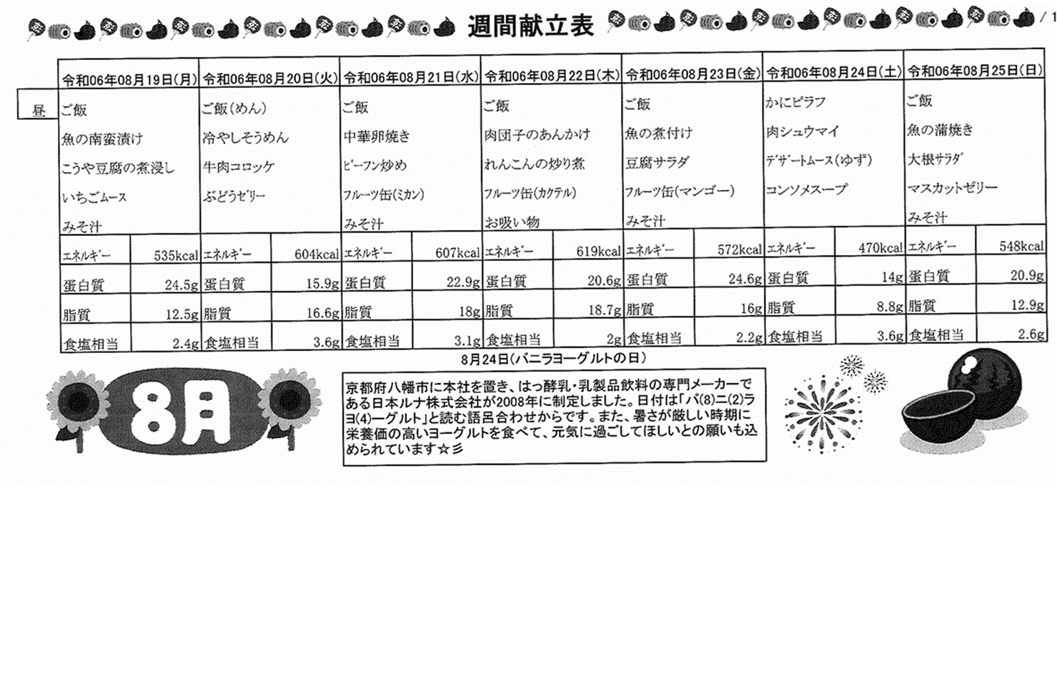 8月19日(月)~8月25日(日)の献立表になります。ぜひご覧ください。
