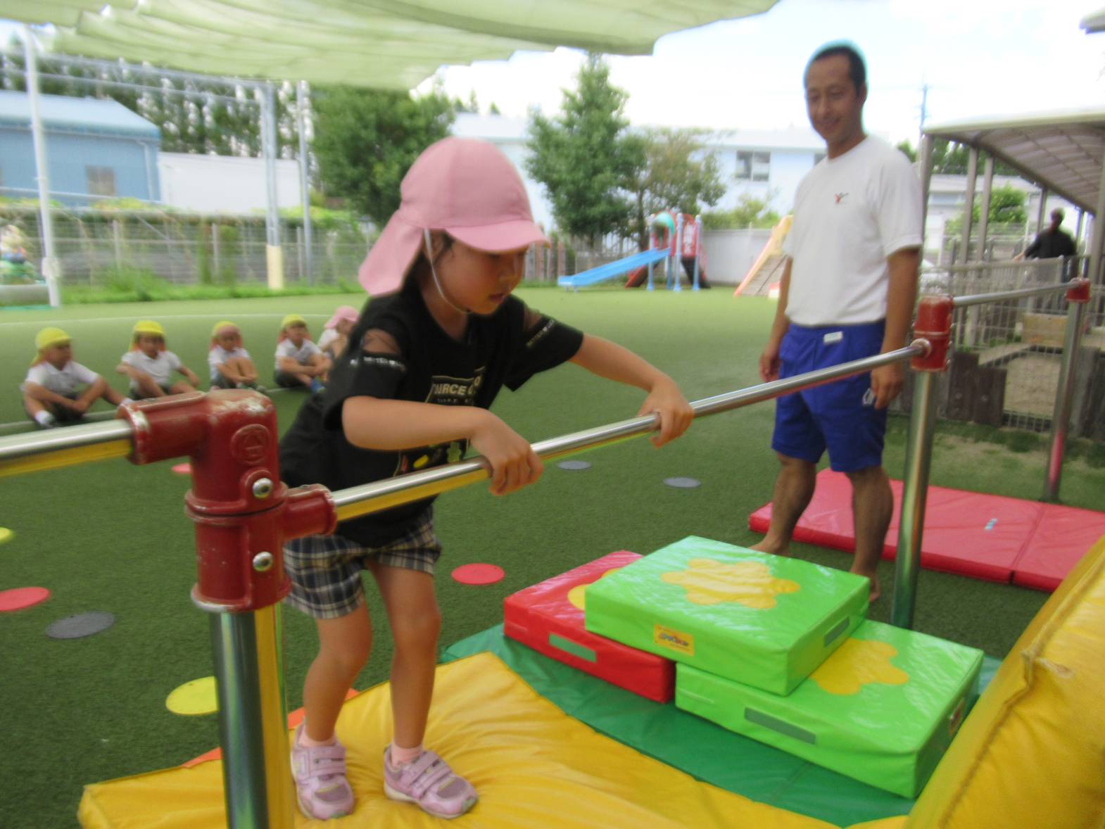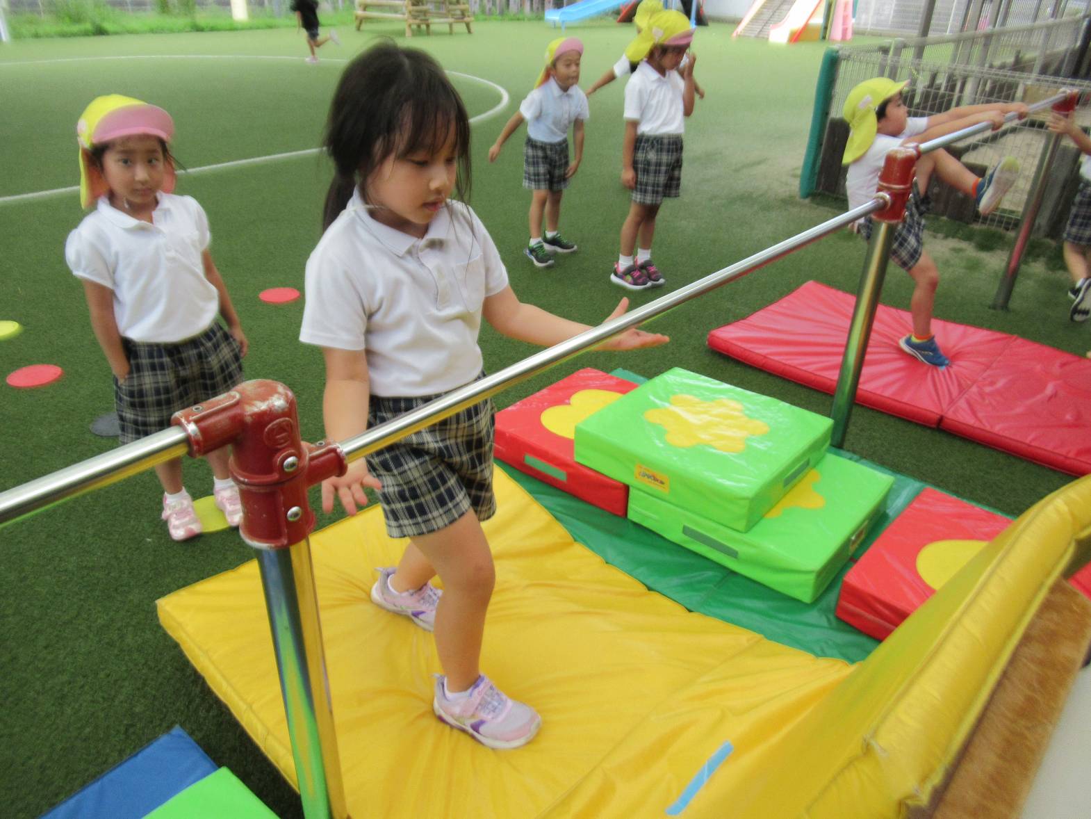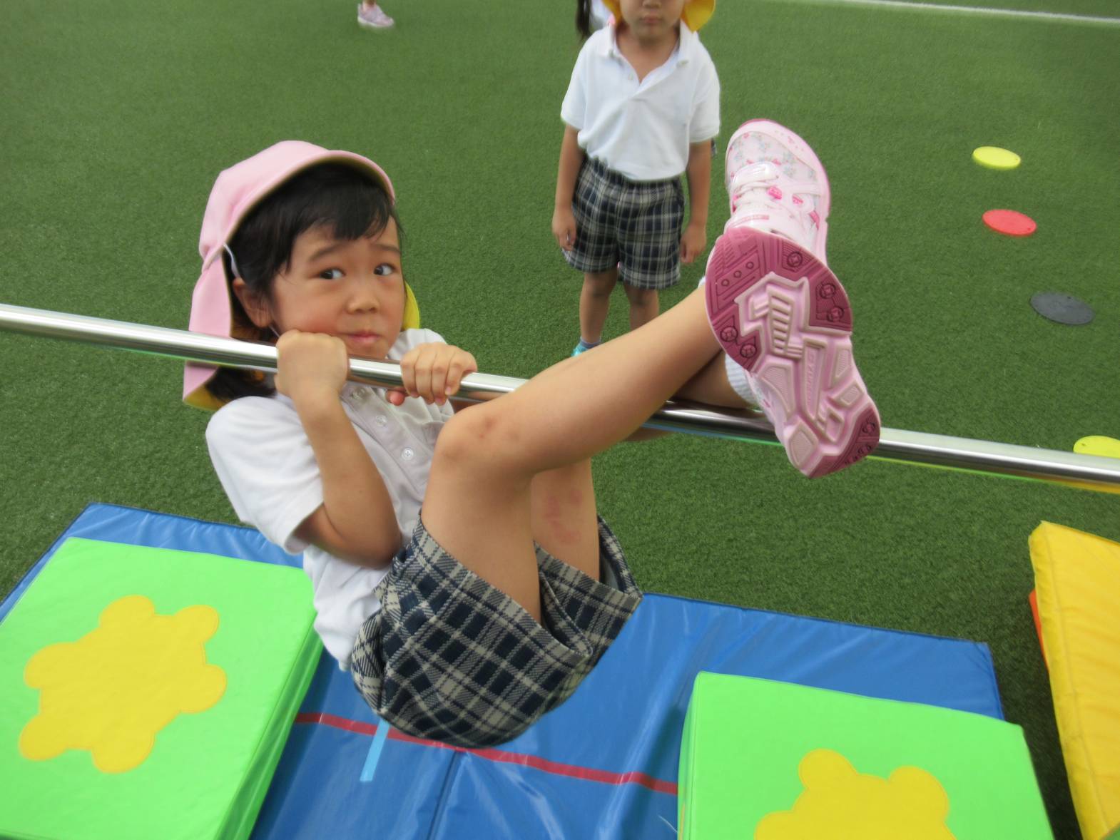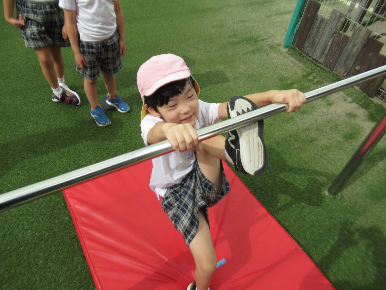 今週は運動遊びがありました。 まずは準備体操!体をほぐしていきます。 準備運動の後は、鉄棒に挑戦していきます! ぶたのまるやきや足抜き回り、逆上がり等、自分ができる技を取り組む子どもたち。 汗をかきながらも何度も挑戦し、「逆上がりできるようになった!」と成功すると達成感でいっぱいのきりん組さんでした。