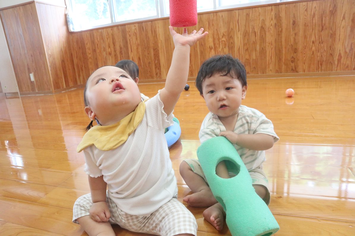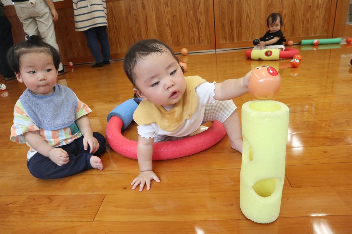 体を動かすことが大好きなひよこ組さん。 最近では、広いお部屋をハイハイや歩行をして楽しく遊んでいます。 身近な玩具にもどんどん興味が出てきていて、楽しく遊ぶ子どもたち! これからも体をたくさん体を動かせるよう、色々な活動を行っていきたいと思います!