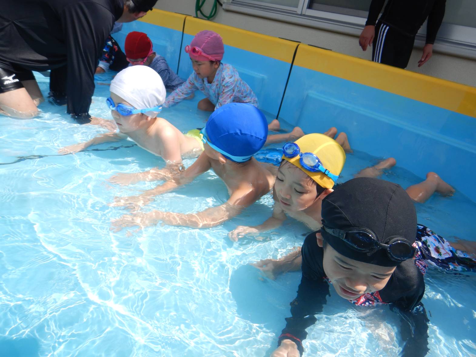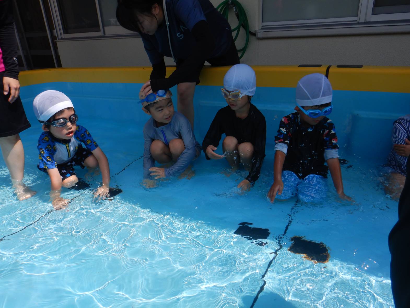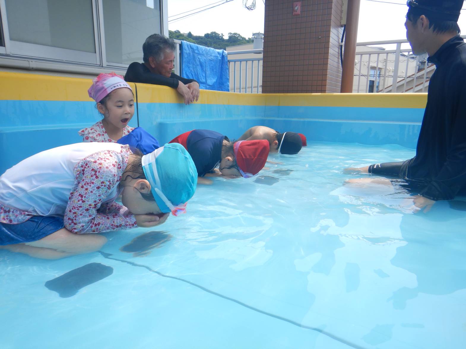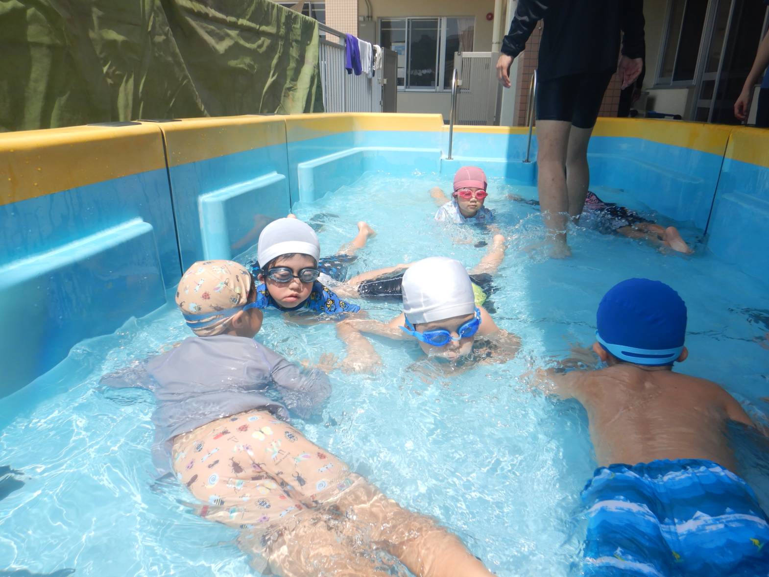 今週の運動遊はプール活動でした。 初めてのプールということもありドキドキの子どもたち。 水に入ると「気持ちいね!」と嬉しそうな姿が見られました。 顔をつける練習では「できたよ!」と嬉しそうに教えてくれるきりん組さんでした。