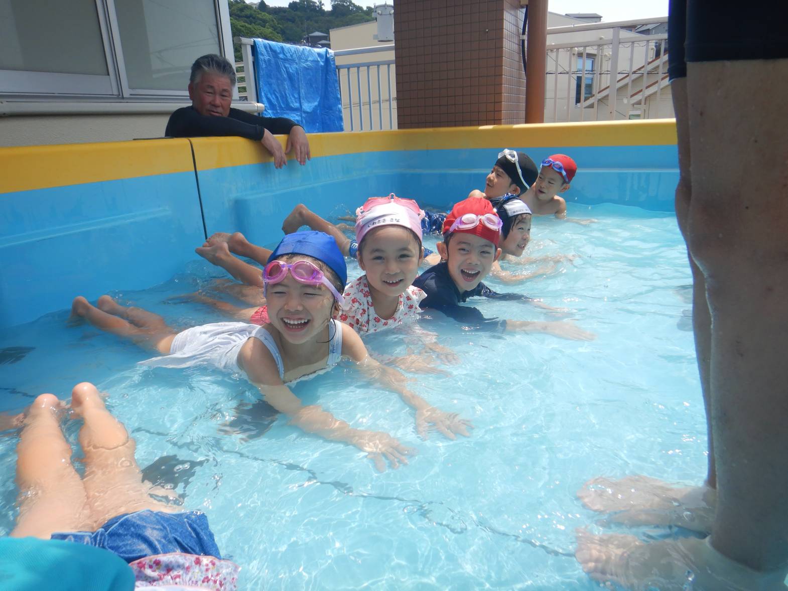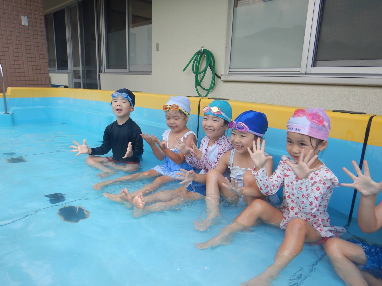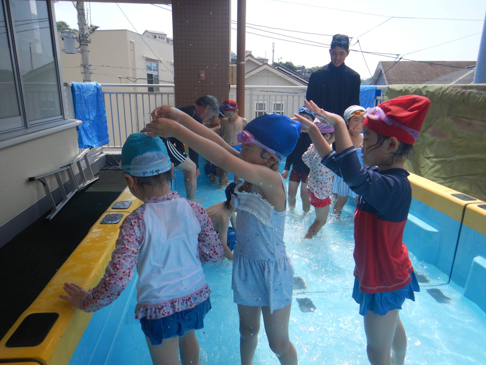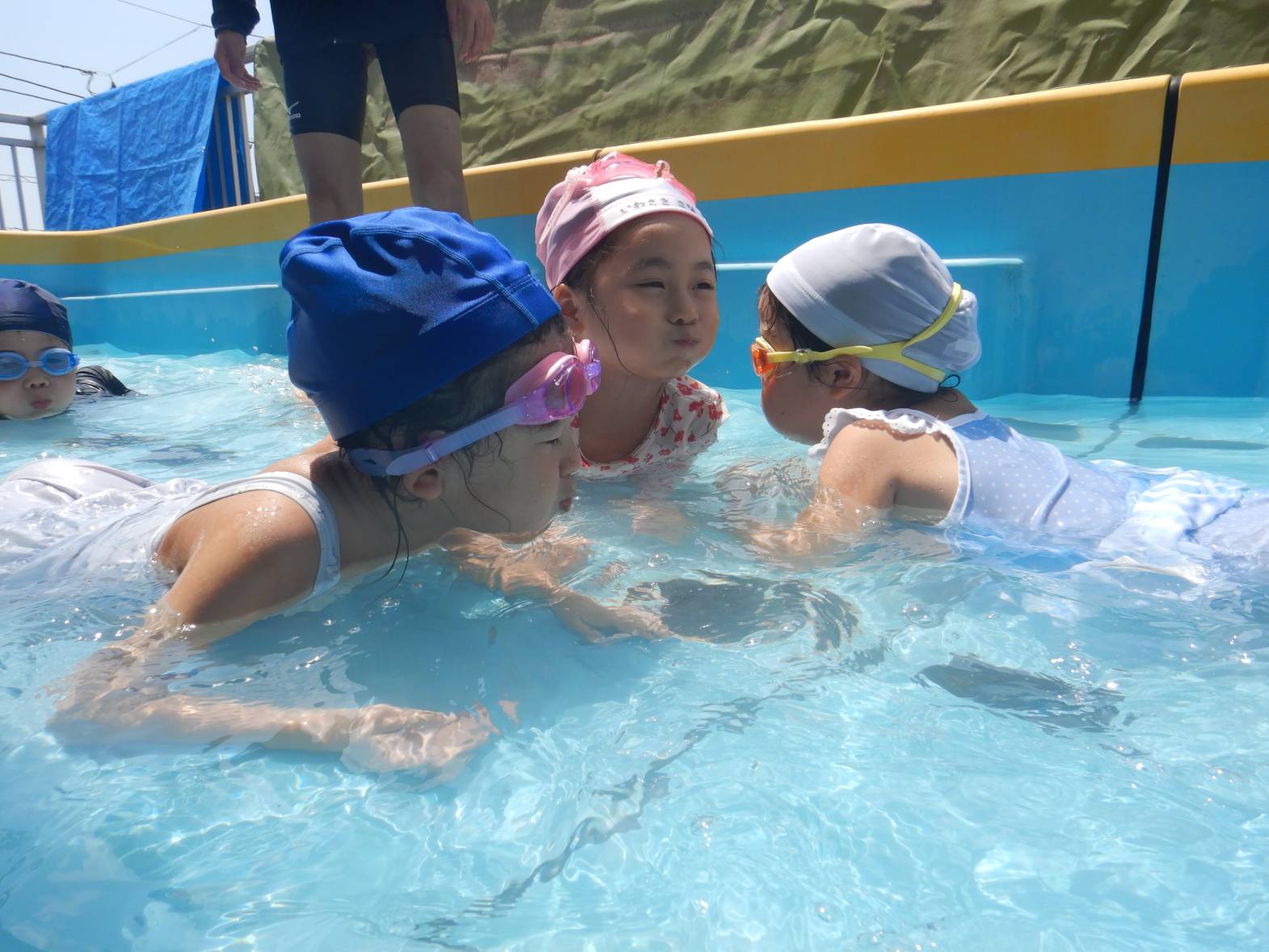 今週の運動遊はプール活動でした。 初めてのプールということもありドキドキの子どもたち。 水に入ると「気持ちいね!」と嬉しそうな姿が見られました。 顔をつける練習では「できたよ!」と嬉しそうに教えてくれるきりん組さんでした。