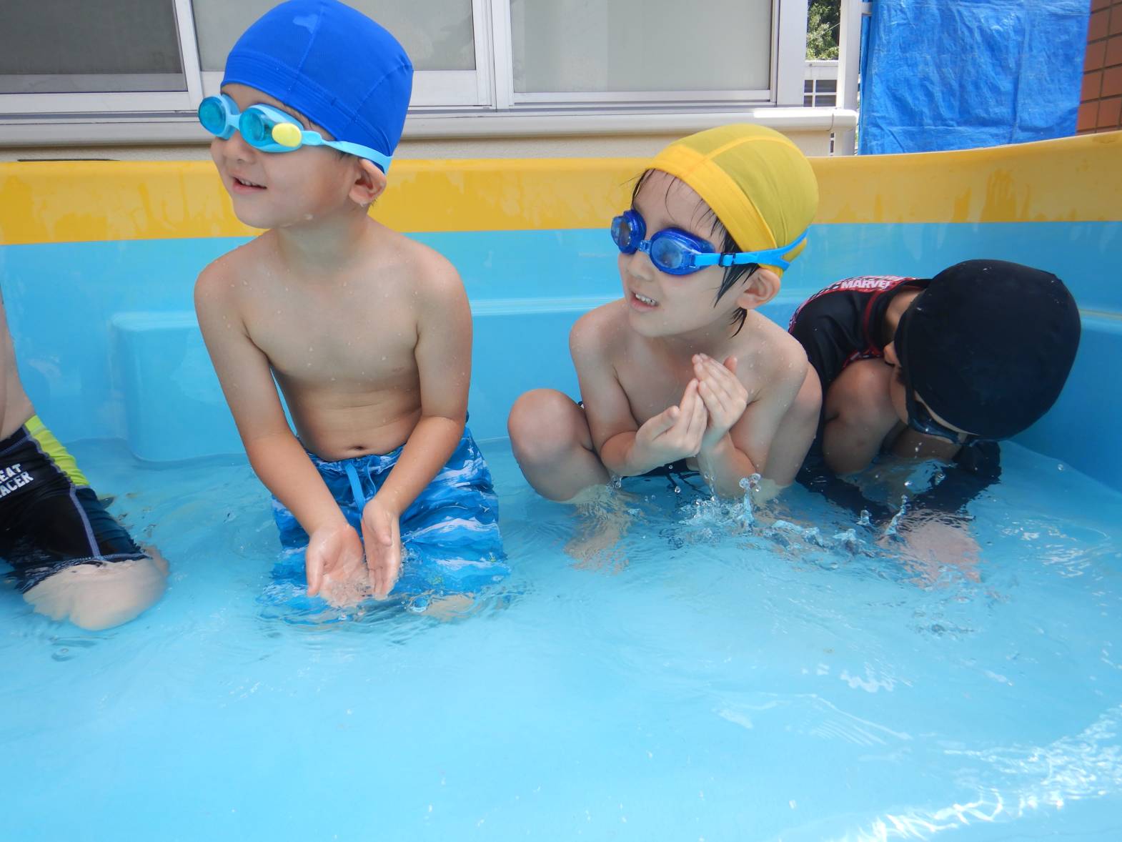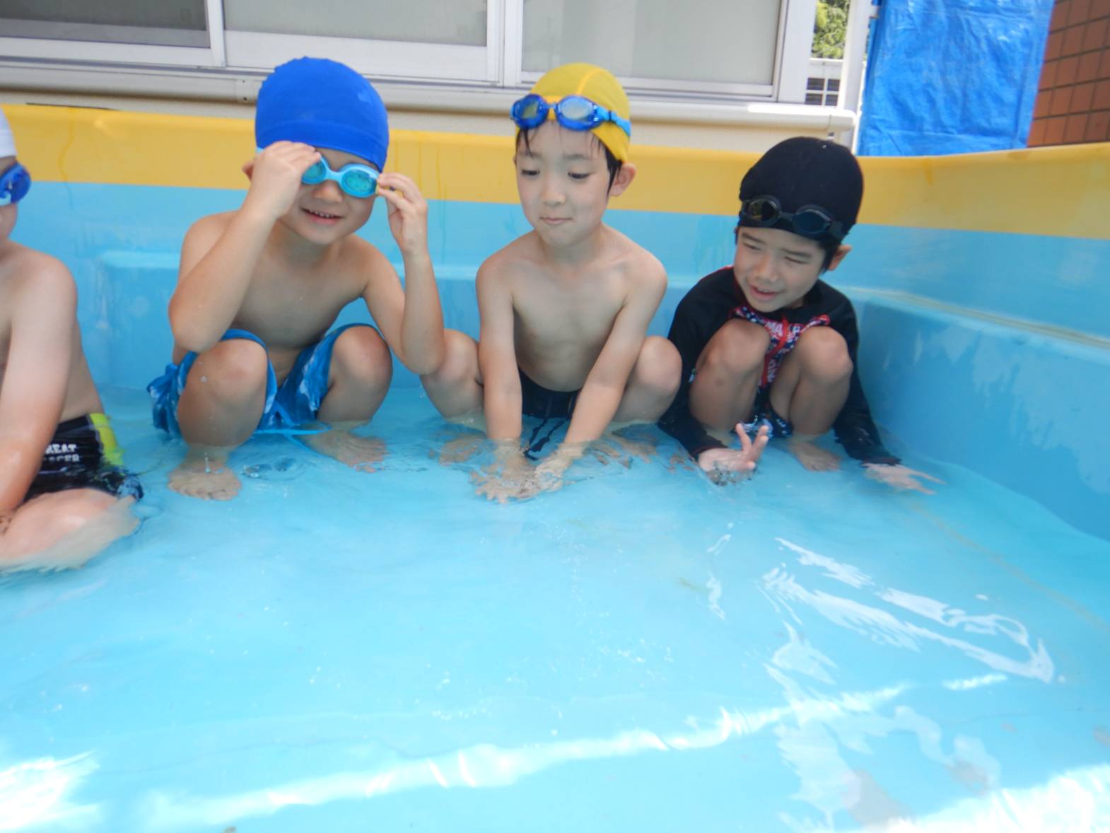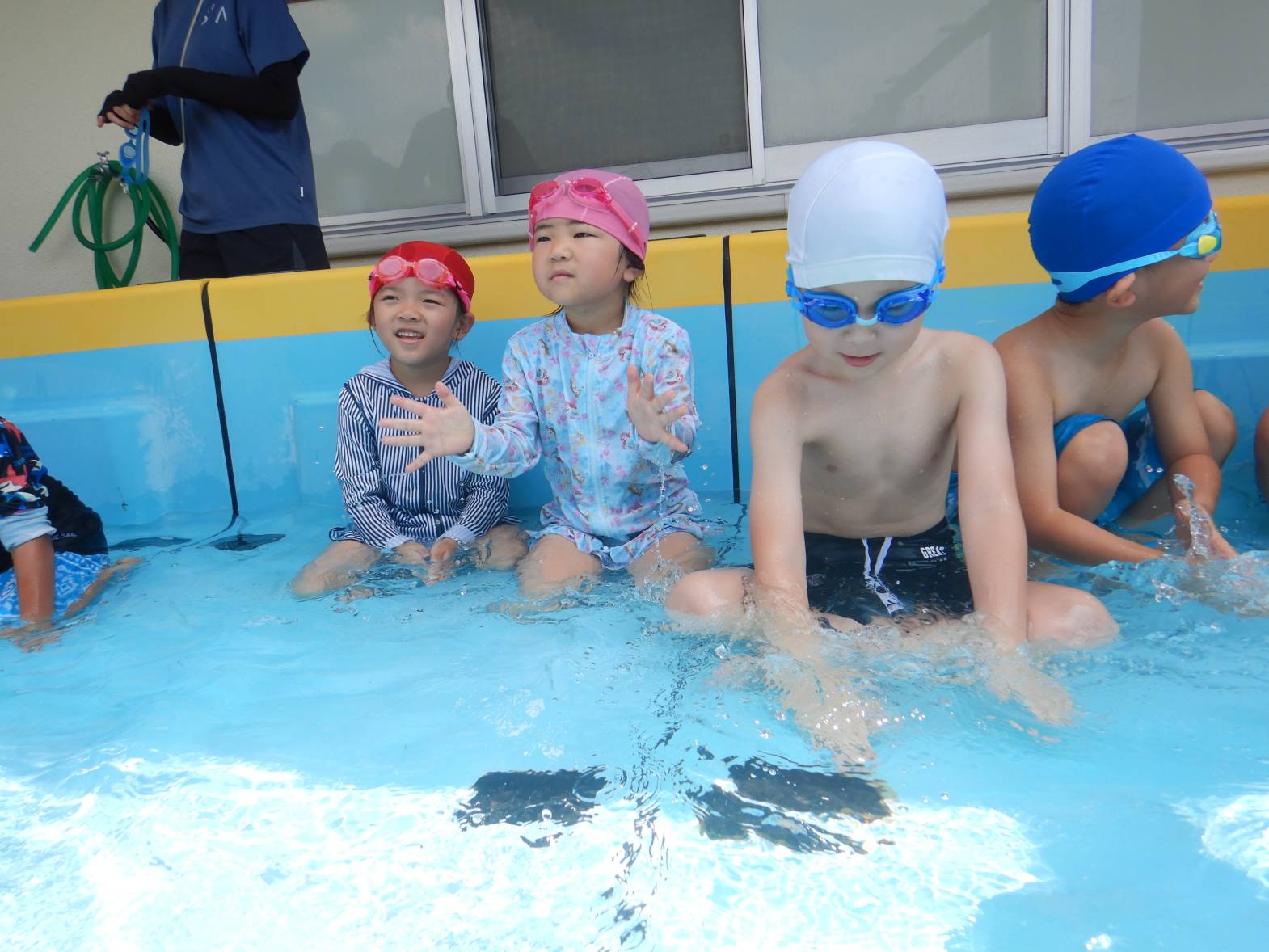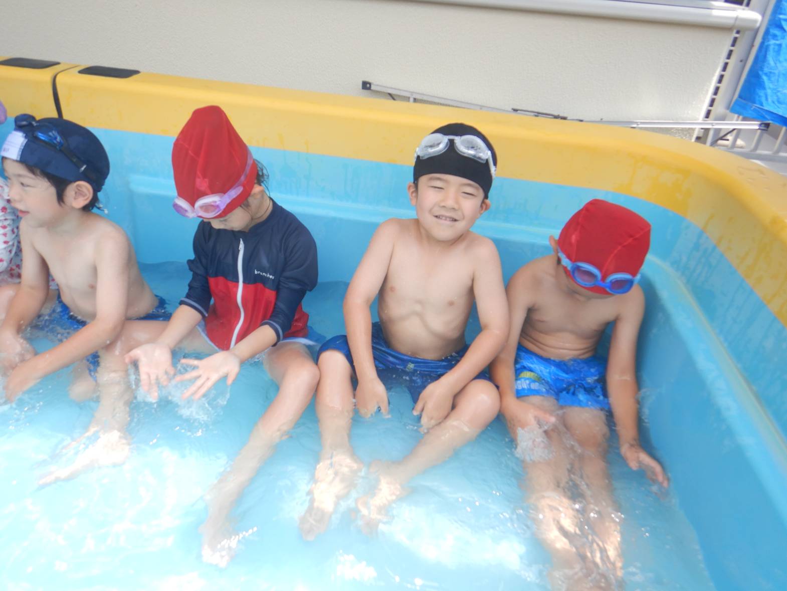 今週の運動遊はプール活動でした。 初めてのプールということもありドキドキの子どもたち。 水に入ると「気持ちいね!」と嬉しそうな姿が見られました。 顔をつける練習では「できたよ!」と嬉しそうに教えてくれるきりん組さんでした。