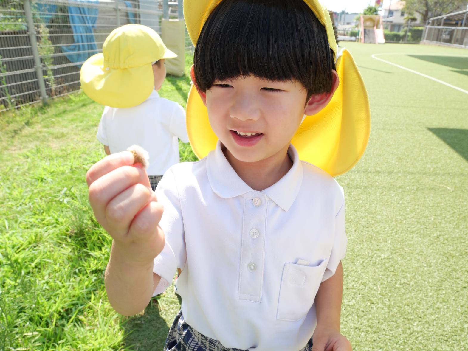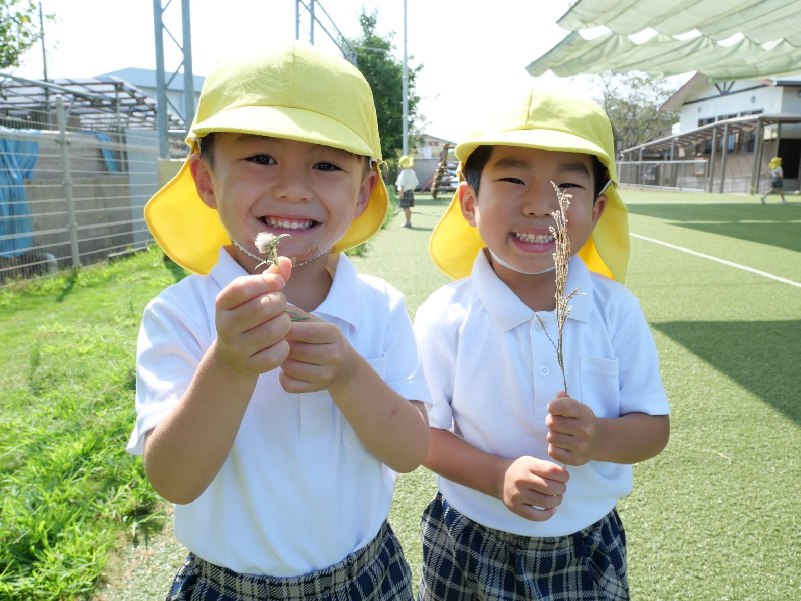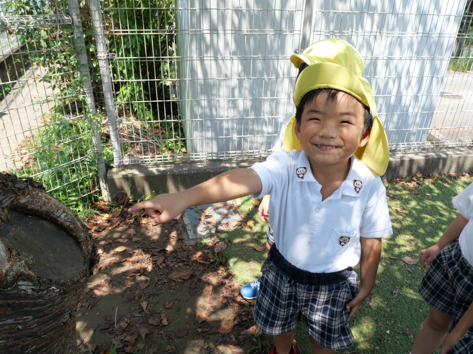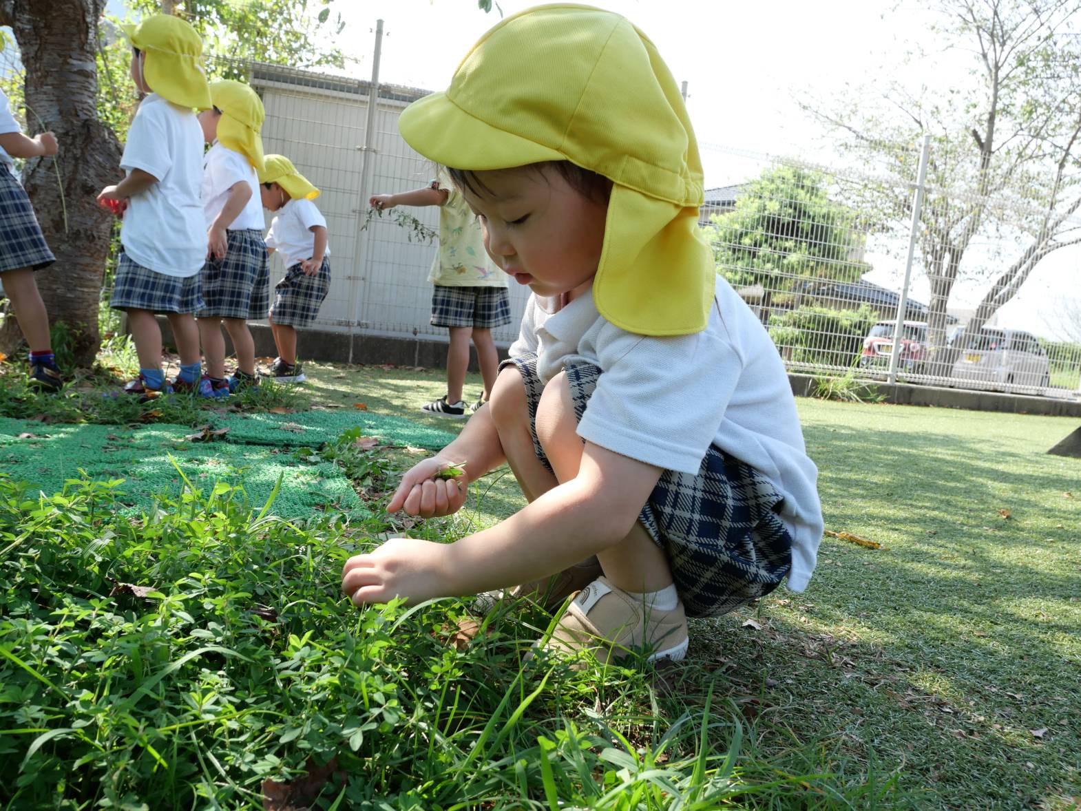 「見て!ここに大きなバッタがいる!」、「あそこにはカマキリがいたよ。」、「この葉っぱは大きいね。と、虫や植物の観察をする姿が見られています。