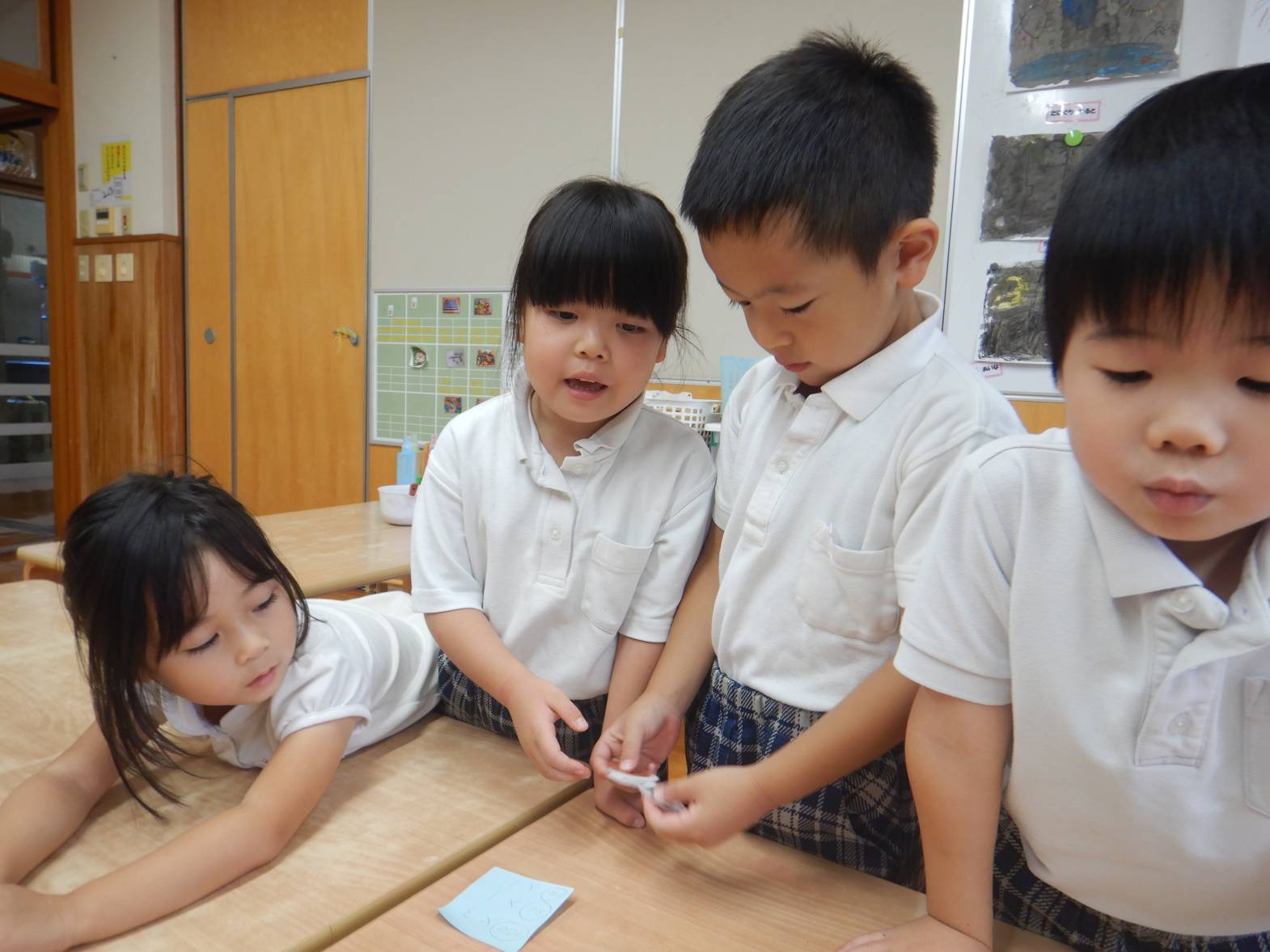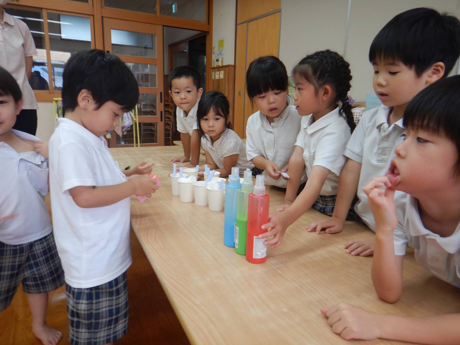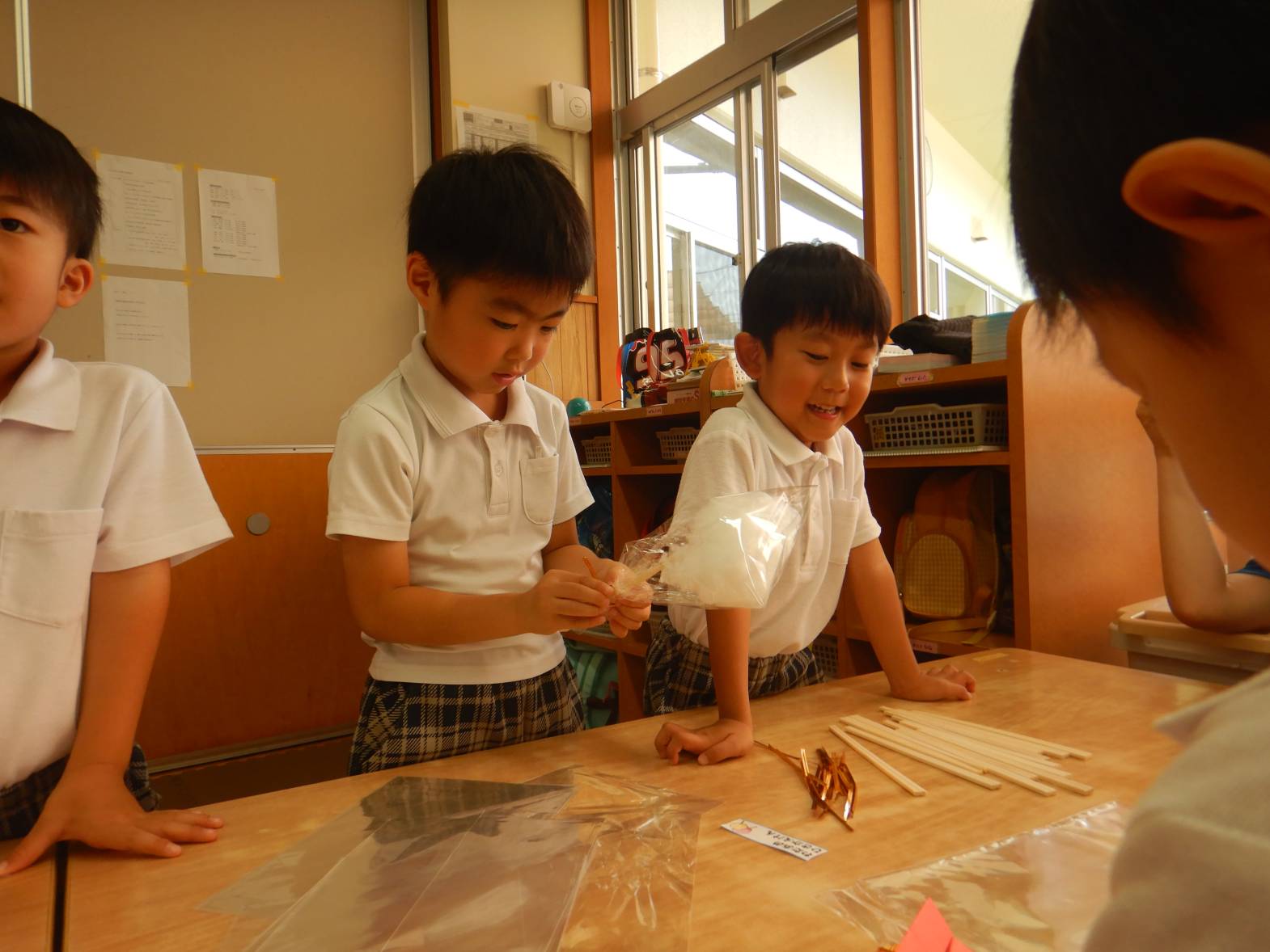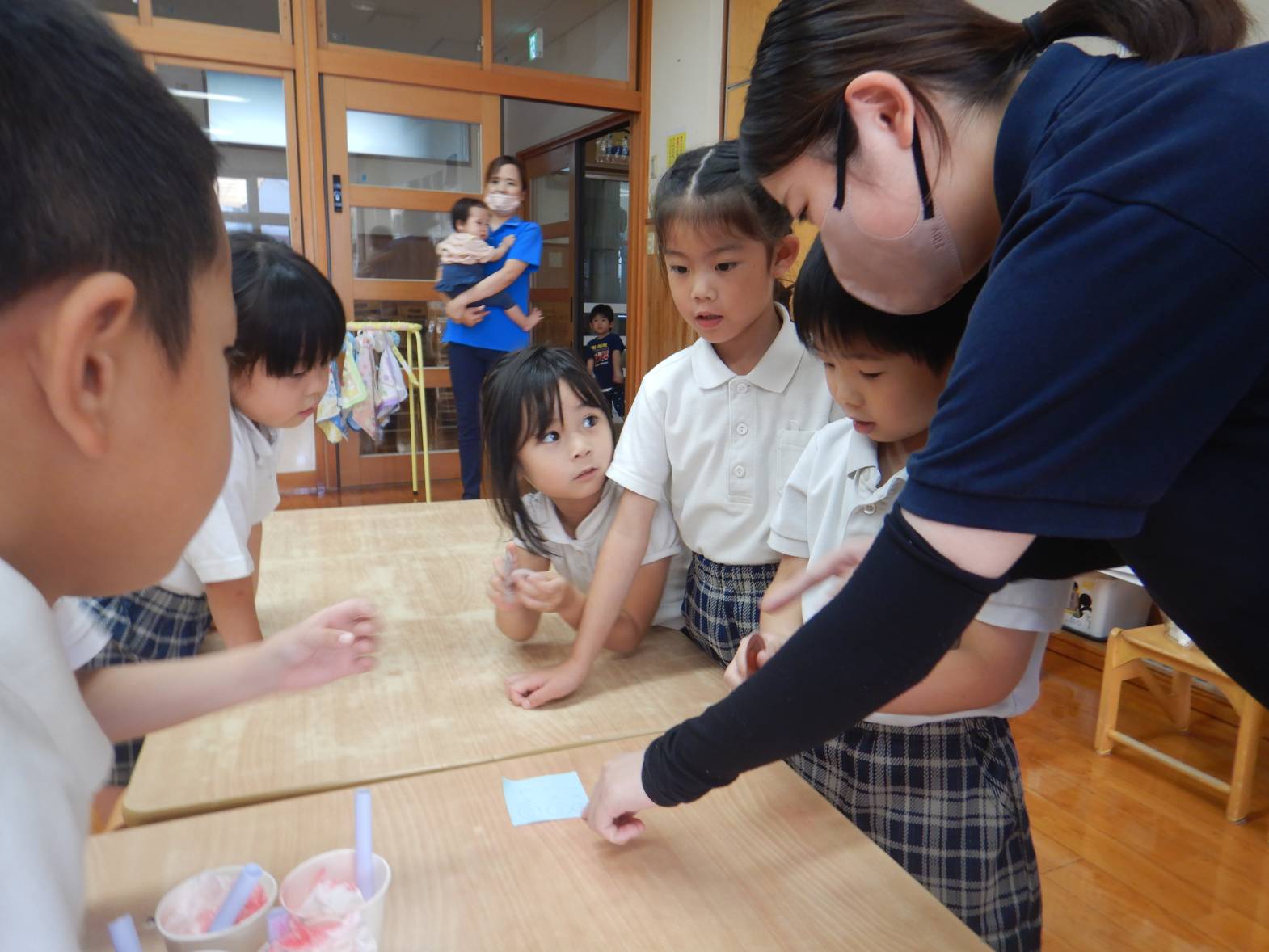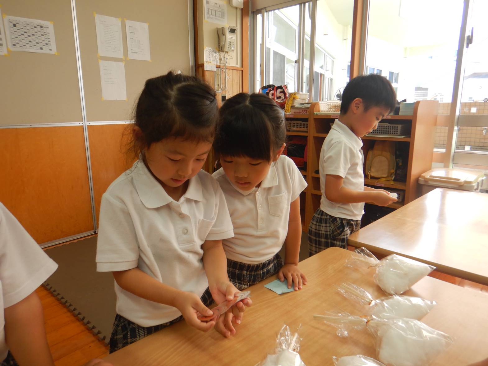 今日は子ども達が待ちに待ったおむすびの日でした。 「お店屋さん早くしたいね!」とウキウキな子どもたち。 りす組さんが買い物に来た際には「いらしゃいませ~」と元気よく呼び込む姿が見られました。 きりん組さん同士のお買い物では紙で作ったお金を使いました。 「100円玉が4個と。」「あと10円足りないよ!」と子どもたちで話す子どもたち。 おにぎりもたくさん食べて満足そうなきりん組さんでした。