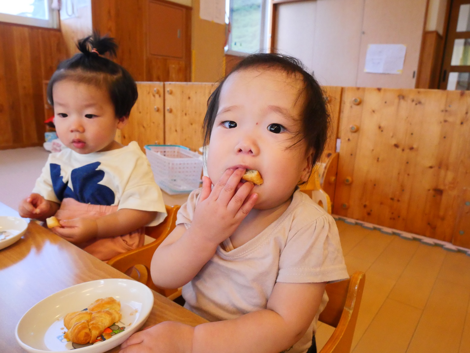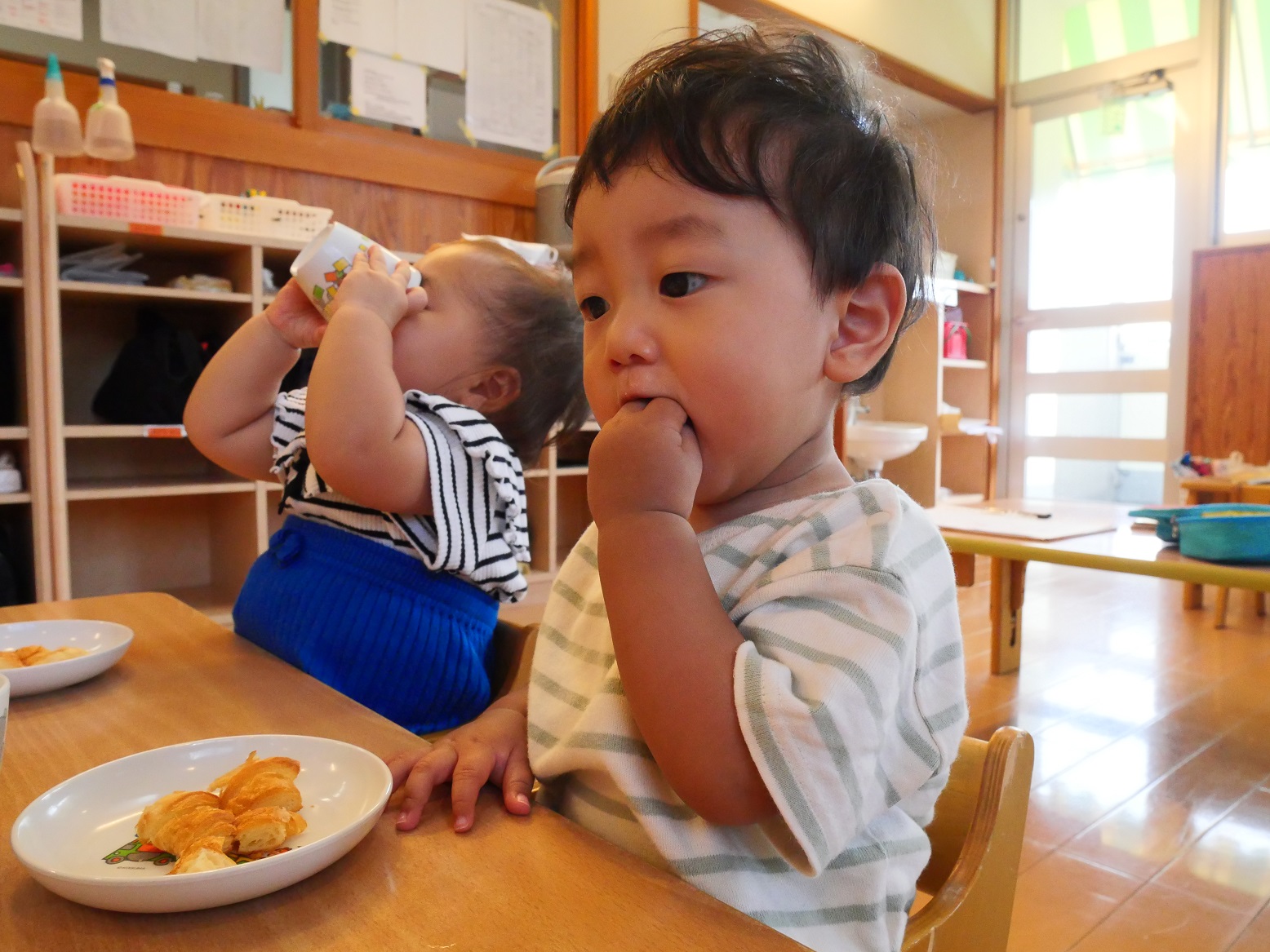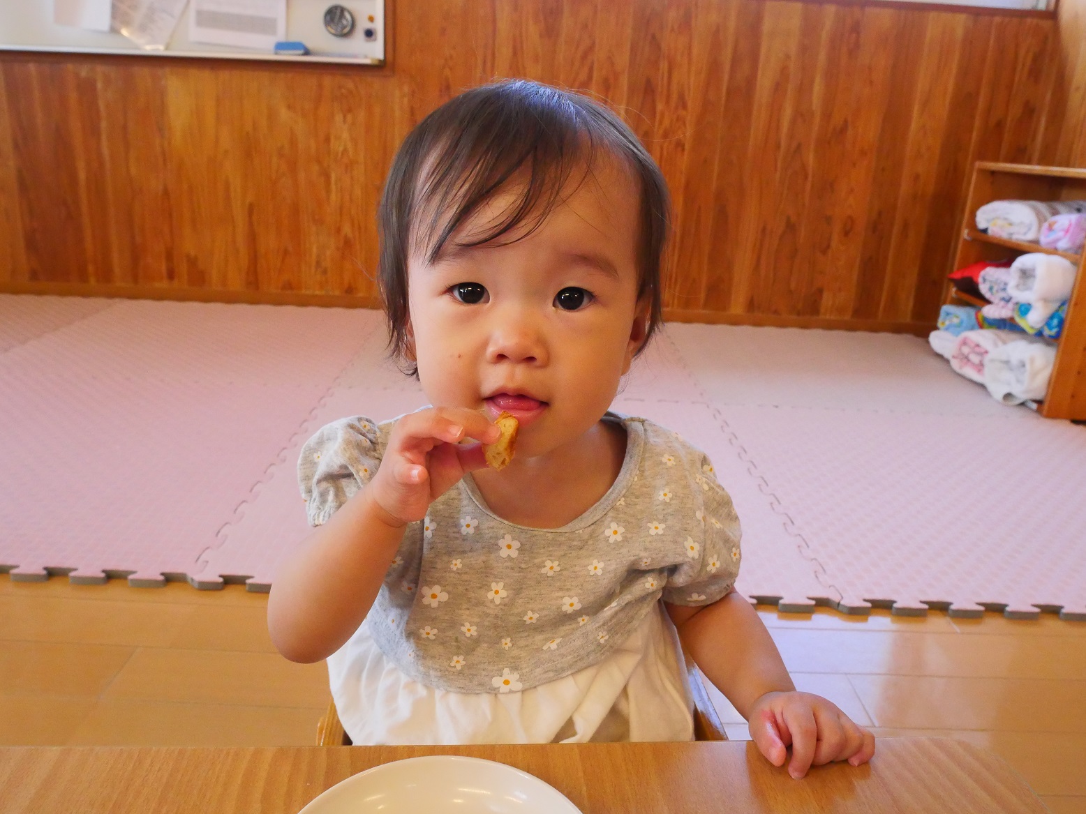 おやつの時間が大好きなひよこ組さん。 朝おやつに午睡明けのおやつ、どちらも待ち切れず、少し涙が出てしまうことも…。 名前を呼ばれると、嬉しそうに椅子に座って、消毒をします。 それが終わったら待ちに待ったおやつです。 大きく口を開けて、パクッ! おいしすぎてつい笑顔がこぼれる子どもたち。 これからも楽しいおやつの時間を過ごせたらと思います。