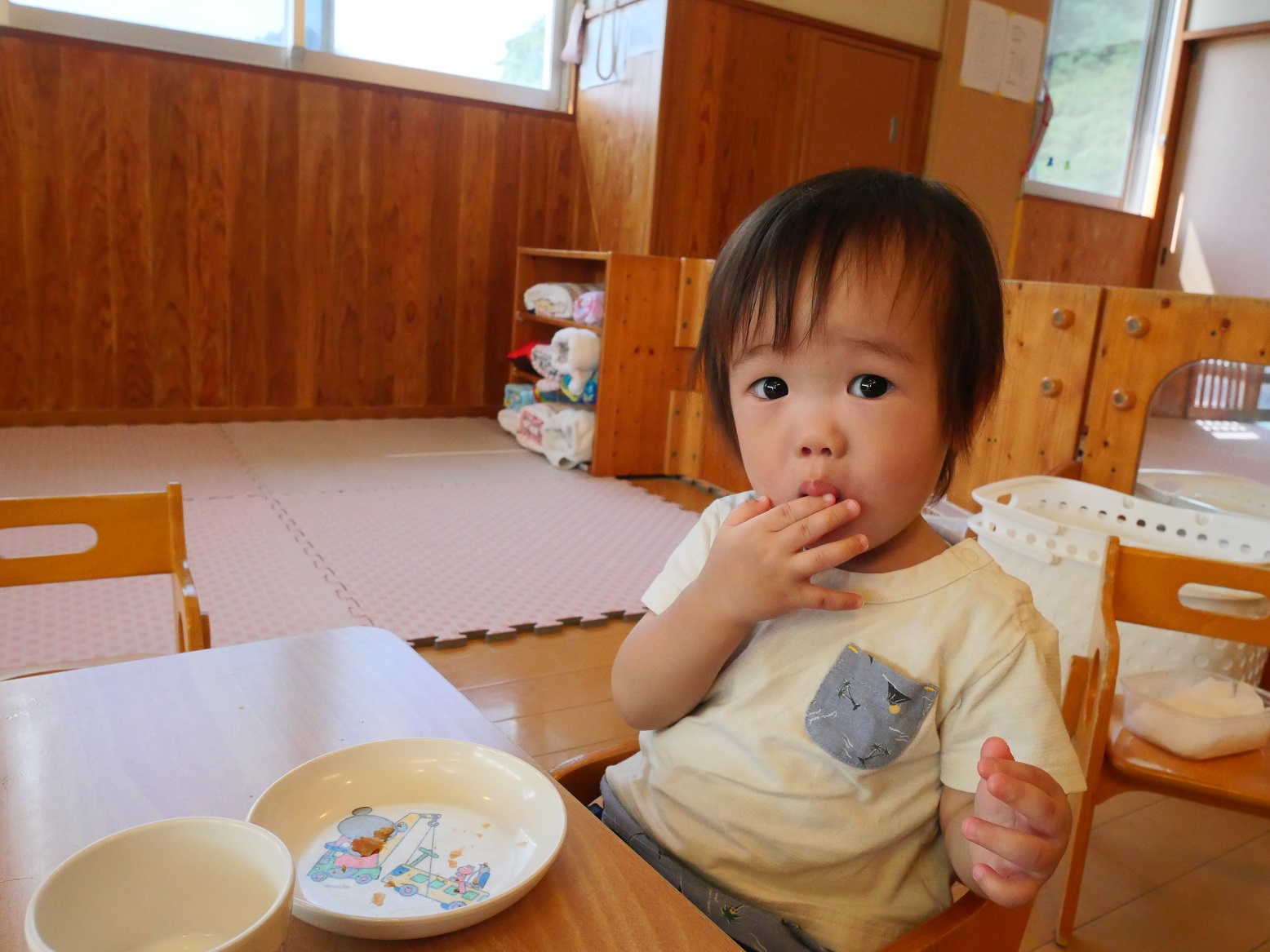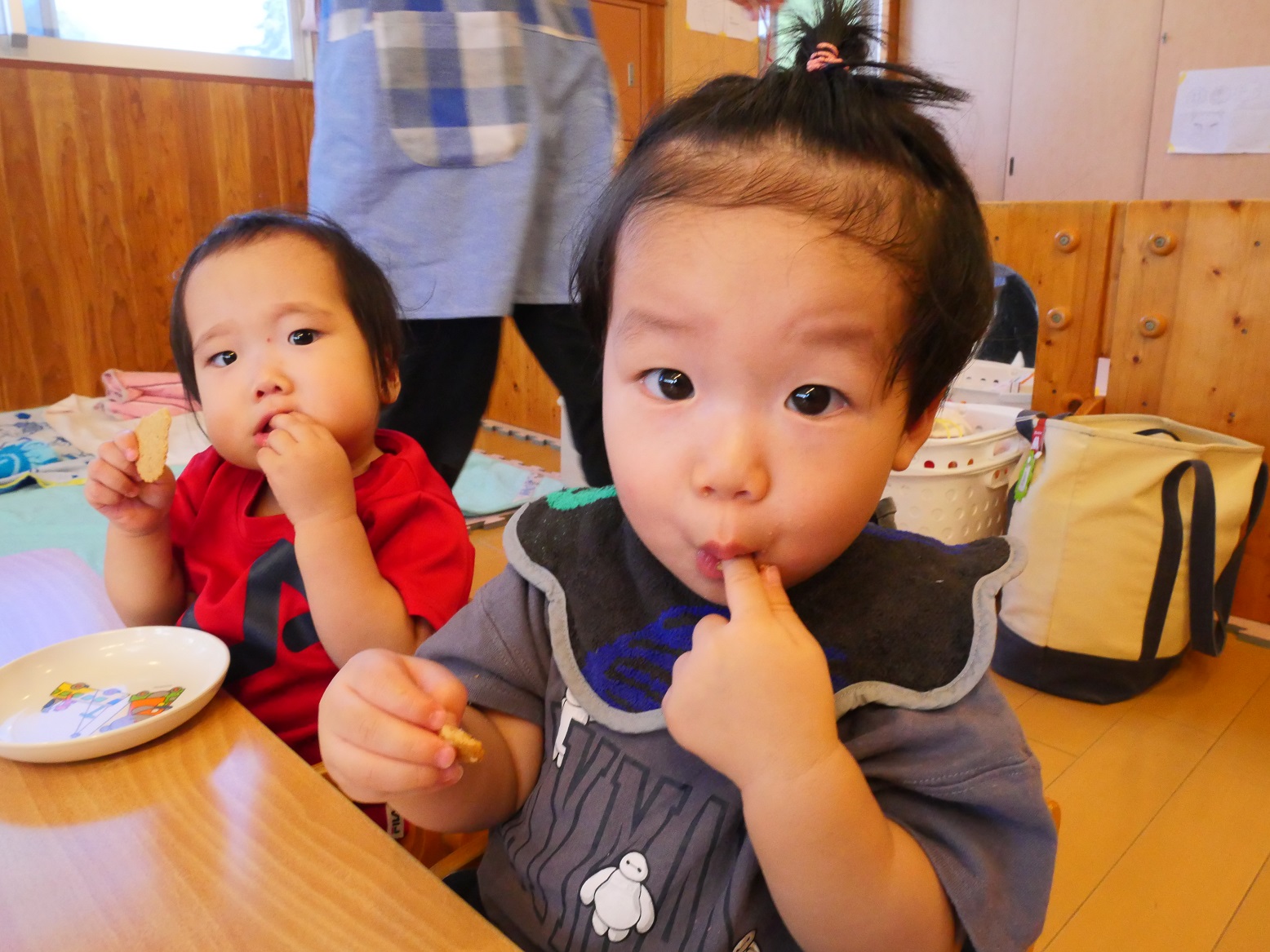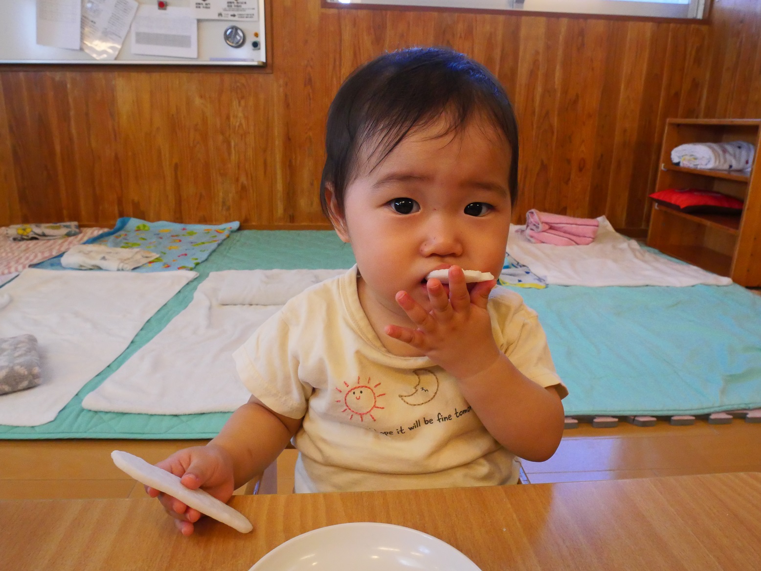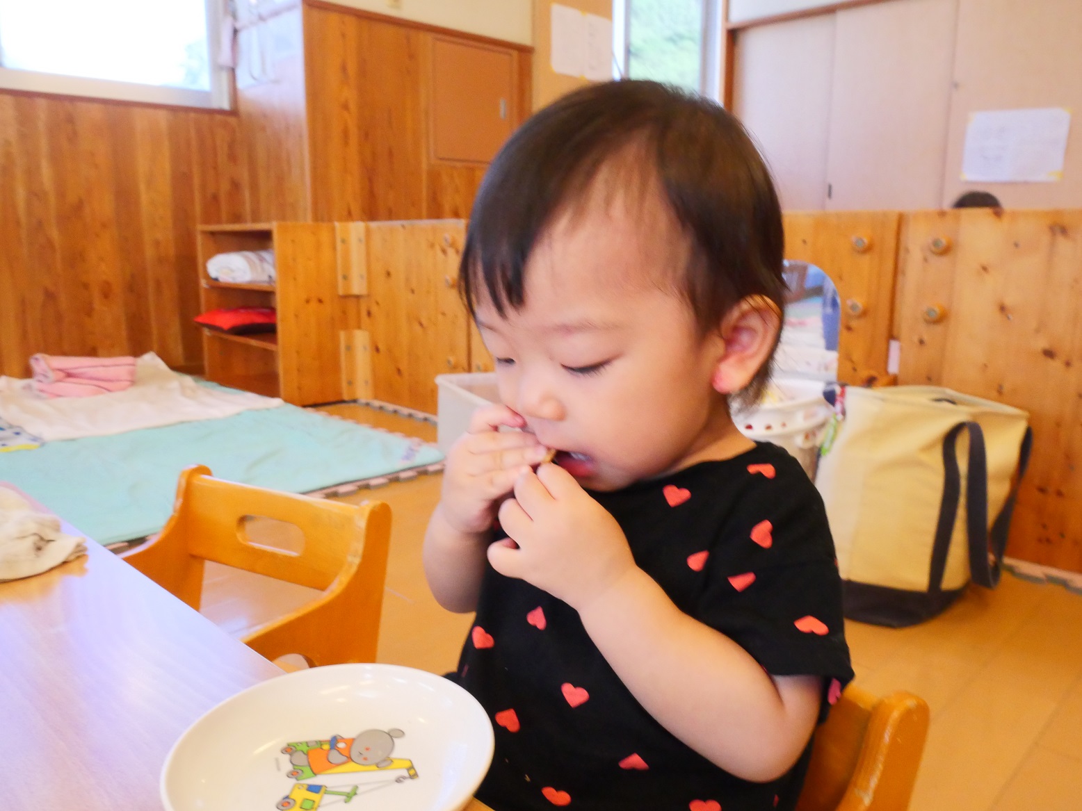 おやつの時間が大好きなひよこ組さん。 朝おやつに午睡明けのおやつ、どちらも待ち切れず、少し涙が出てしまうことも…。 名前を呼ばれると、嬉しそうに椅子に座って、消毒をします。 それが終わったら待ちに待ったおやつです。 大きく口を開けて、パクッ! おいしすぎてつい笑顔がこぼれる子どもたち。 これからも楽しいおやつの時間を過ごせたらと思います。