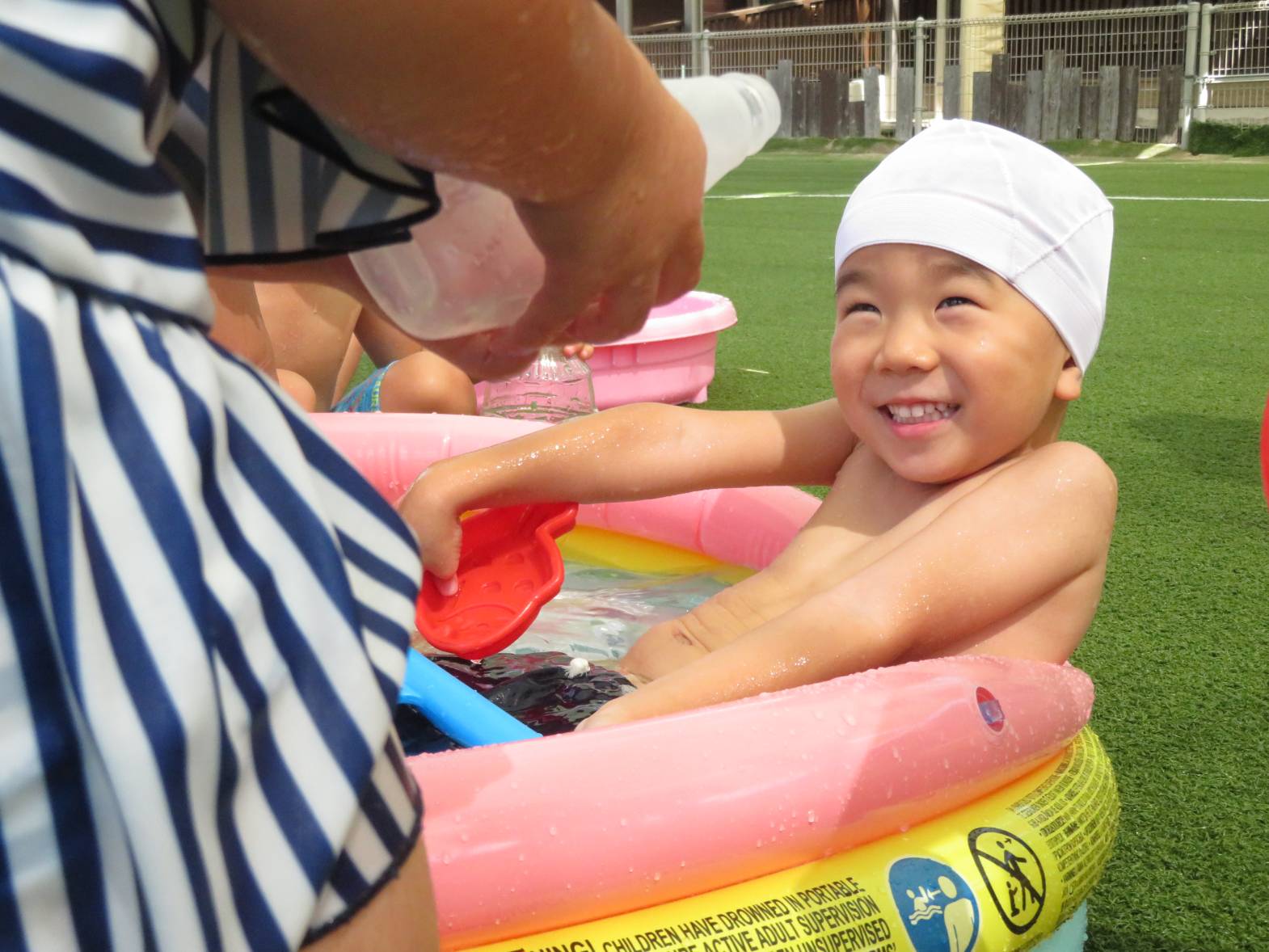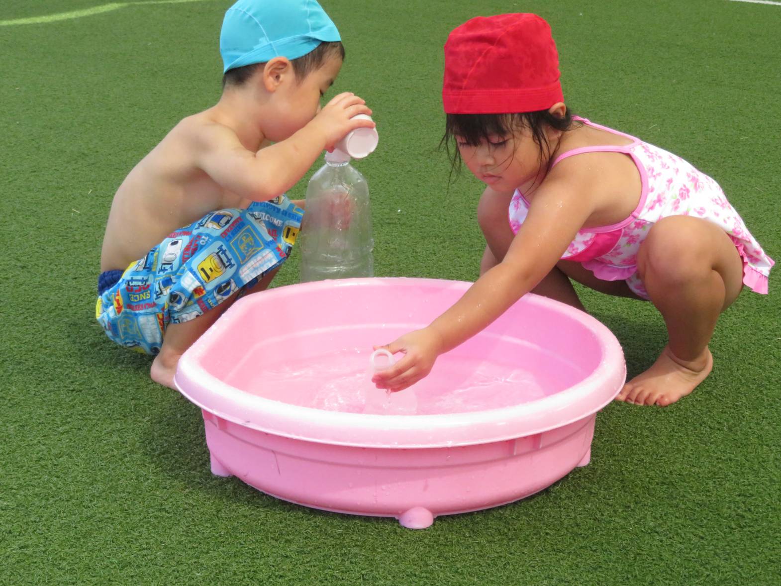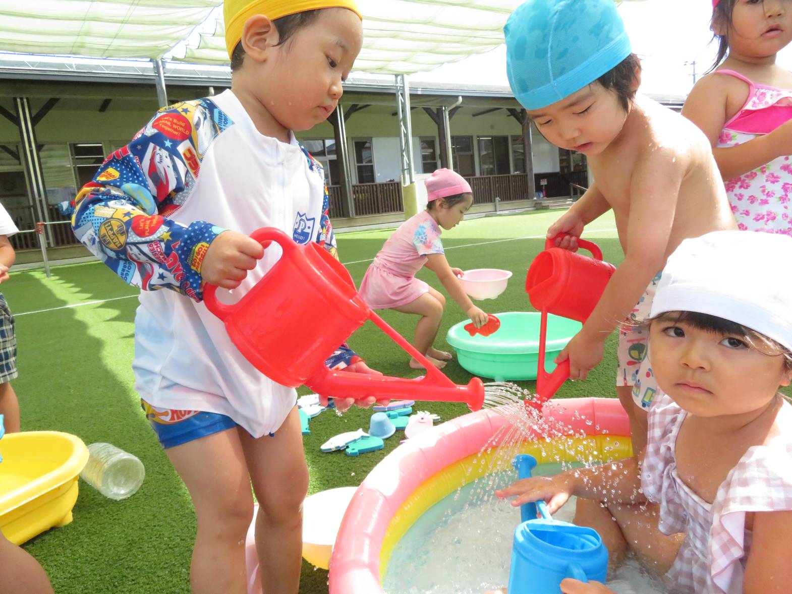 水遊びが大好きな子どもたち! 水の感触を楽しんだり、プールに入って遊んだりと思い思いに楽しむ姿が見られます。 「冷たいね~!」、「気持ちいいね!」と会話を弾ませたり、いろいろな玩具を手に取り、友だちと水を掛け合って遊んだりするりす組さんでした♪ たくさん遊んだ後は笑顔いっぱいの子どもたちでしたよ! まだまだ夏の遊びを楽しんでいこうと思います。