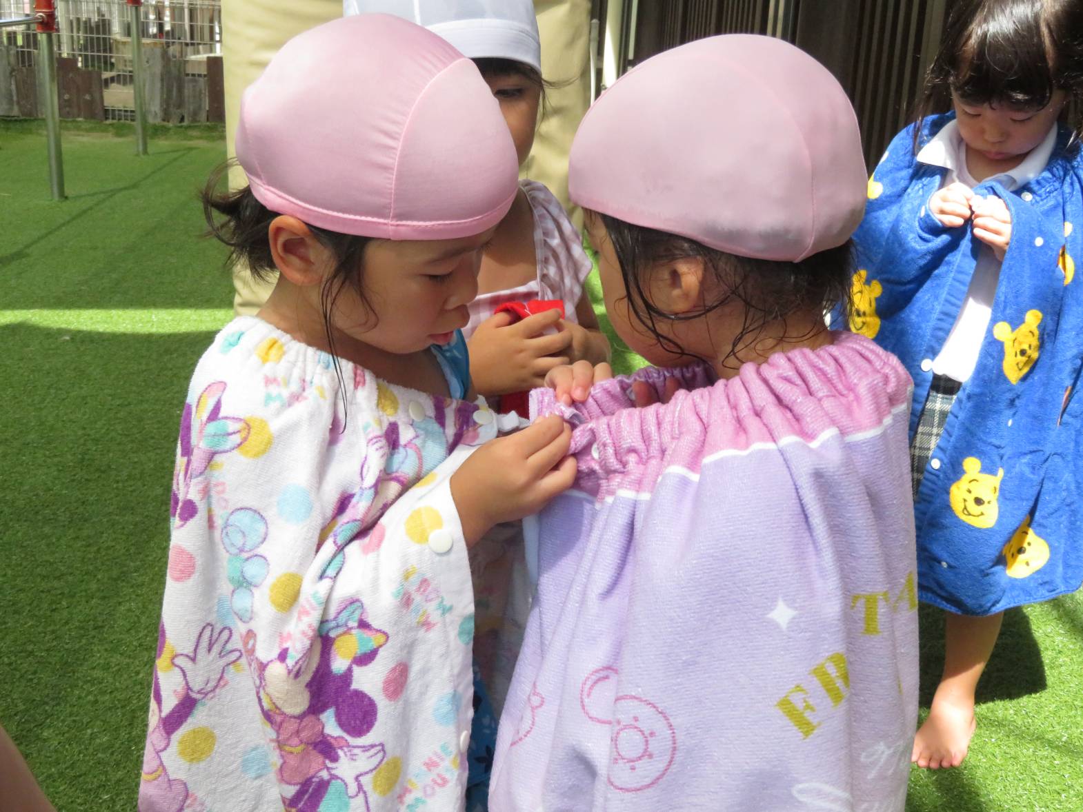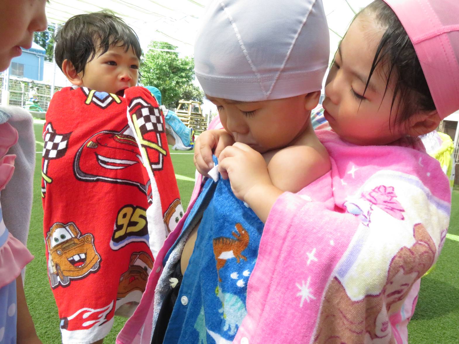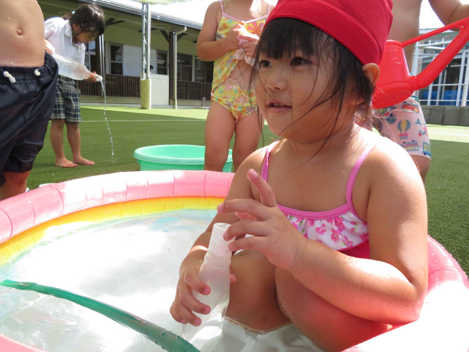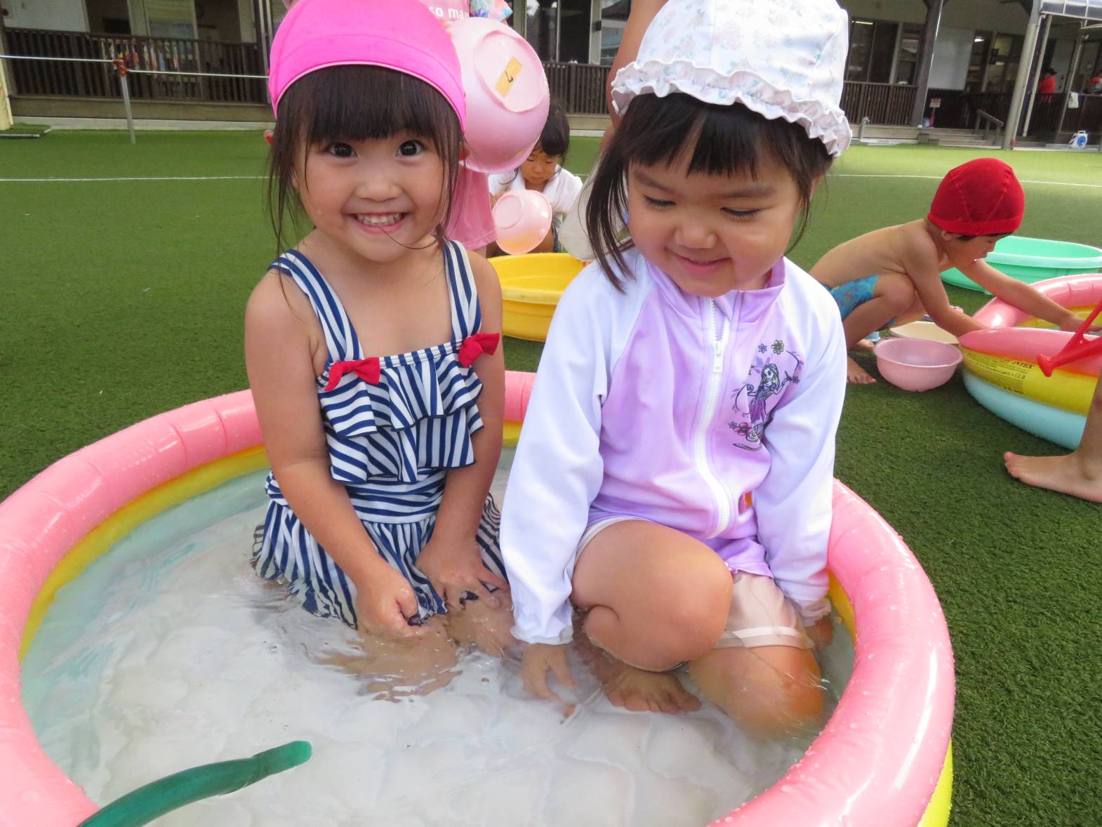 水遊びが大好きな子どもたち! 水の感触を楽しんだり、プールに入って遊んだりと思い思いに楽しむ姿が見られます。 「冷たいね~!」、「気持ちいいね!」と会話を弾ませたり、いろいろな玩具を手に取り、友だちと水を掛け合って遊んだりするりす組さんでした♪ たくさん遊んだ後は笑顔いっぱいの子どもたちでしたよ! まだまだ夏の遊びを楽しんでいこうと思います。