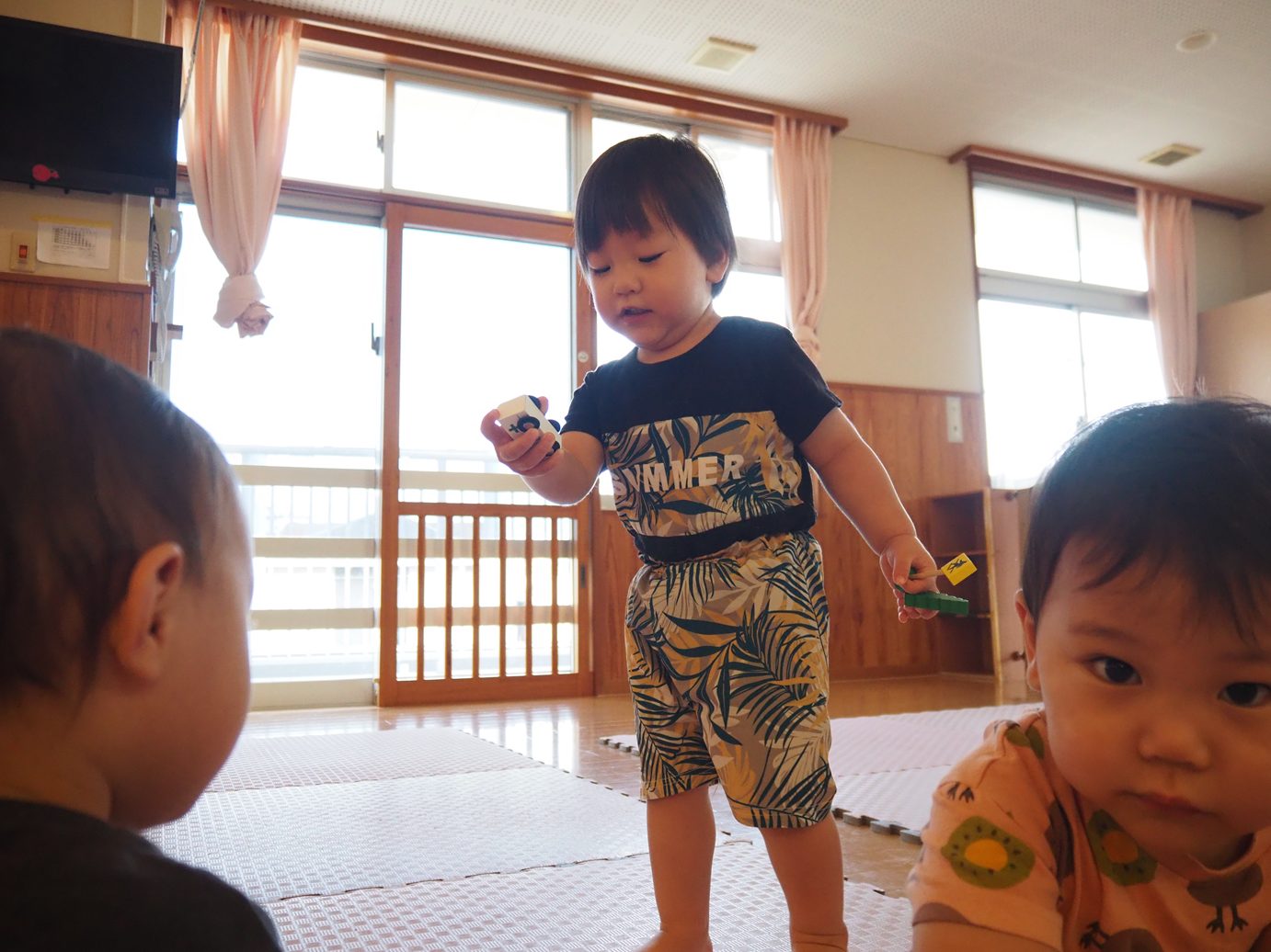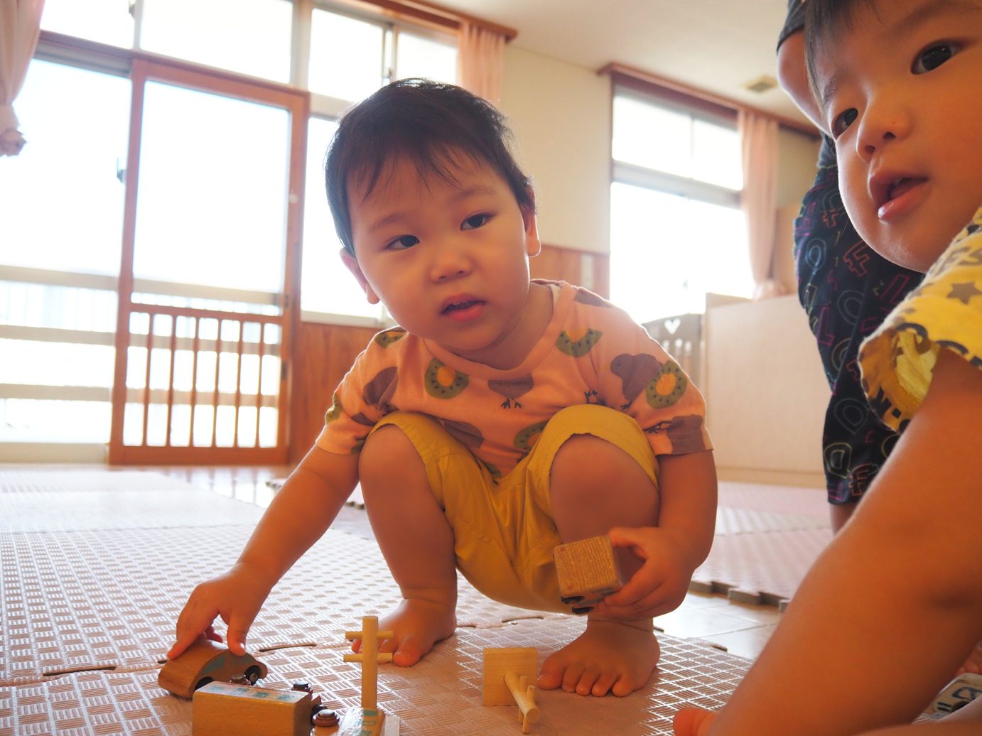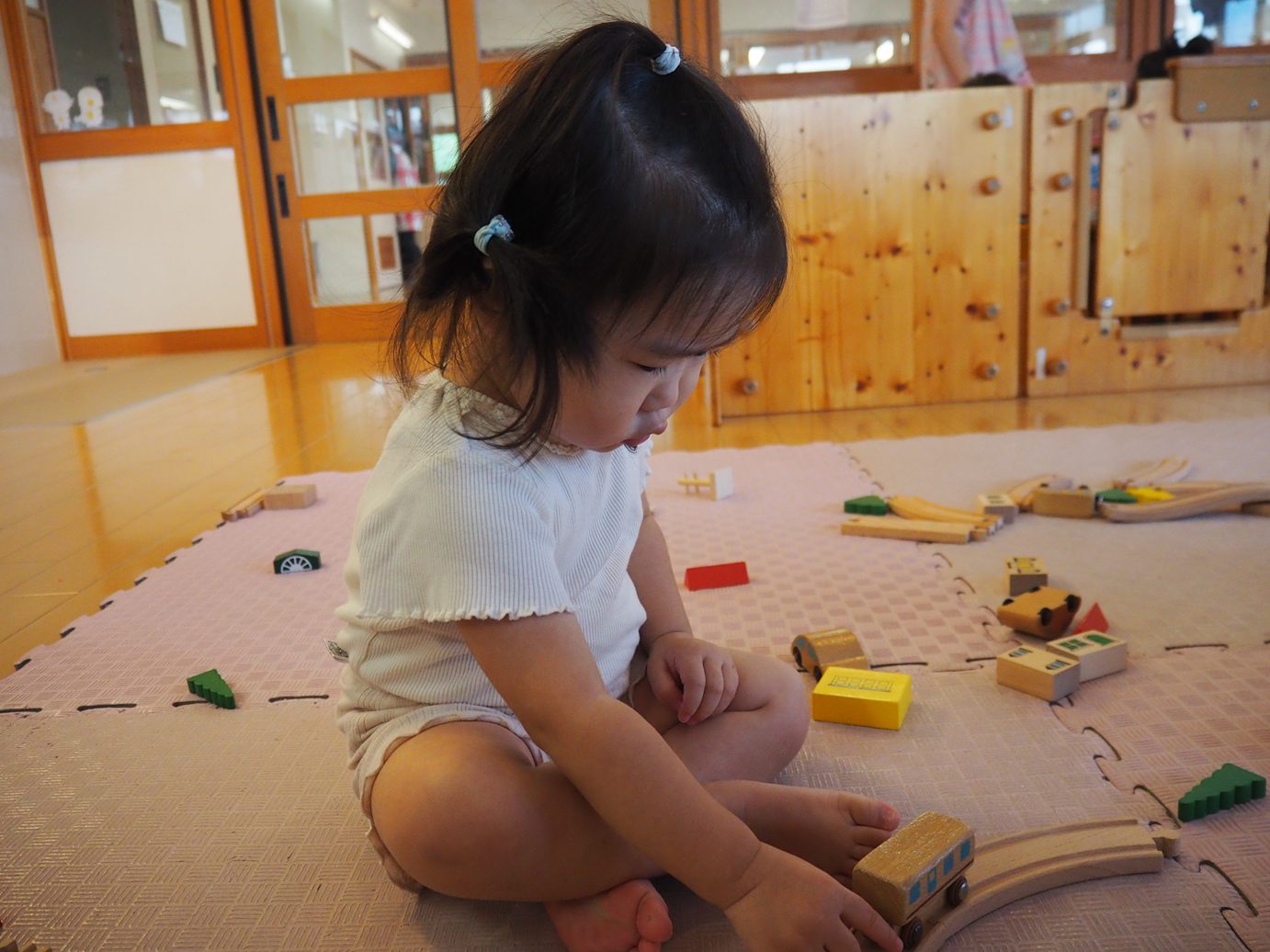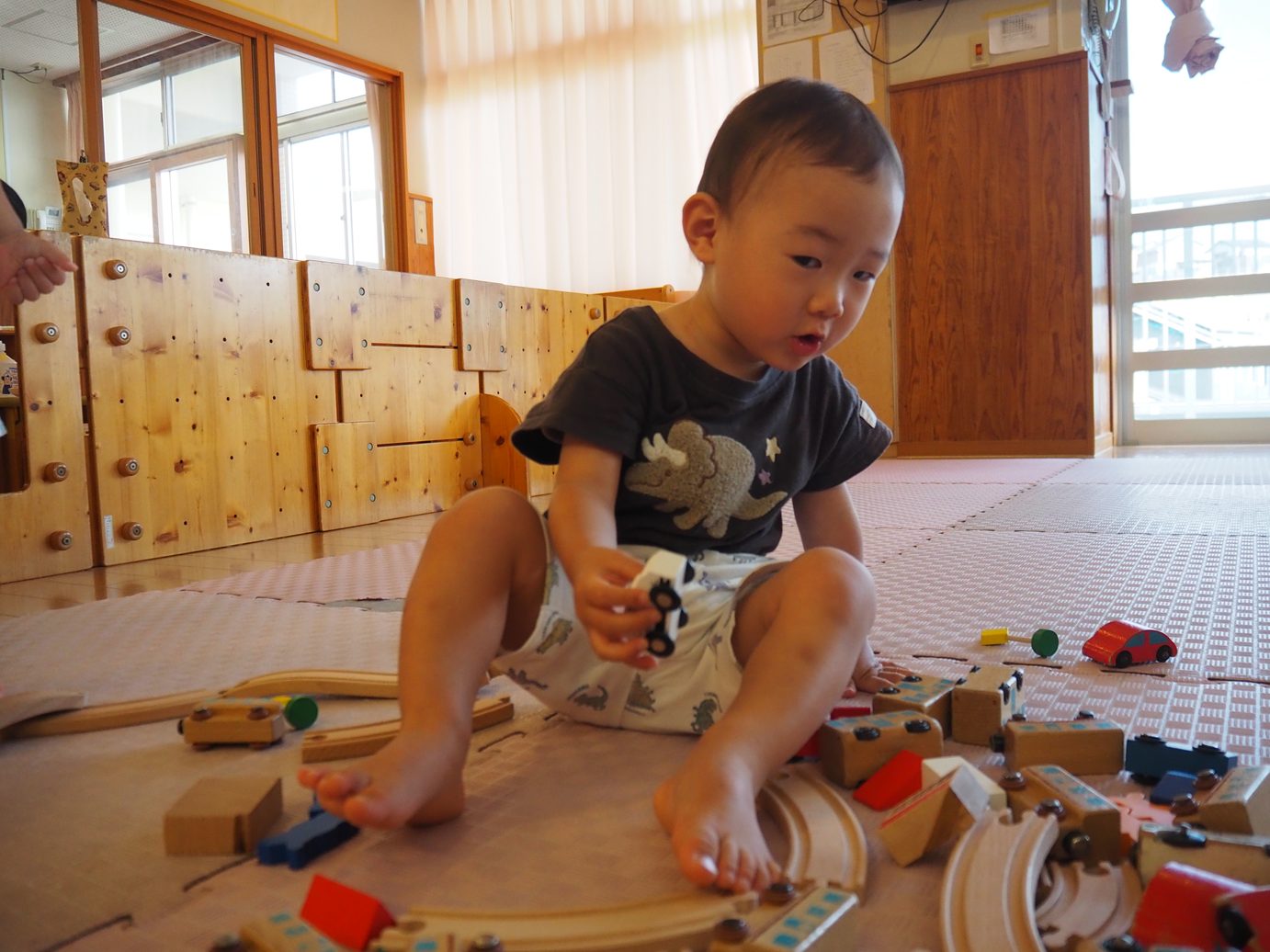 最近電車遊びを取り入れているこあら組さん。 初めのころは電車やバスなどを走らせて遊んでいた子どもたちですが、線路を繋げて見たり、坂を付けてみたりと遊びの幅が広がり、成長を感じることができました。 「てんてい!ばしゅ!(バス)」、「シュッシュッポッポー!」など言葉にすることもできるようになり、楽しむ姿が見られます。 みんなお気に入りの救急車やダンプカーなどを大事に持ち、お互いに自慢し合いながら遊ぶ子どもたちでした。