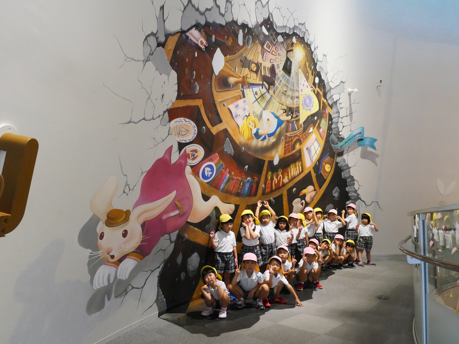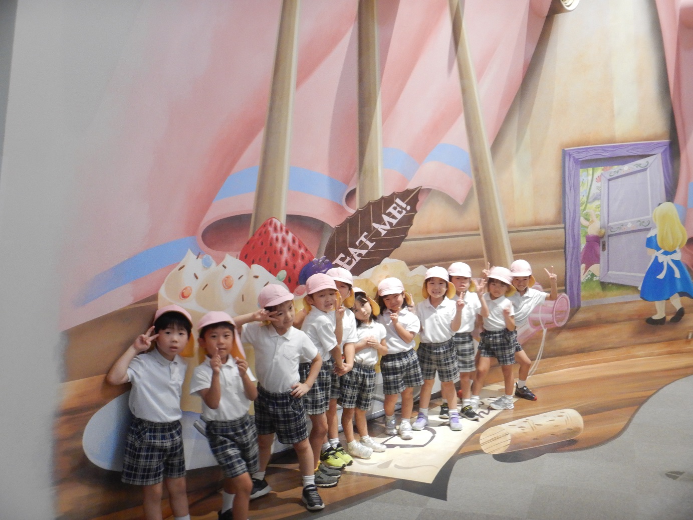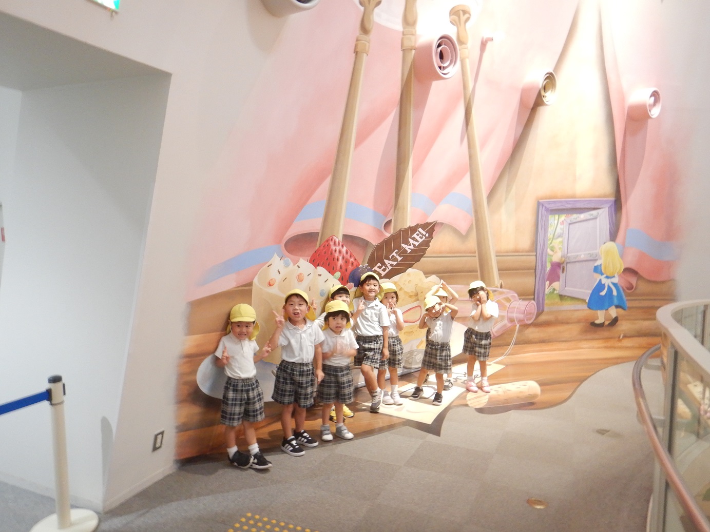 「ここで写真を撮ったら、どんな風になるのかな?」「この絵は、何で大きさが違うのかな?」と、トリックアートの不思議さを感じながら、みんなで写真撮影を行いました。
