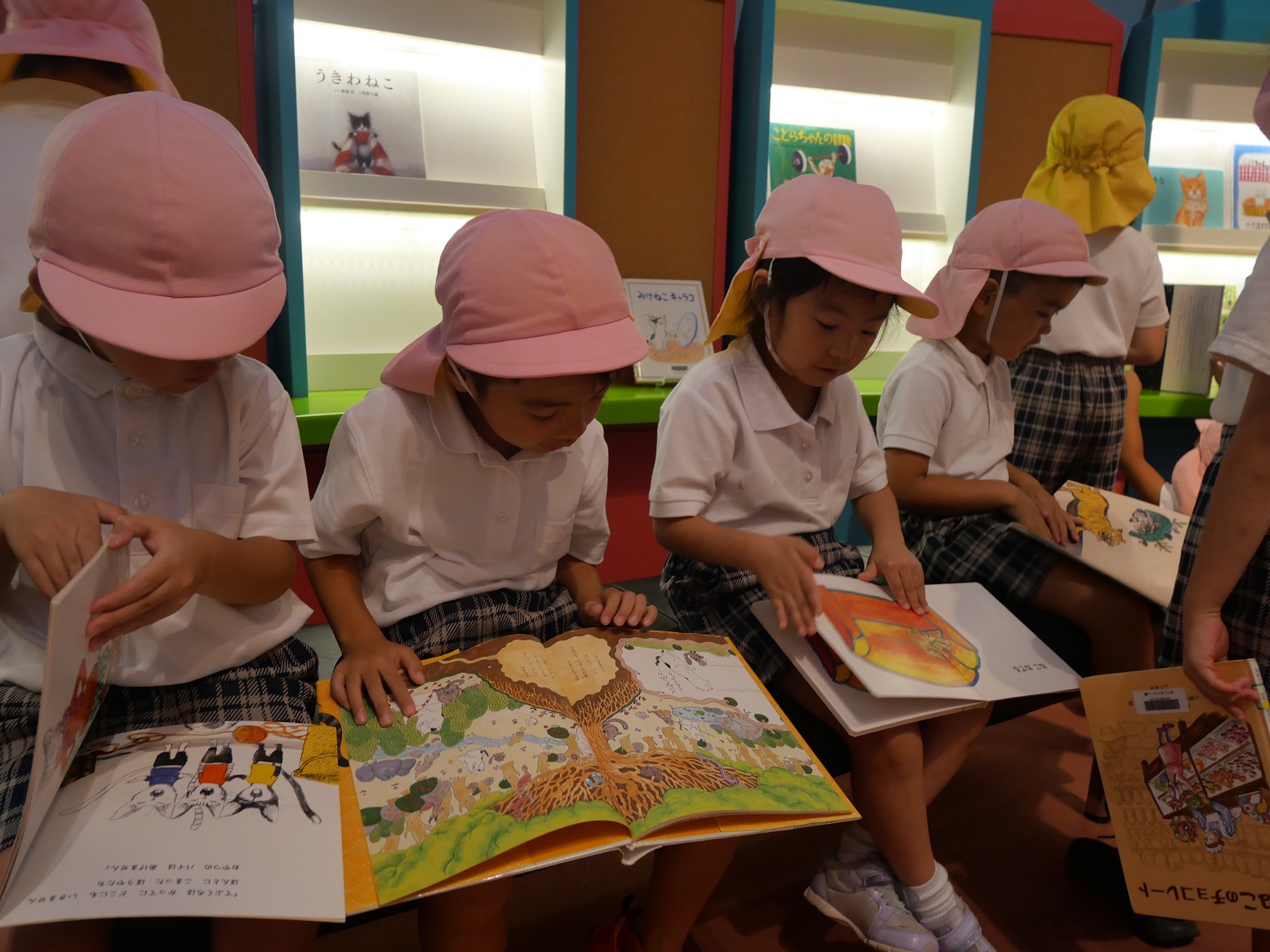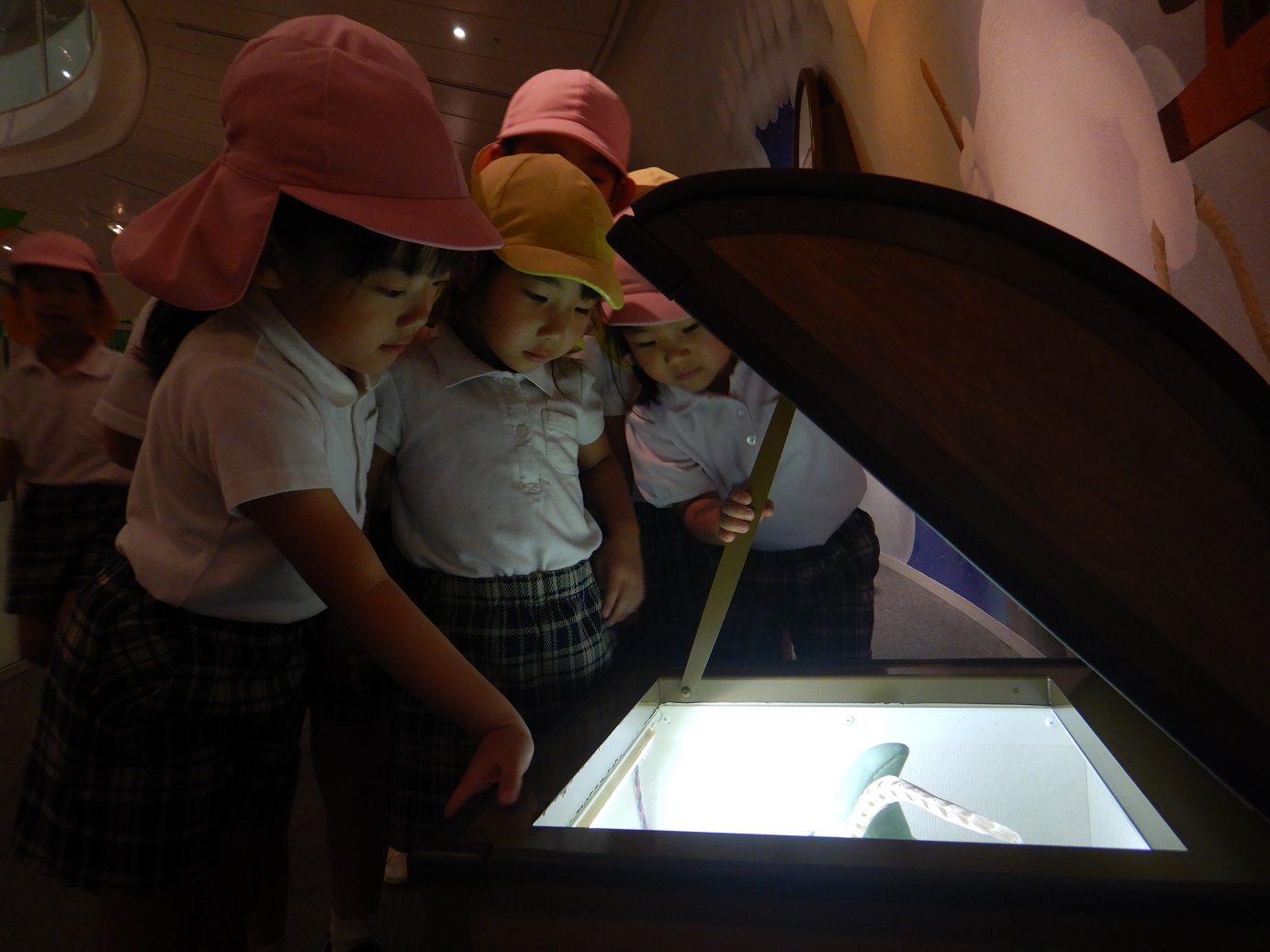 メルヘン館では、みんなで絵本を読んだり、絵本の中に出てくるキャラクターや道具を近くで見たりします。