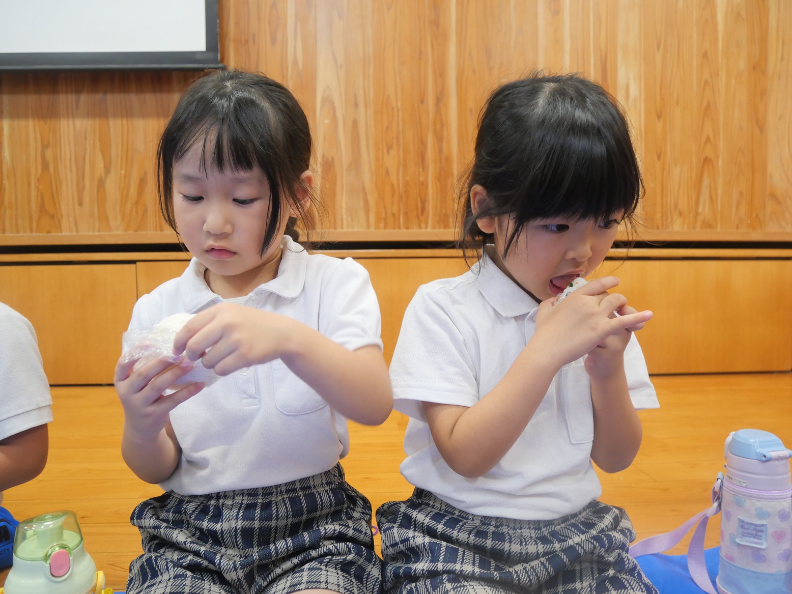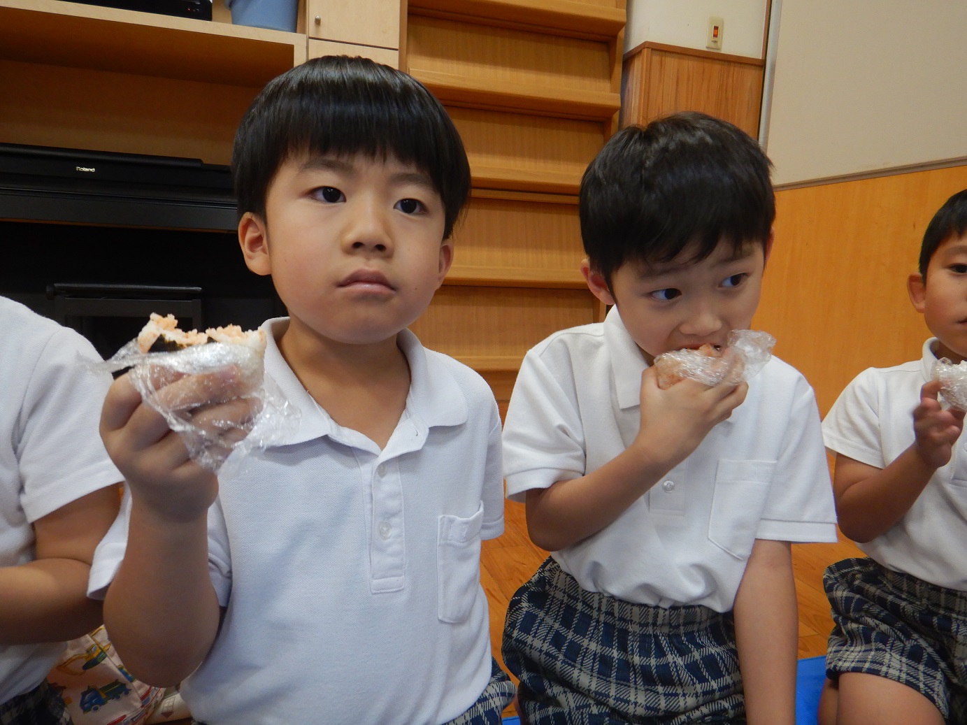 「おむすび、美味しい!」「たくさんあったけど、もう食べ終わっちゃった。」と、パクパク食べ進めていました。