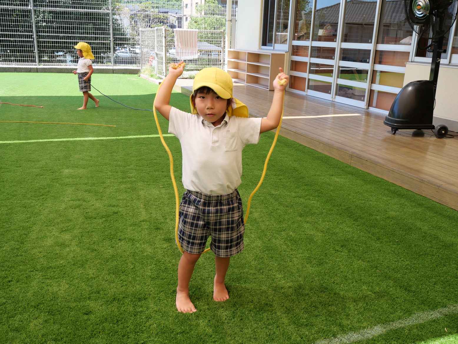 「待てー!」と友だちと追いかけっこをしたり、縄跳びを使ったジャンケン列車を行ったりしていました。
