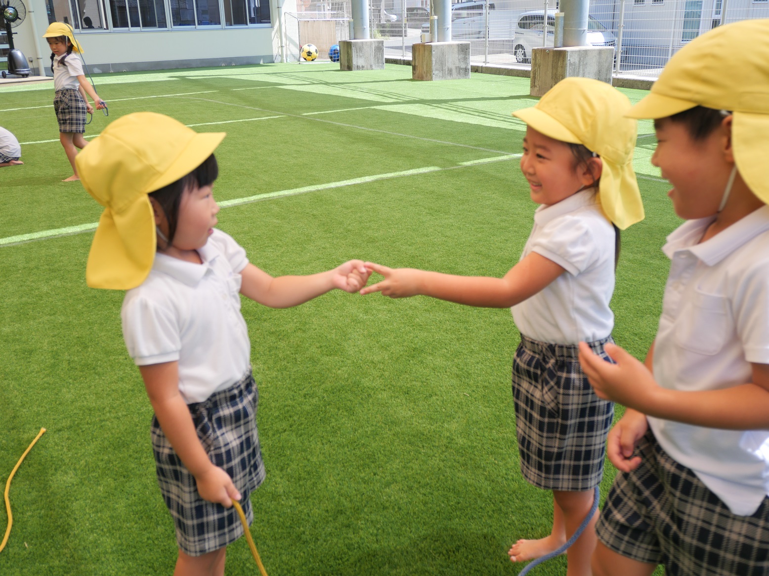 縄跳びを出してみると「縄跳びだー、やった。」「私跳べるよ!」と、一目散に縄跳びの元に駆け寄る姿が見られました。