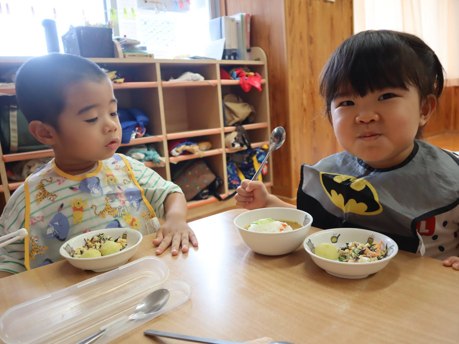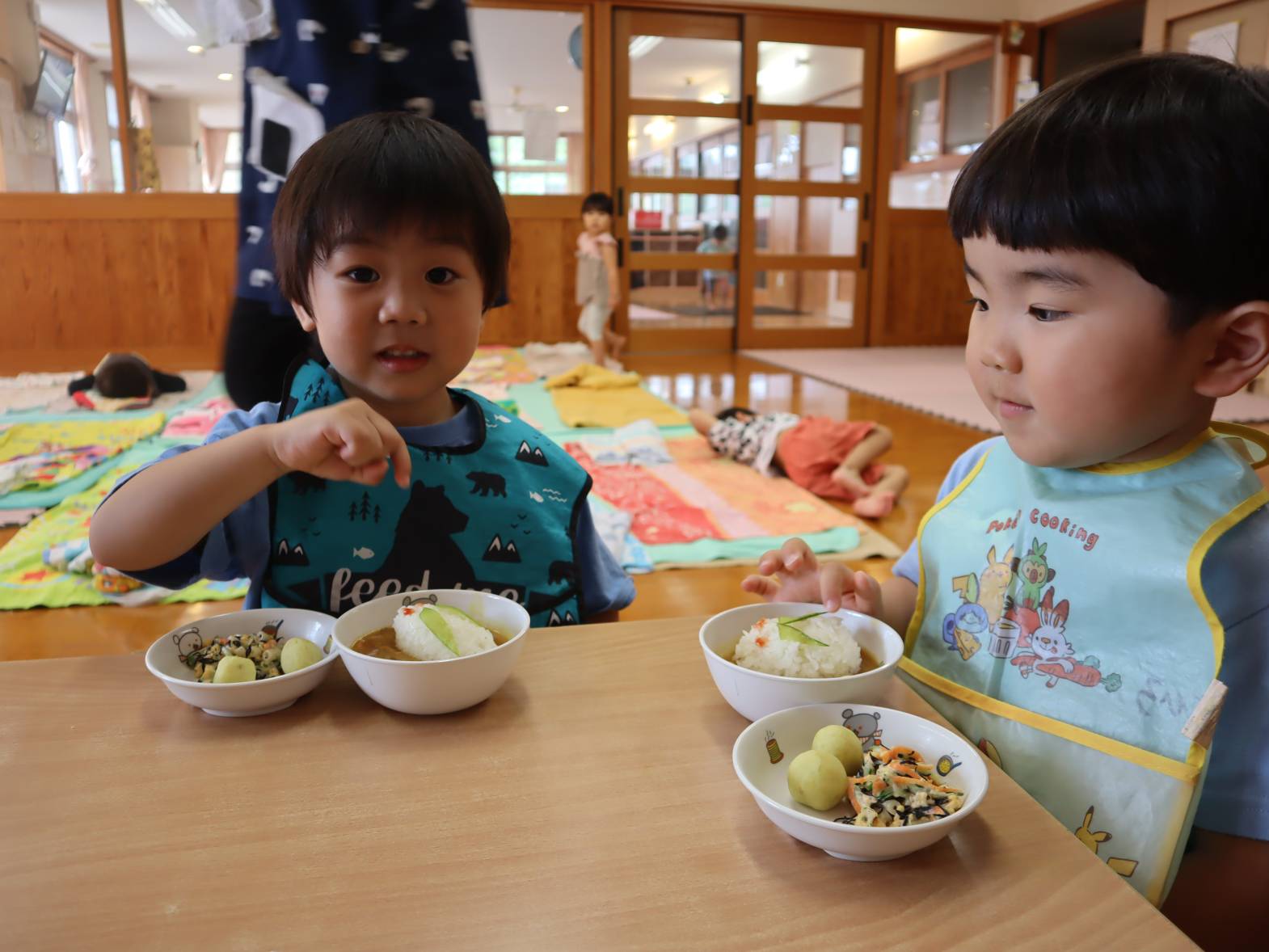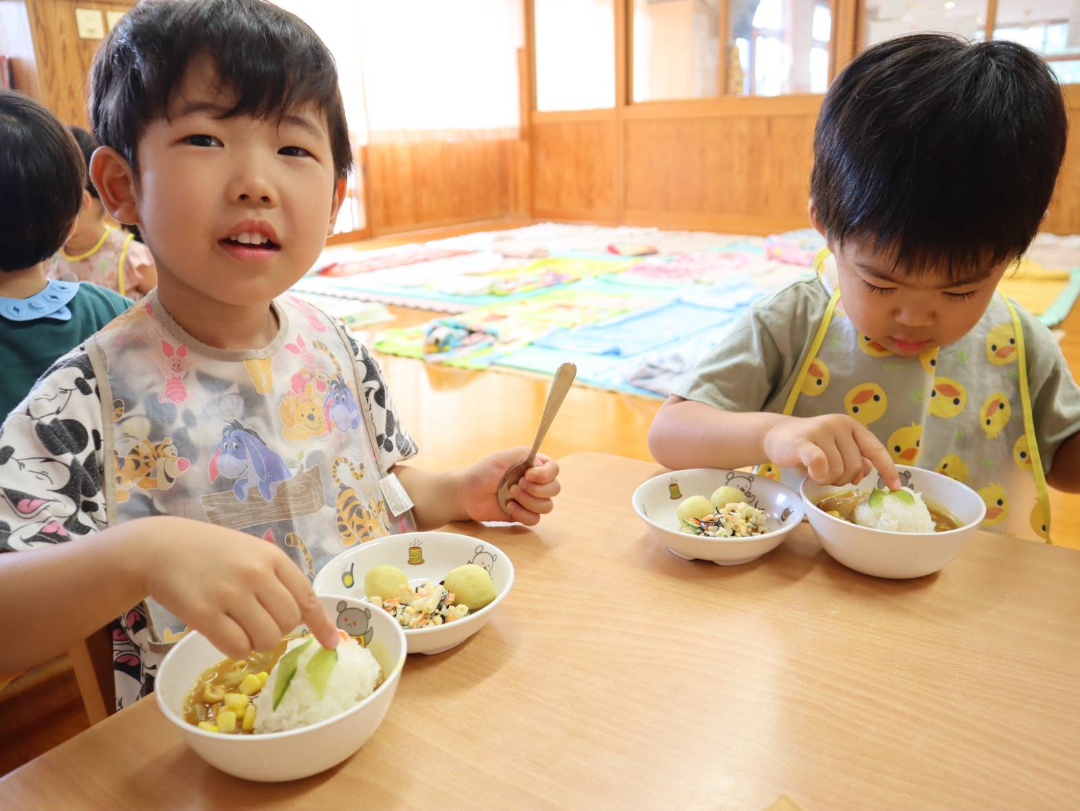 今日は毎月楽しみにしているわくわくメニューの日でした。 大好きなカレーにうさぎさんがのっていて嬉しそうな子どもたち。 先日みんなでおつきみ体験をしたことで、ポテトが丸い月のようになっていることにも気づく姿もありました。 「うさぎさん、かわいいね。」「お月さまみたいだね。」と友だちとの会話も弾みます。 またご家庭でも感想を聞かれてみてください。